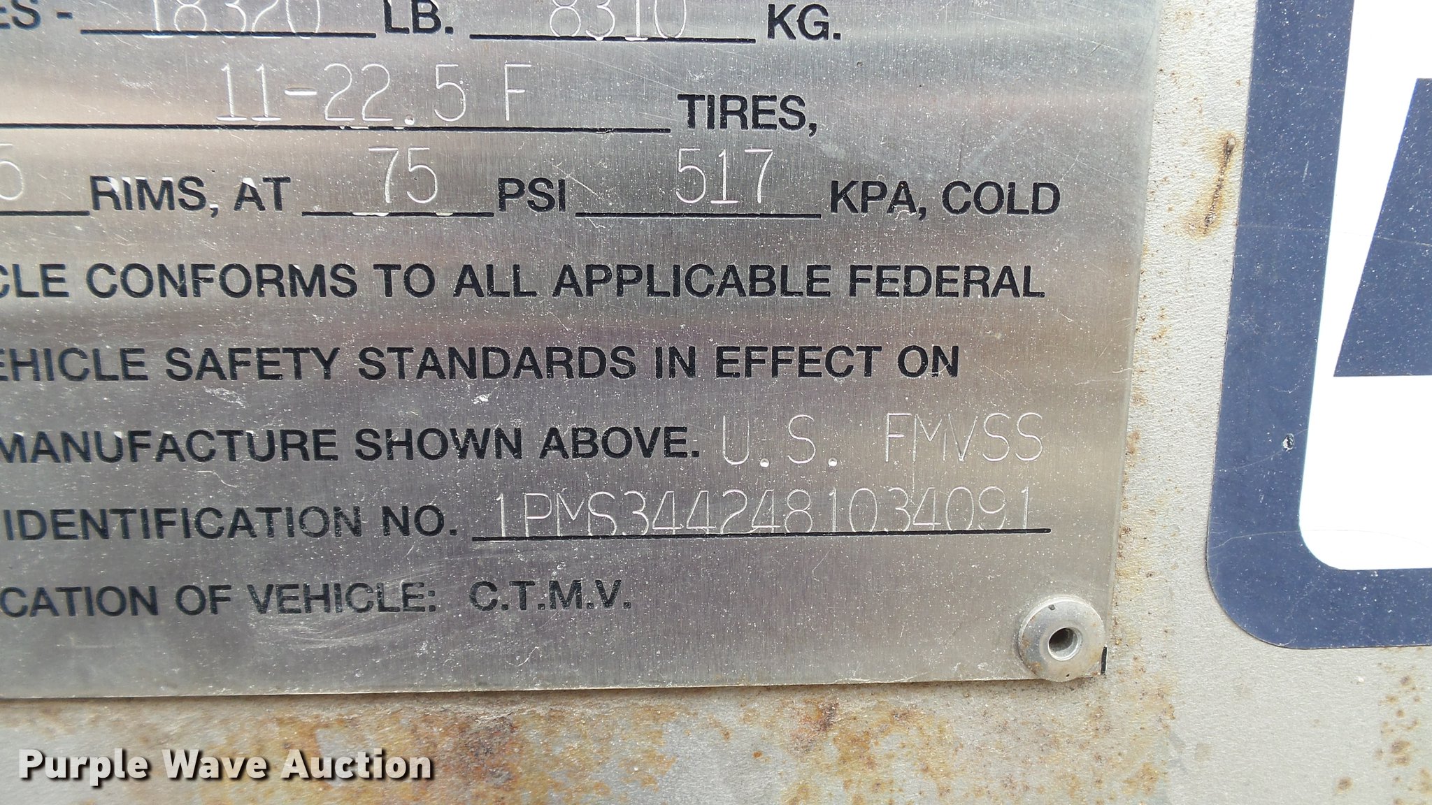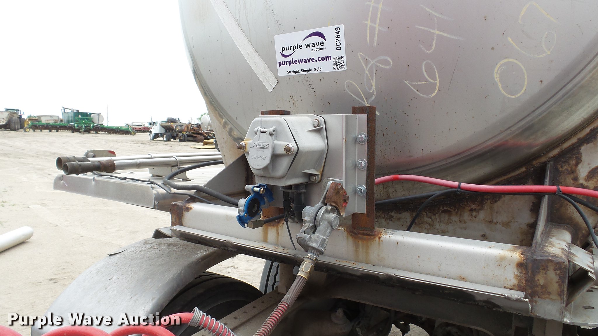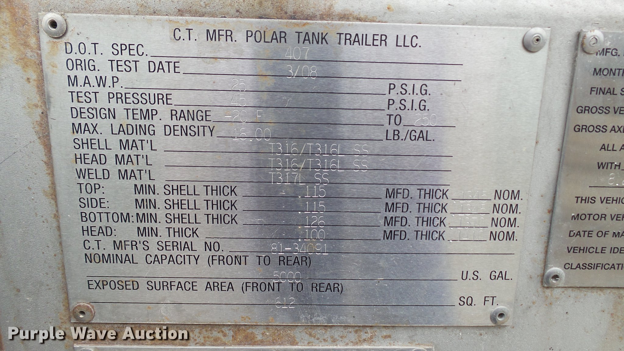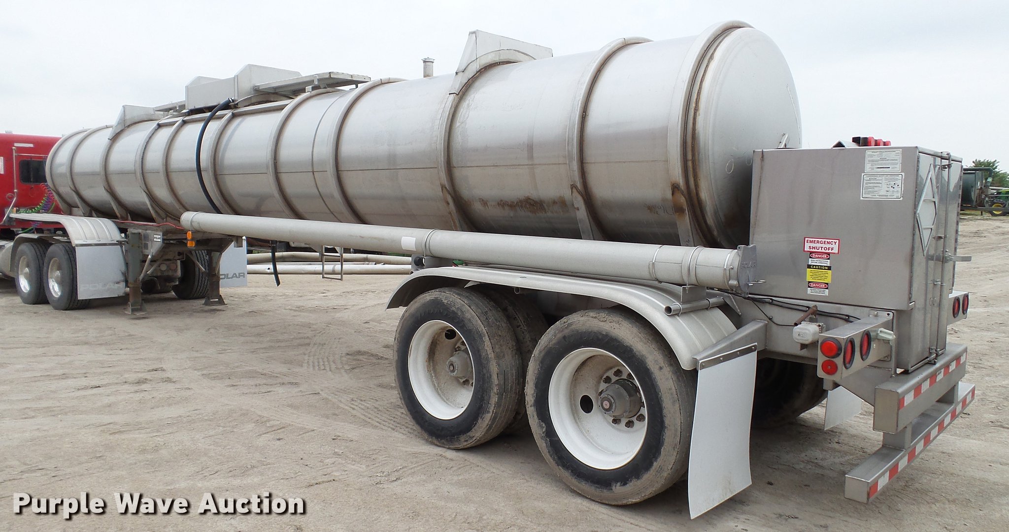Purple Wave is selling a used Tank Trailer in Illinois. This item is a 2008 Polar tank trailer with the following: 43.5'L x 95"W, 5,000 gallon stainless steel tank, Manway/manhole, Pump, 3" outlet, Fifth wheel plate, Dual leg two speed landing gear, Air suspension, Air brakes, Tandem axle, Steel wheels, 285/75R24.5 tires, GVWR 66,000 lbs, GAWR 18,320 lbs