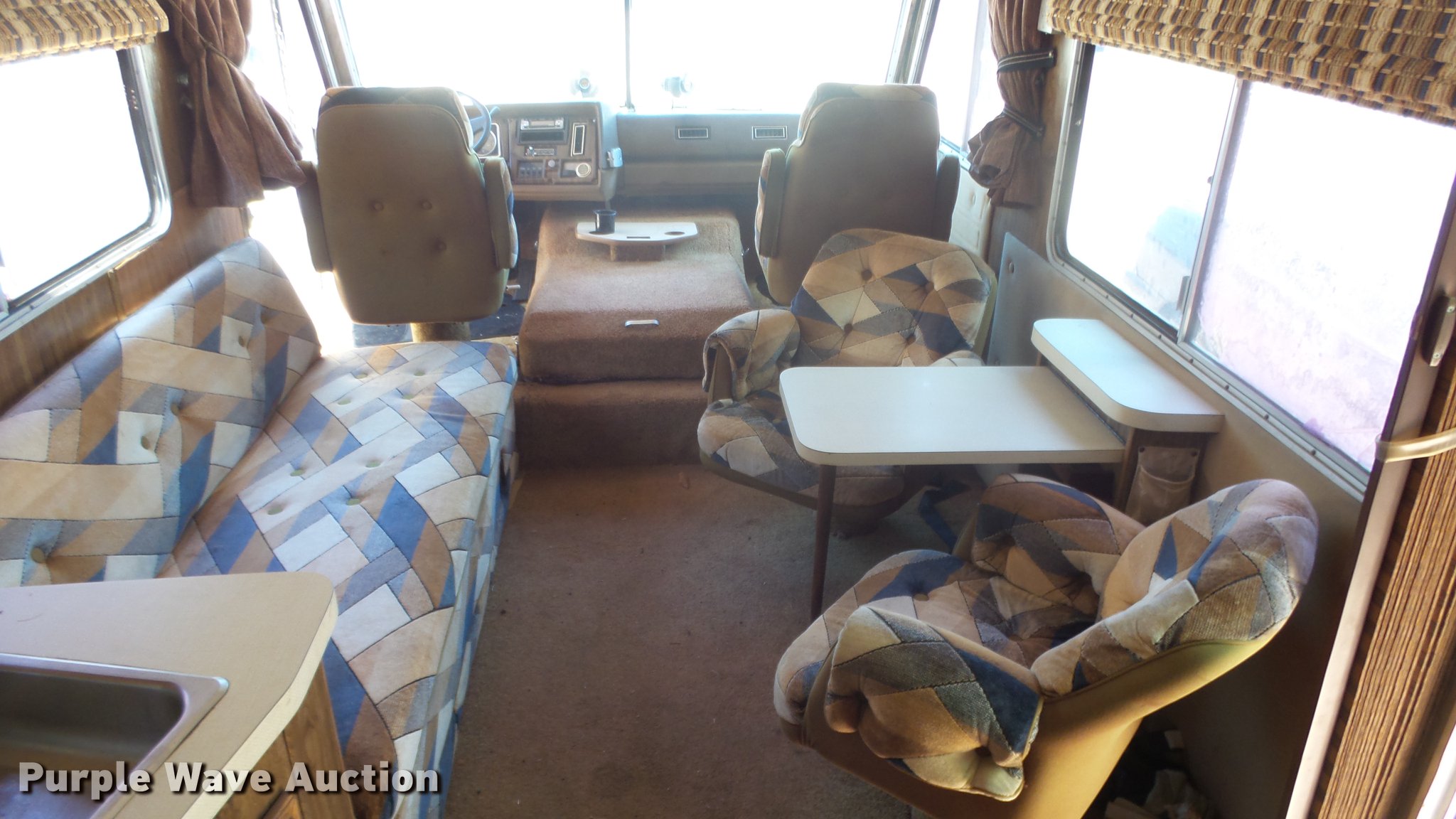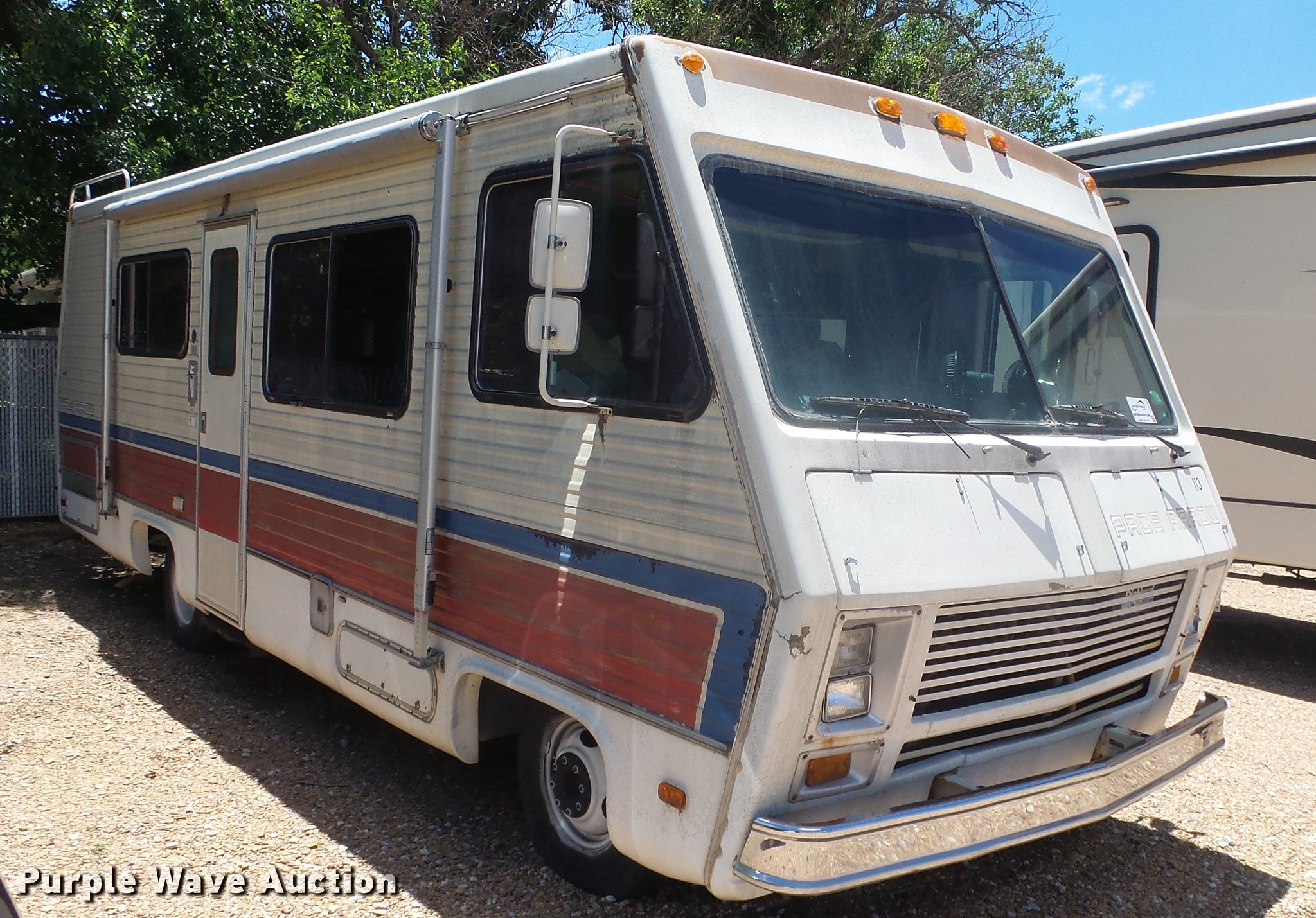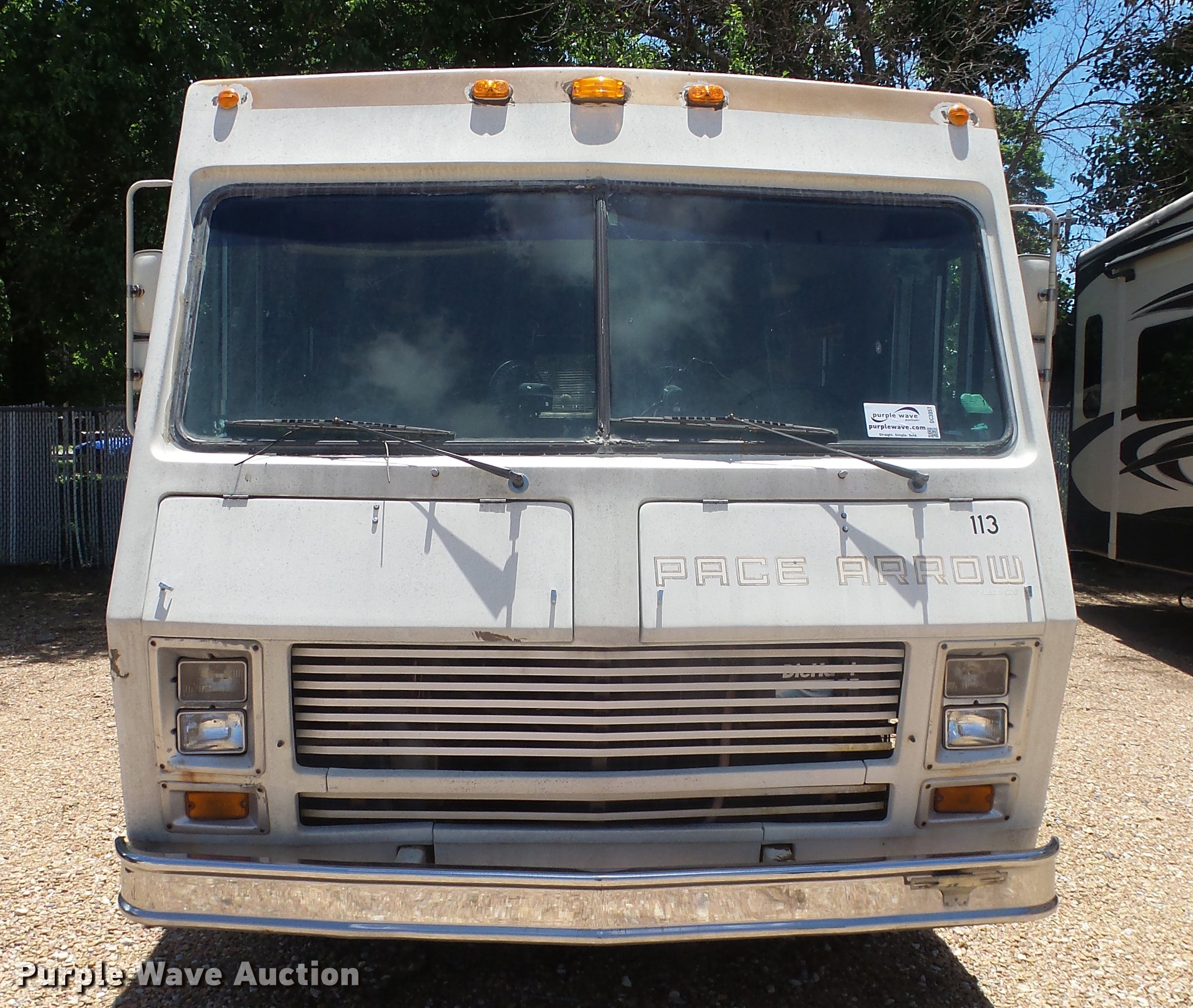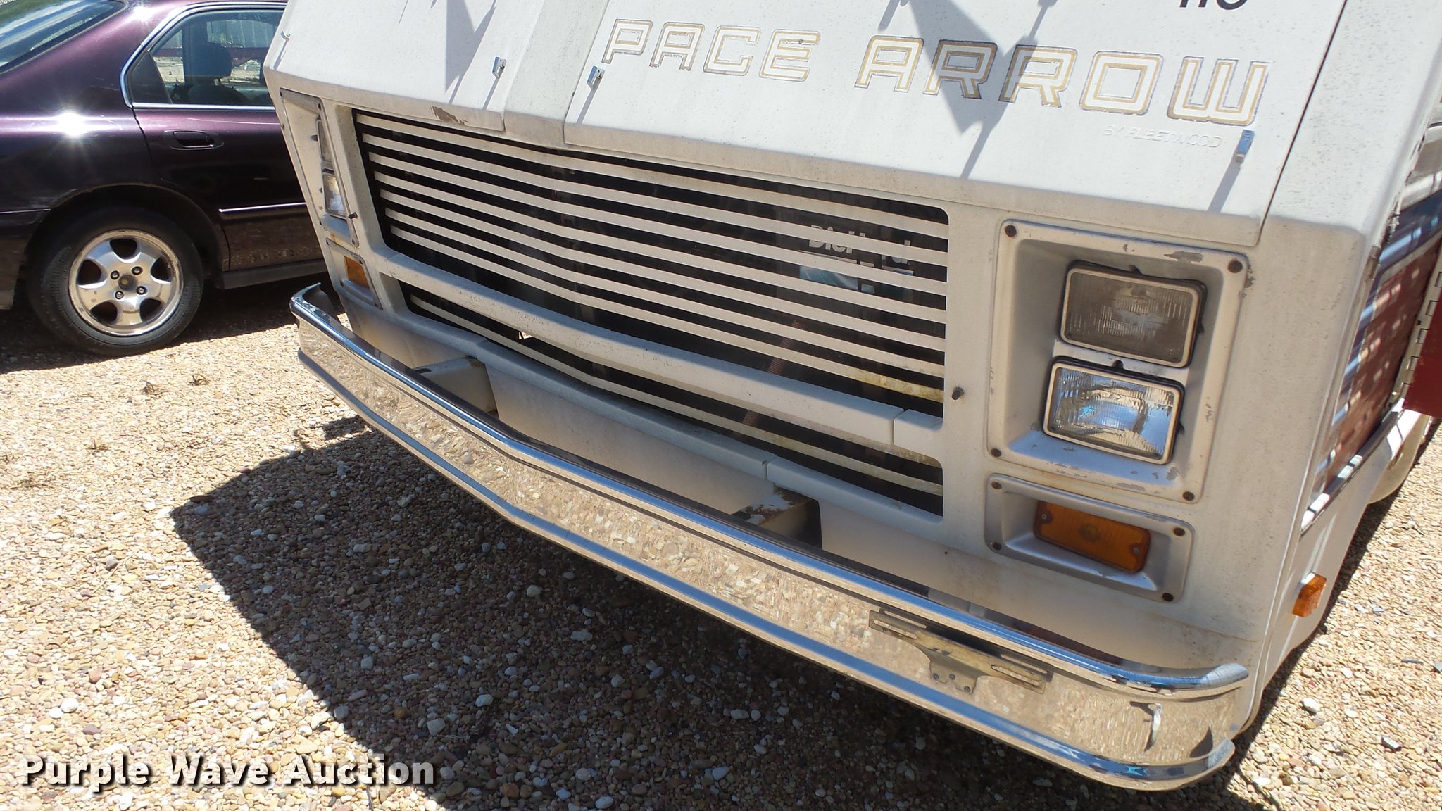 Purple Wave is selling a used RV in Kansas. This item is a 1981 Pace Arrow RV with the following: 73,684 miles on odometer, Eight cylinder gas engine, Automatic transmission, AC and heat, AM/FM/CD, Manual windows and locks, Approx. 20'L, Awning, Love seat, Table, Stow-away upper bunk, Sink, Stove/oven, Microwave, Lavatory, Refrigerator/freezer, Shower, Onan 4.0RV generator, 629 hours on meter, Gas engine, Propane heater, Receiver hitch, 235/85R16 tires, Unknown operating condition of water and sewer system, Engine issues, Engine knocks, Overheats, Possible spun bearing, Unit must be towed or hauled