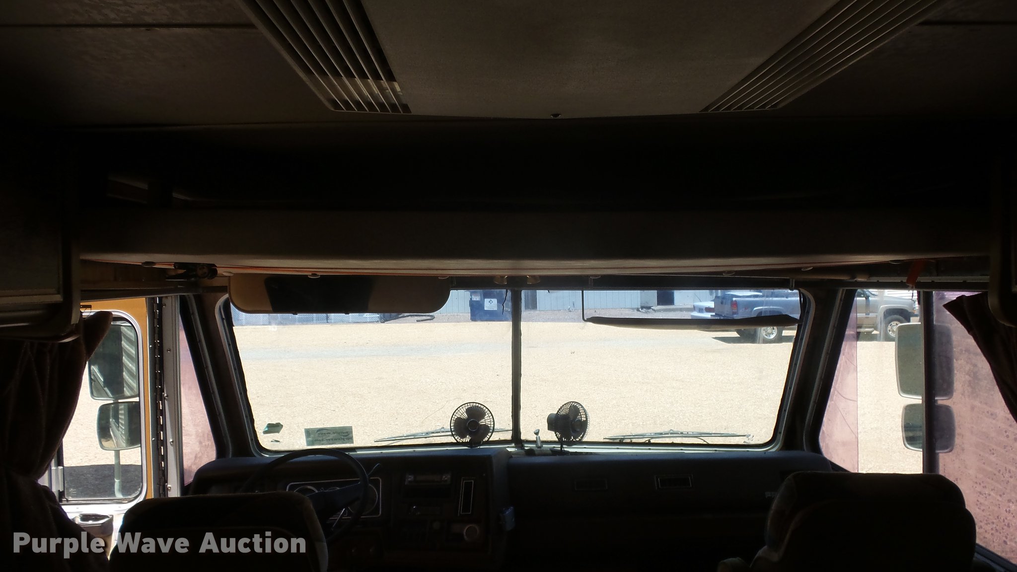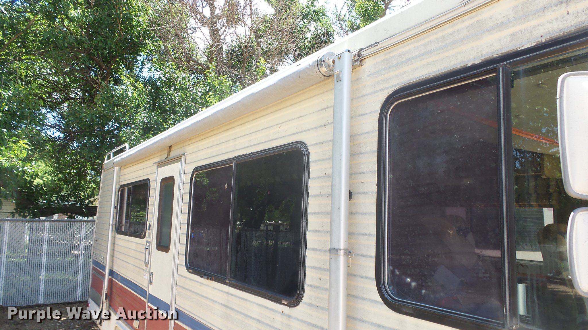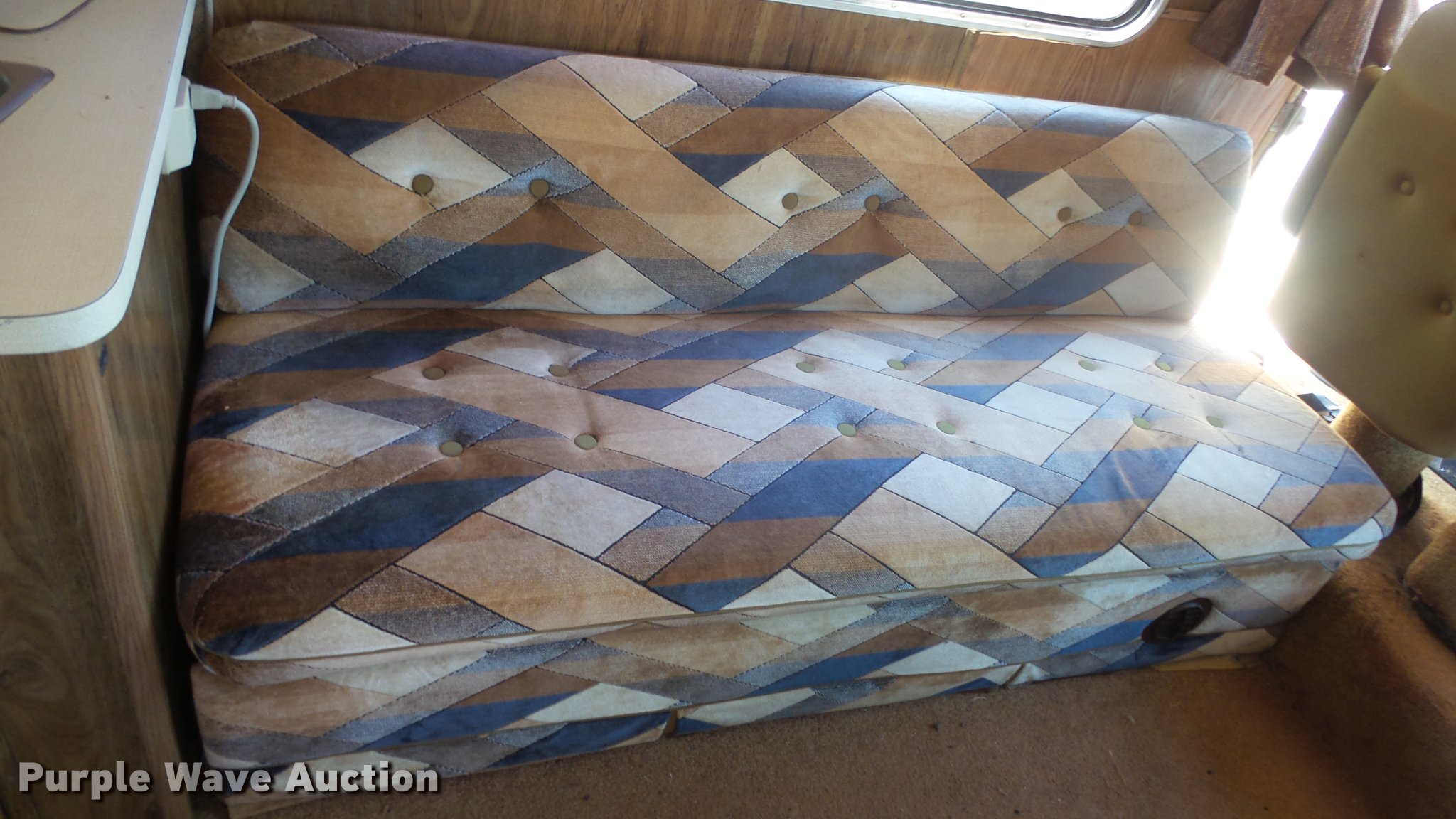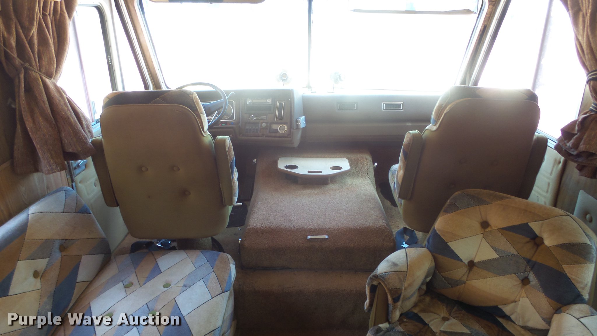 Purple Wave is selling a used RV in Kansas. This item is a 1981 Pace Arrow RV with the following: 73,684 miles on odometer, Eight cylinder gas engine, Automatic transmission, AC and heat, AM/FM/CD, Manual windows and locks, Approx. 20'L, Awning, Love seat, Table, Stow-away upper bunk, Sink, Stove/oven, Microwave, Lavatory, Refrigerator/freezer, Shower, Onan 4.0RV generator, 629 hours on meter, Gas engine, Propane heater, Receiver hitch, 235/85R16 tires, Unknown operating condition of water and sewer system, Engine issues, Engine knocks, Overheats, Possible spun bearing, Unit must be towed or hauled
