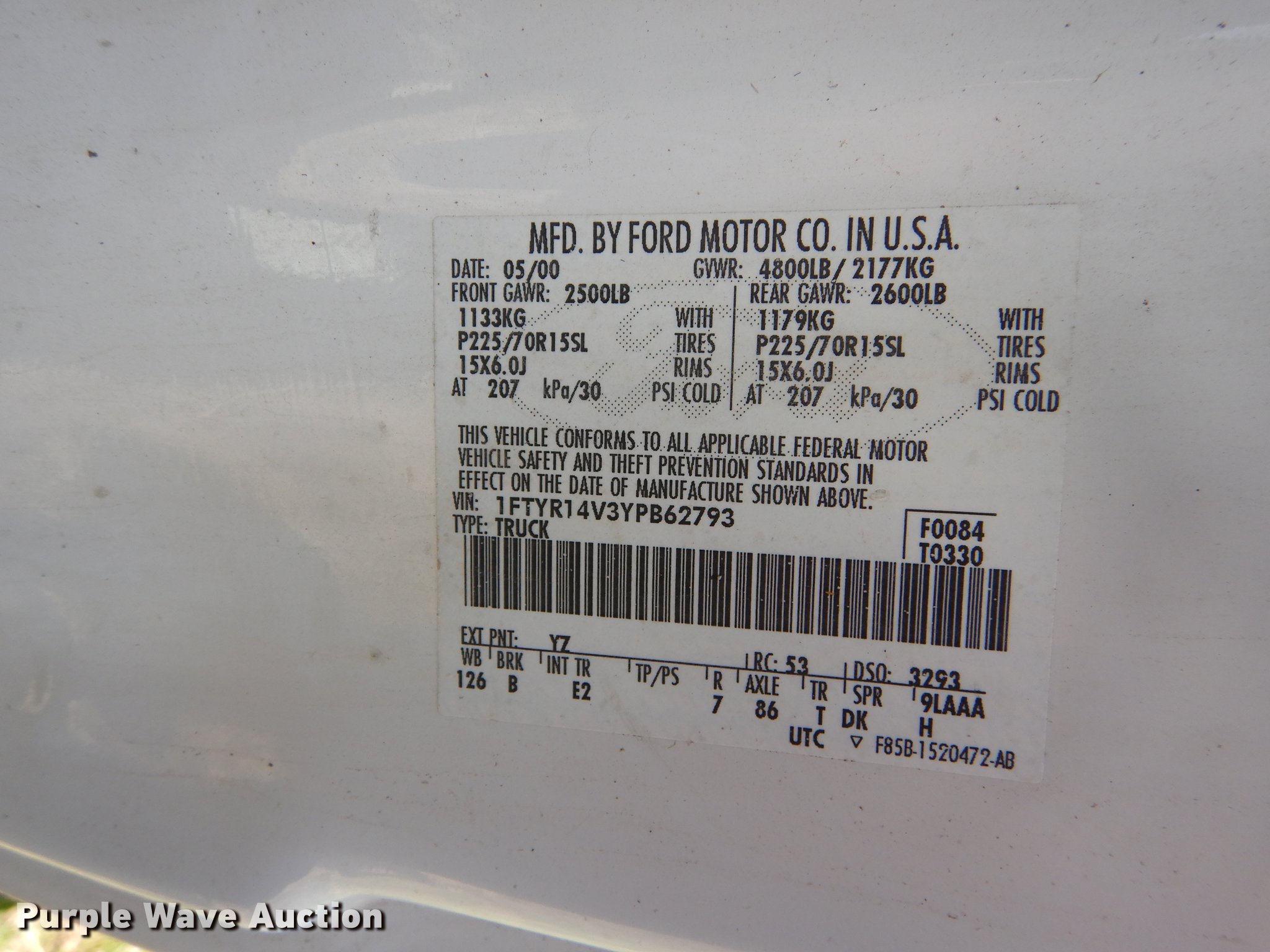 Purple Wave is selling a used Compact Pickup or Van in Kansas. This item is a 2000 Ford Ranger SuperCab pickup truck with the following: 129,519 miles on odometer, 3.0L V6 OHV 12V FFV gas engine, Automatic transmission, AC and heat, Tilt, AM/FM, Cloth interior, Uniroyal 215/70R14 tires, Unit# 320