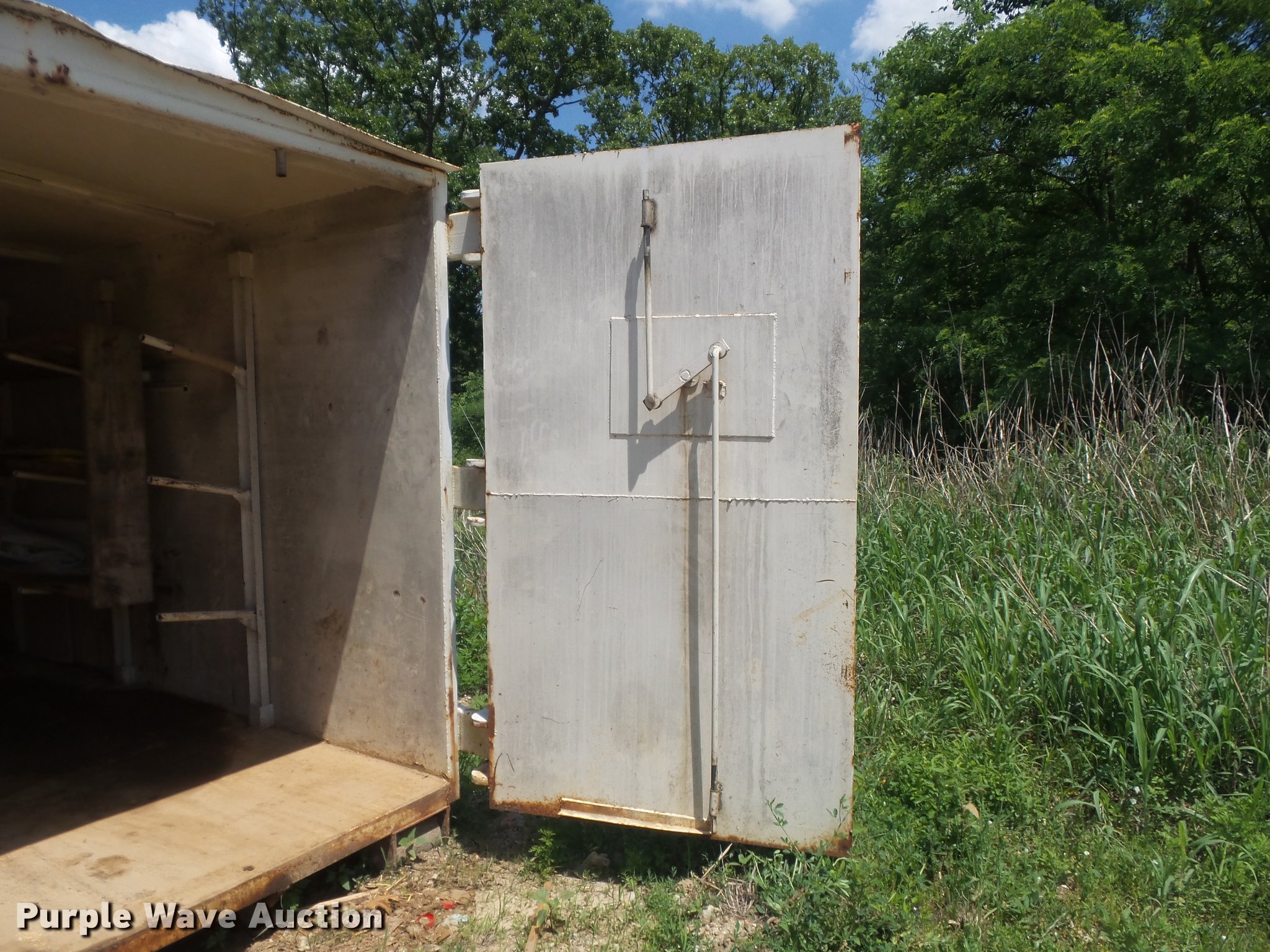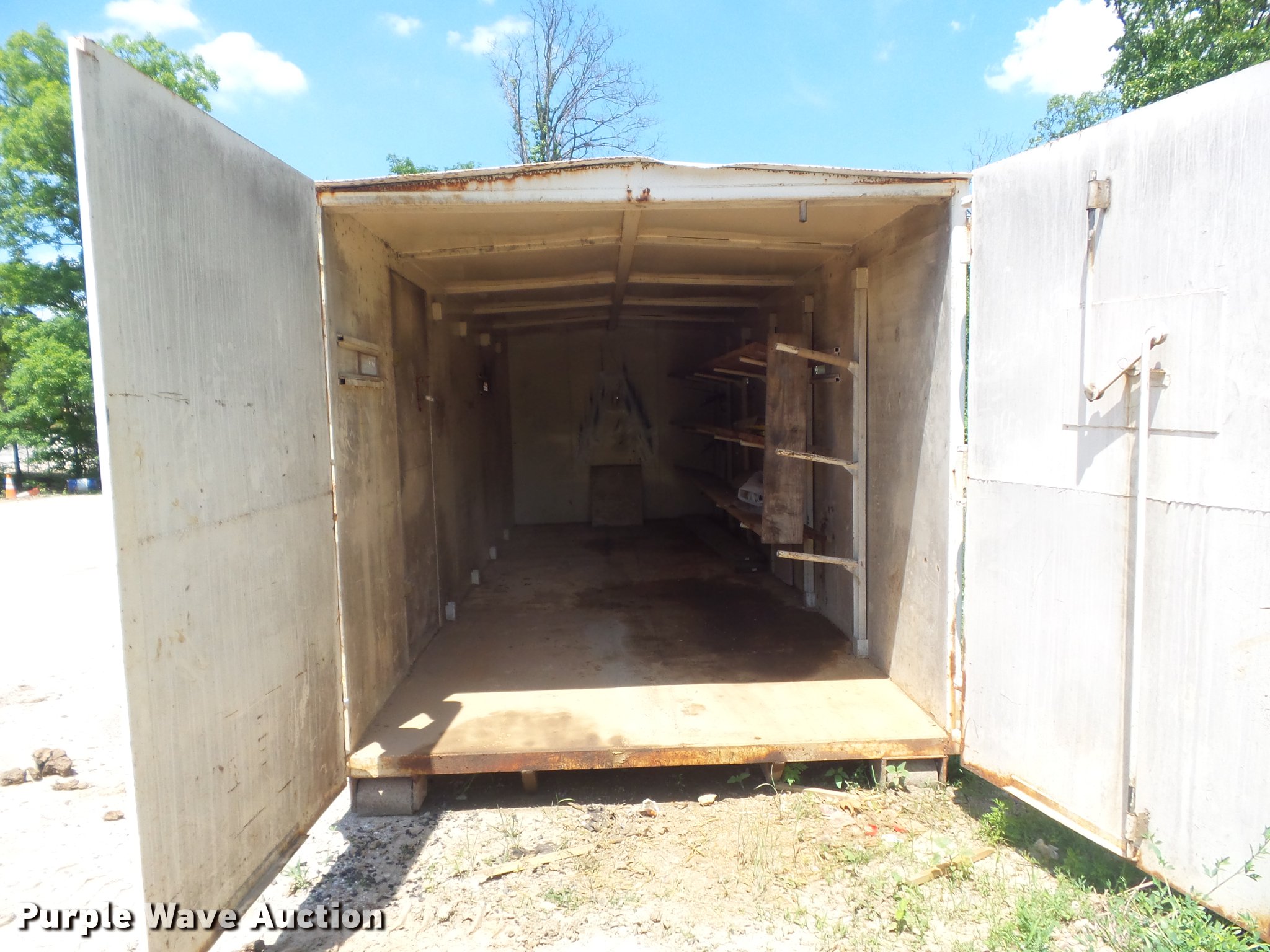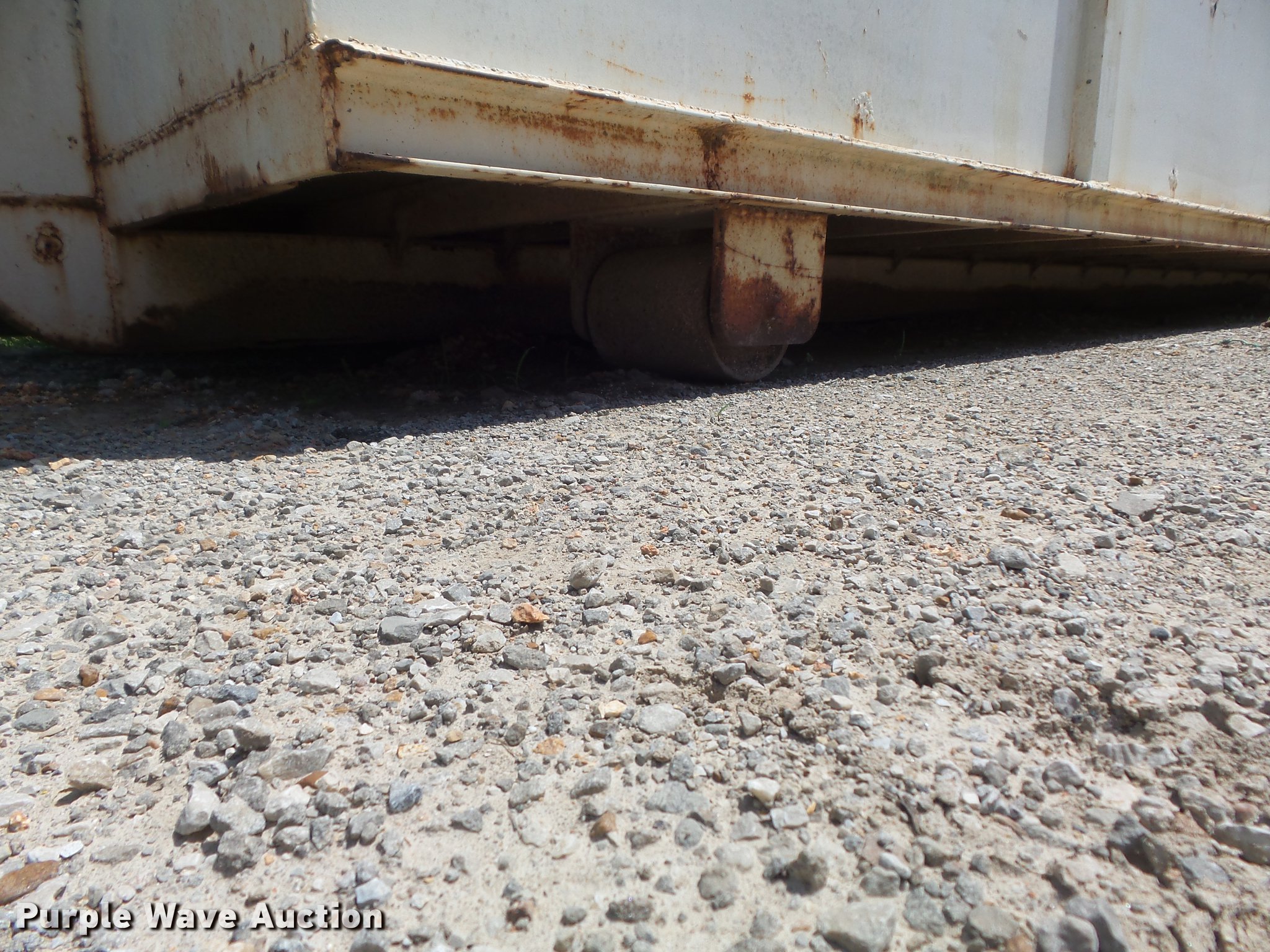 Purple Wave is selling a used Storage or Shipping Container in Missouri. This item is a Roll-off/hook lift steel storage container with the following: 280"L x 96"W x 103"H O.D., 262"L x 92"W x 82"H I.D., Removable shelving, Double swinging rear doors, Walk-through side side, Front and rear wheels