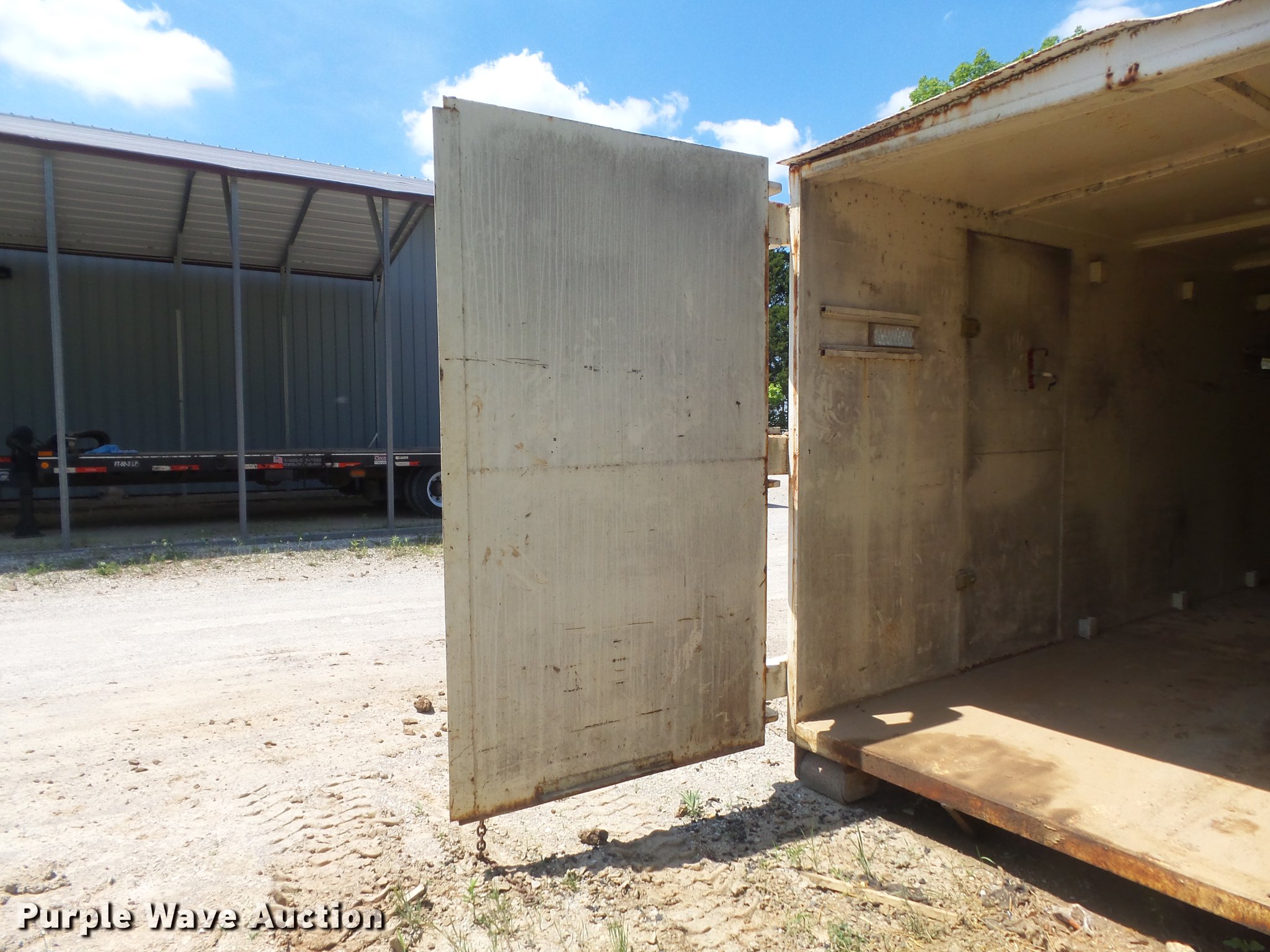 Roll-off/hook lift steel storage container. 280"L x 96"W x 103"H O.D., 262"L x 92"W x 82"H I.D., Removable shelving, Double swinging rear doors, Walk-through side side, Front and rear wheels. CLECO - Construction Logistics & Exc Company - Open inspection June 26. 5230 US Hwy 61 67. Imperial, MO 63052