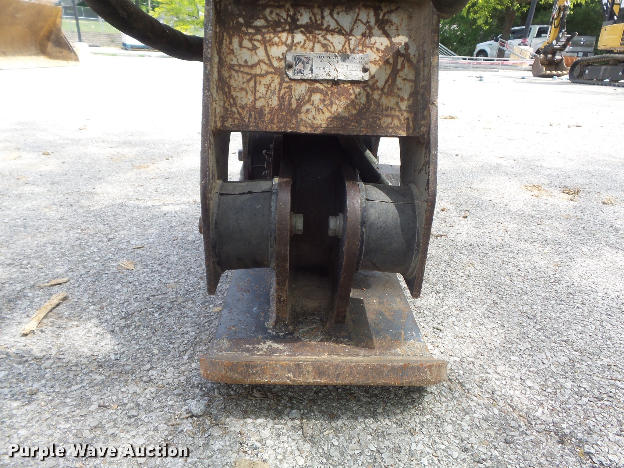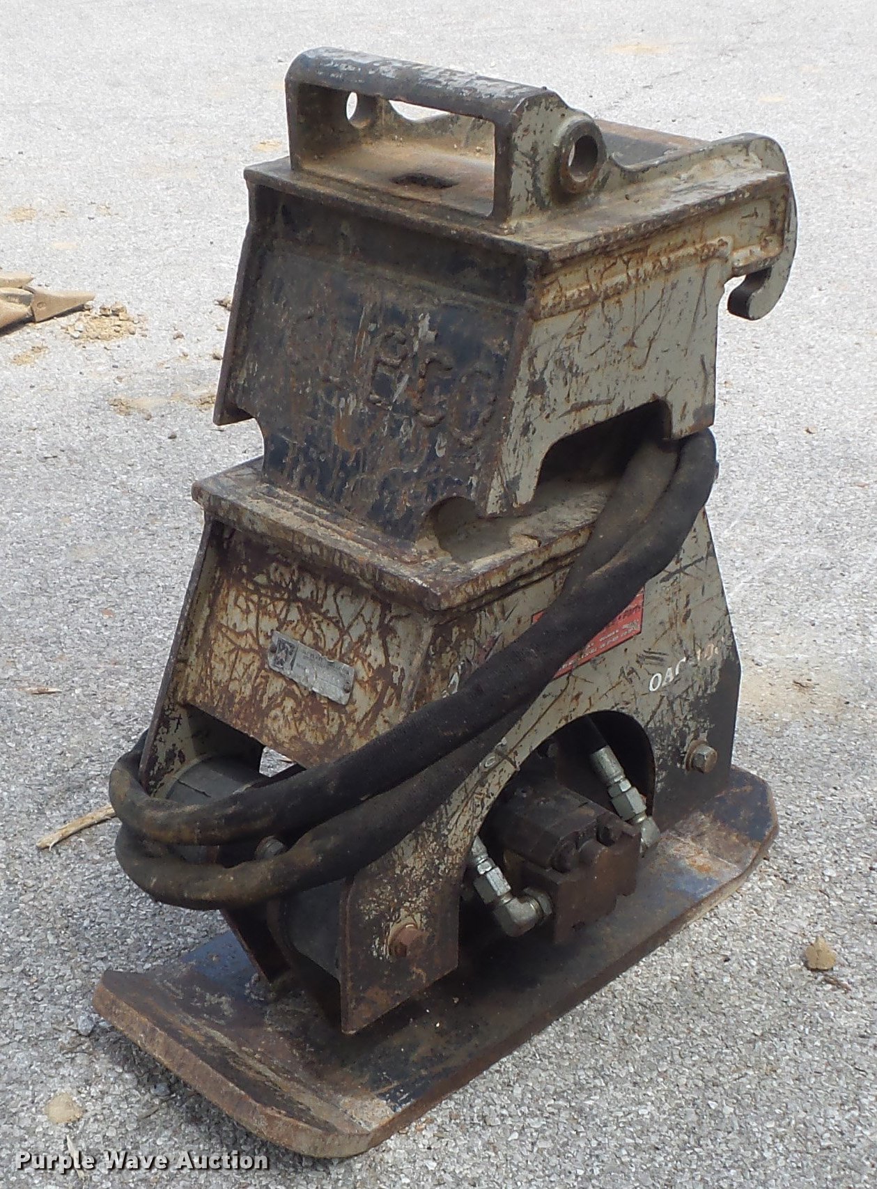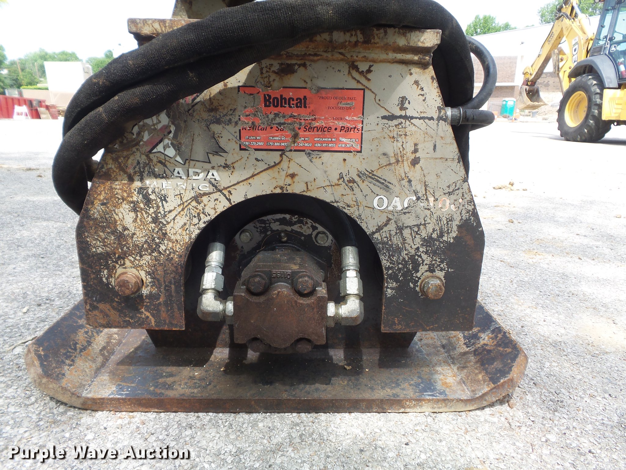 Okada OAC100 plate compactor. 12"W compaction plate, Two to seven ton carrier weight range, Bobcat quick attach, Requires 10 gpm hydraulic oil flow at 2,200 psi, Serial B339. CLECO - Construction Logistics & Exc Company - Open inspection June 26. 5230 US Hwy 61 67. Imperial, MO 63052