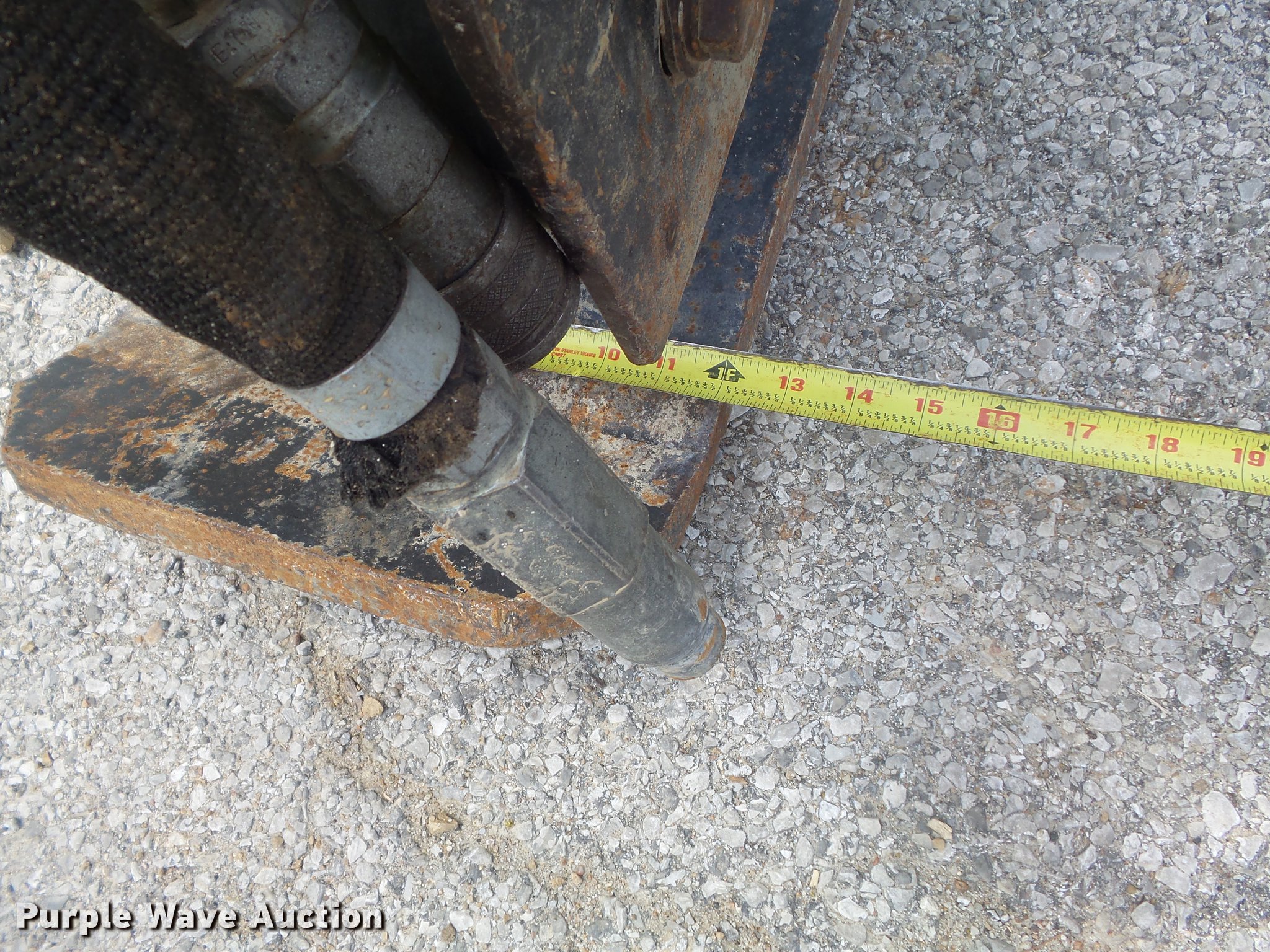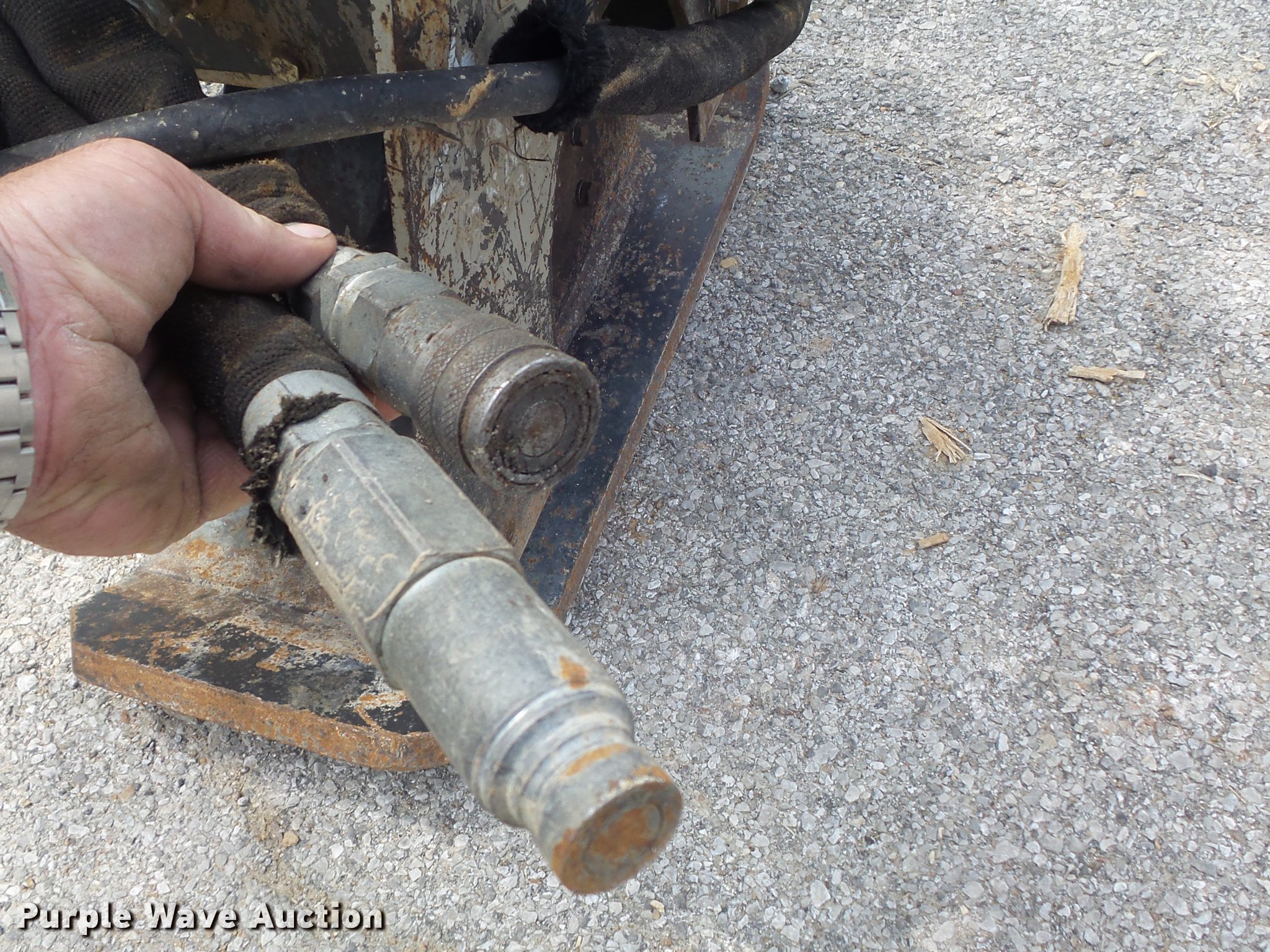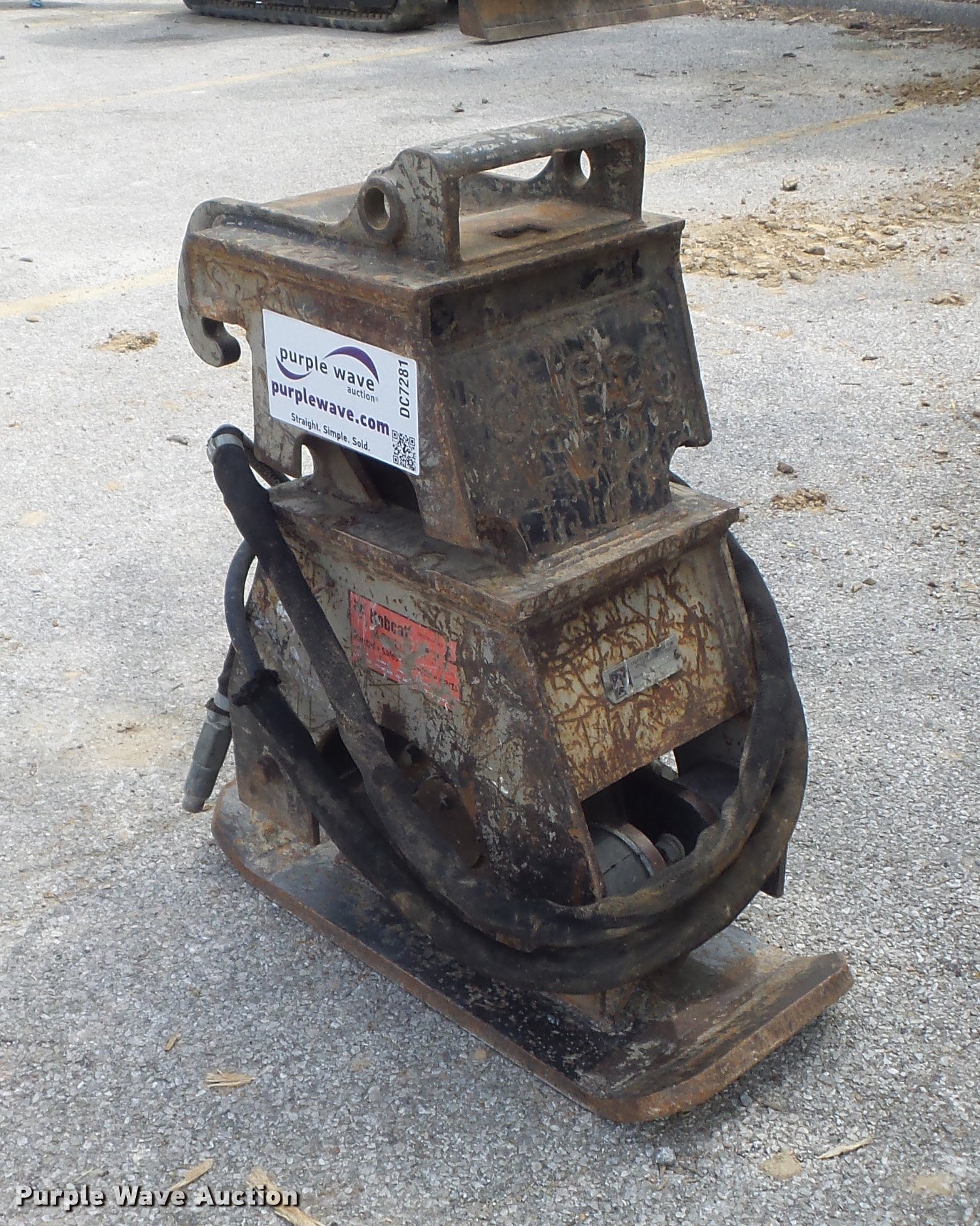 Okada OAC100 plate compactor. 12"W compaction plate, Two to seven ton carrier weight range, Bobcat quick attach, Requires 10 gpm hydraulic oil flow at 2,200 psi, Serial B339. CLECO - Construction Logistics & Exc Company - Open inspection June 26. 5230 US Hwy 61 67. Imperial, MO 63052