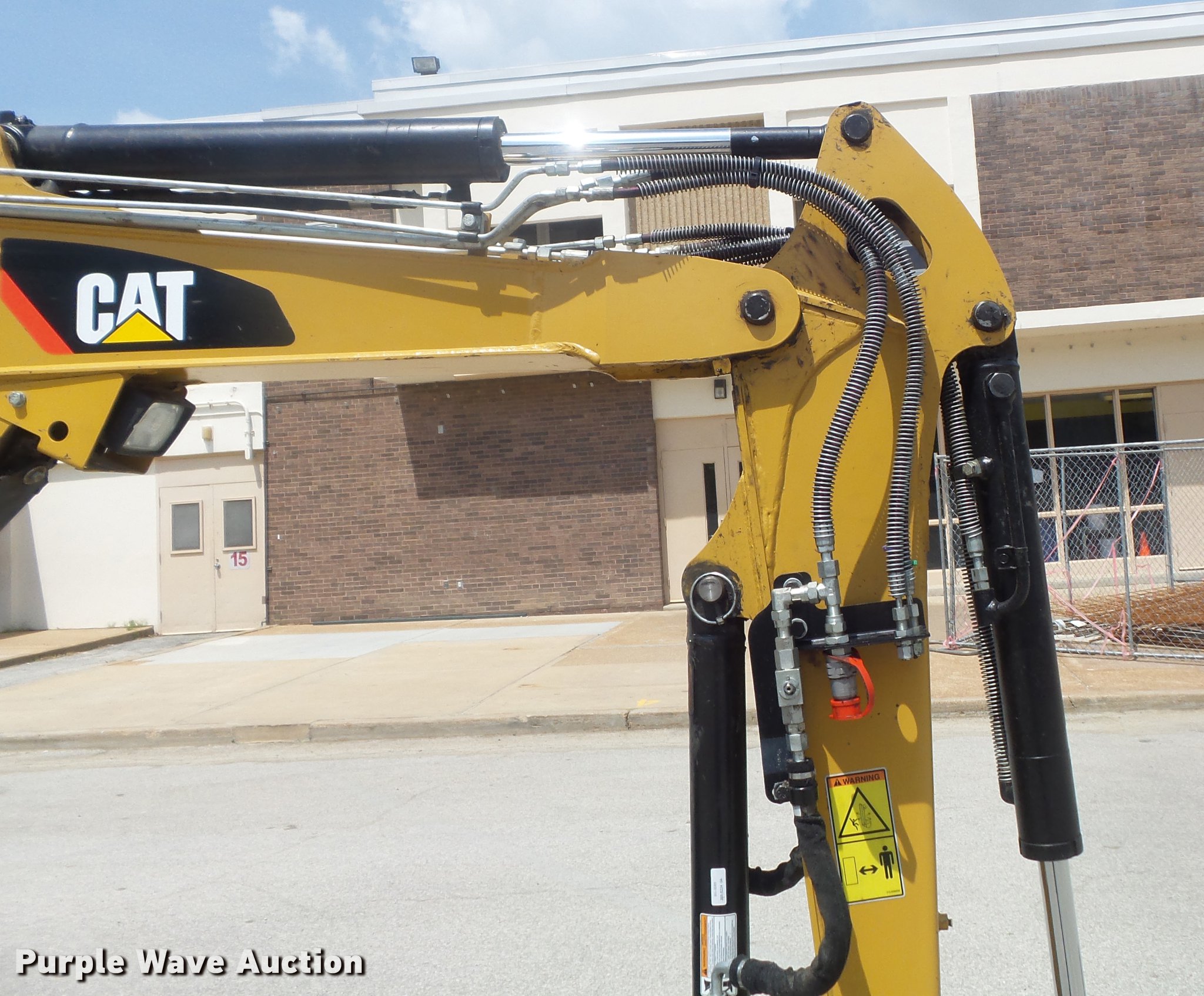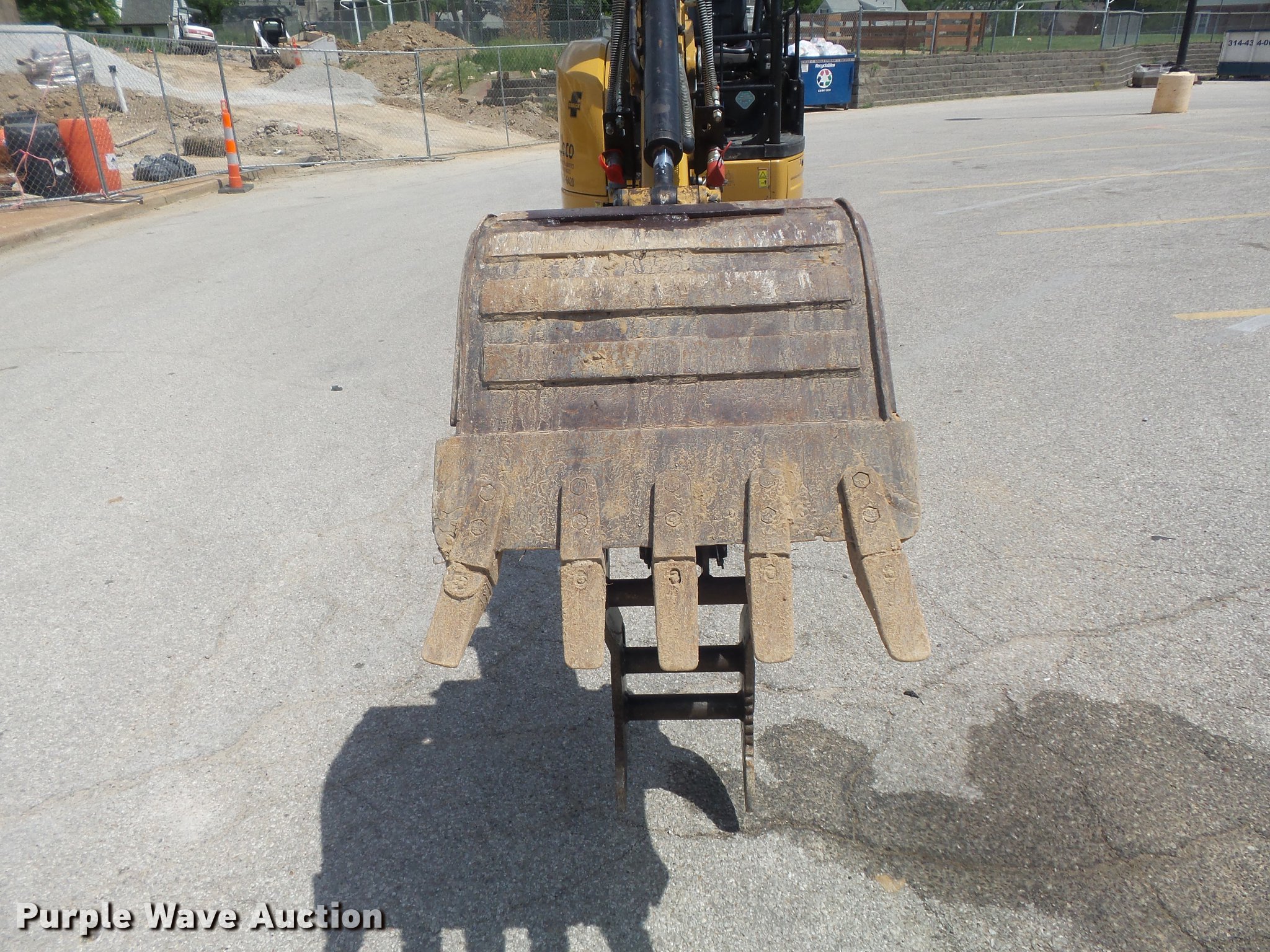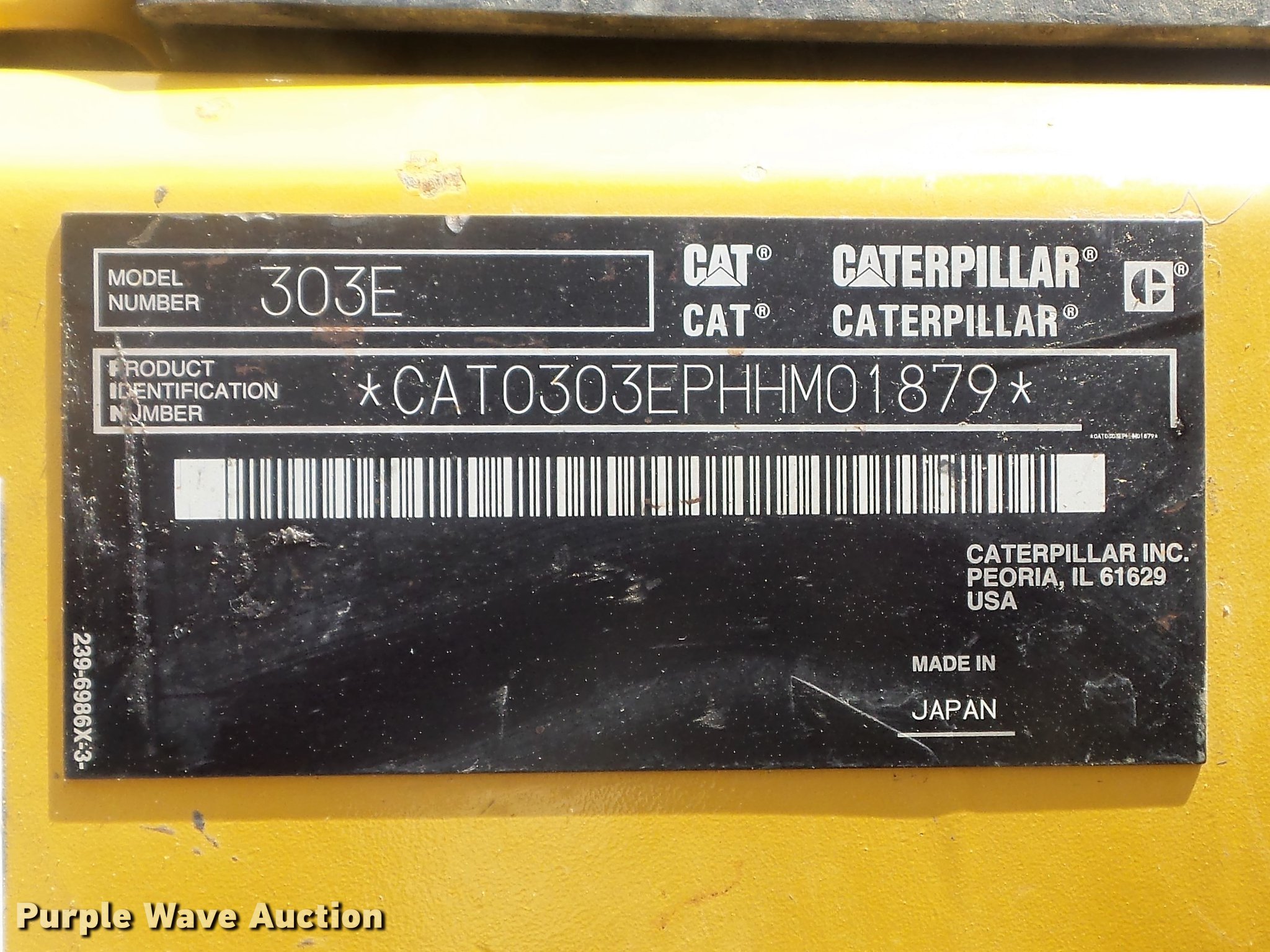 Purple Wave is selling a used Mini Excavator in Missouri. This item is a 2016 Caterpillar 303E CR mini excavator with the following: 702 hours on meter, Hours may vary, unit still in use, Caterpillar C1.3 1.3L three cylinder diesel engine, 24.8 HP, Serial 1GH1857, Two speed hydrostatic transmission, OROPS, Suspension seat, Pattern changer, Front work lights, Travel alarm, Standard boom, Bobcat 24"W bucket, (5) pin-on teeth, 14"W bucket, 30"W bucket, (5) additional teeth and pins, Caterpillar hydraulic thumb, Bobcat mechanical quick coupler, Two way auxiliary hydraulics, 60"W backfill blade, 12"W rubber tracks, Serial CAT0303EPHHM01879