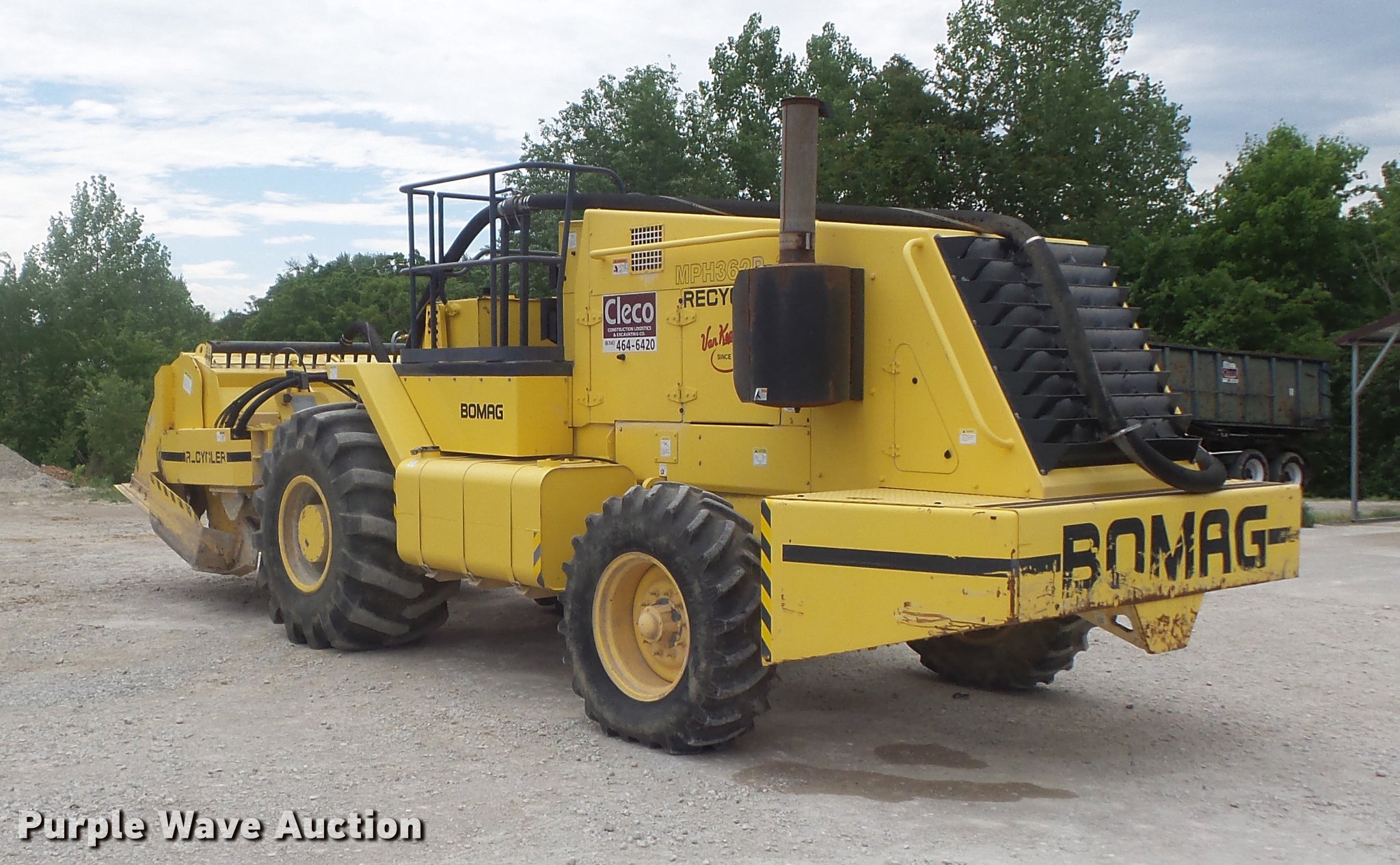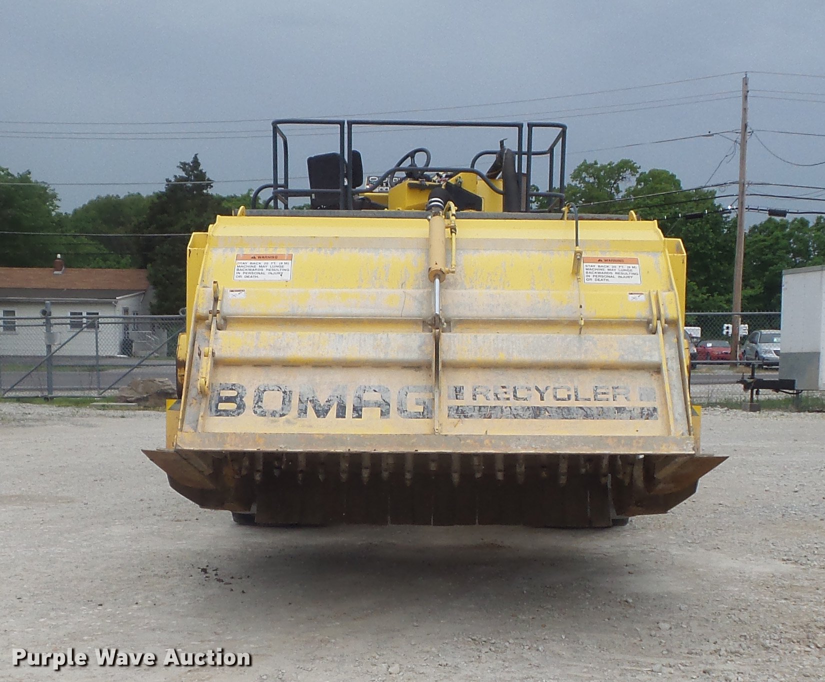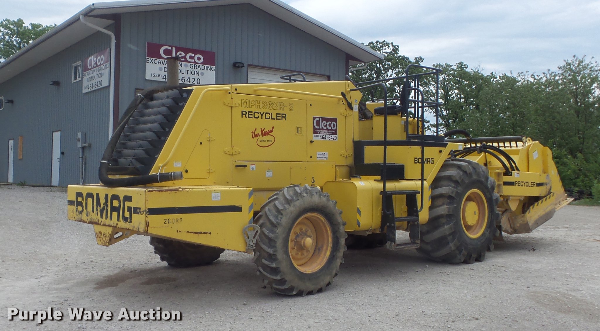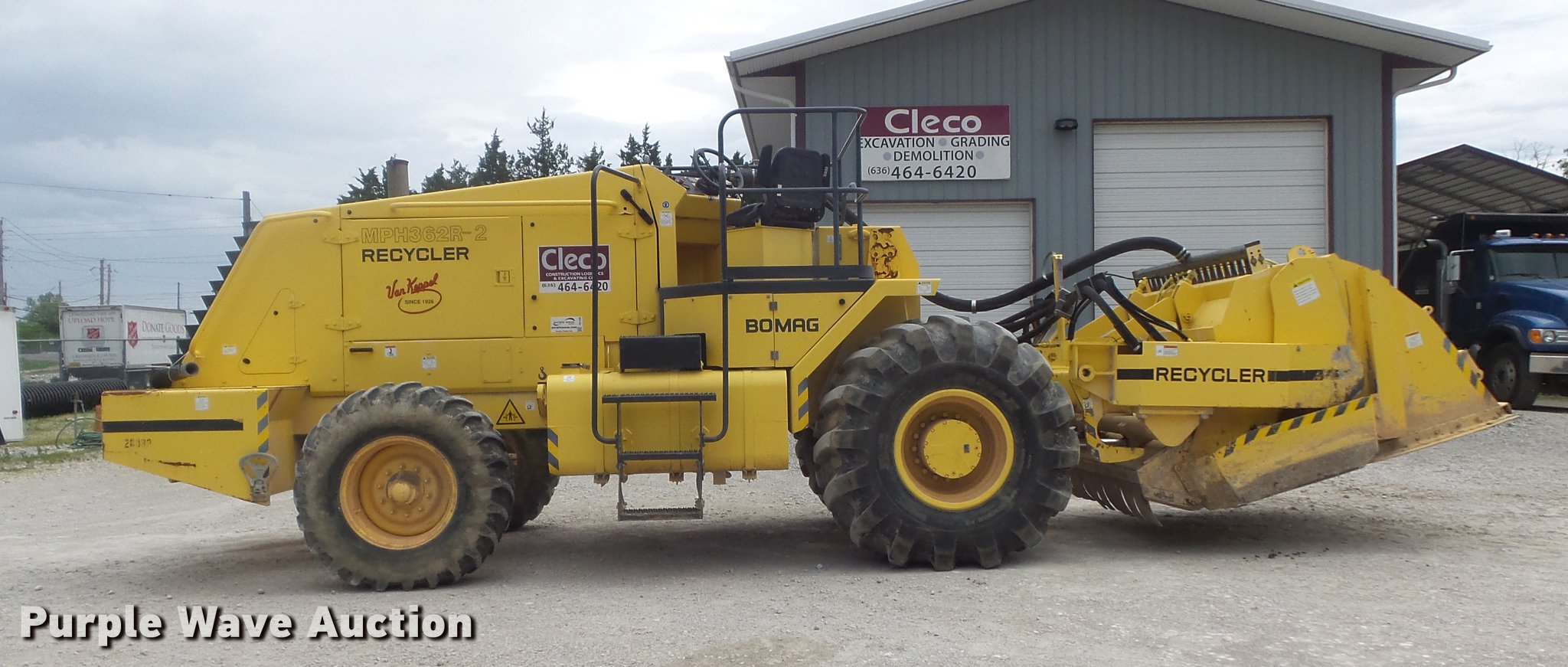Purple Wave is selling a used Reclaimer or Stabilizer in Missouri. This item is a 2011 Bomag MPH362R-2 recycler / stabilizer with the following: 926 hours on meter, Cummins QSM11 six cylinder turbo diesel engine, 360 HP, Serial 35279084, Two speed hydrostatic transmission, Unattached canopy, Backup alarm, 79"W cutting head, Two speed rotation, (168) replaceable carbide teeth, Water system, Approximately 200 additional teeth, Unused, Approximately 10 additional tooth holders, Unused, 14.9-24 front tires, 28L-26 rear tires, Serial 901B23001683