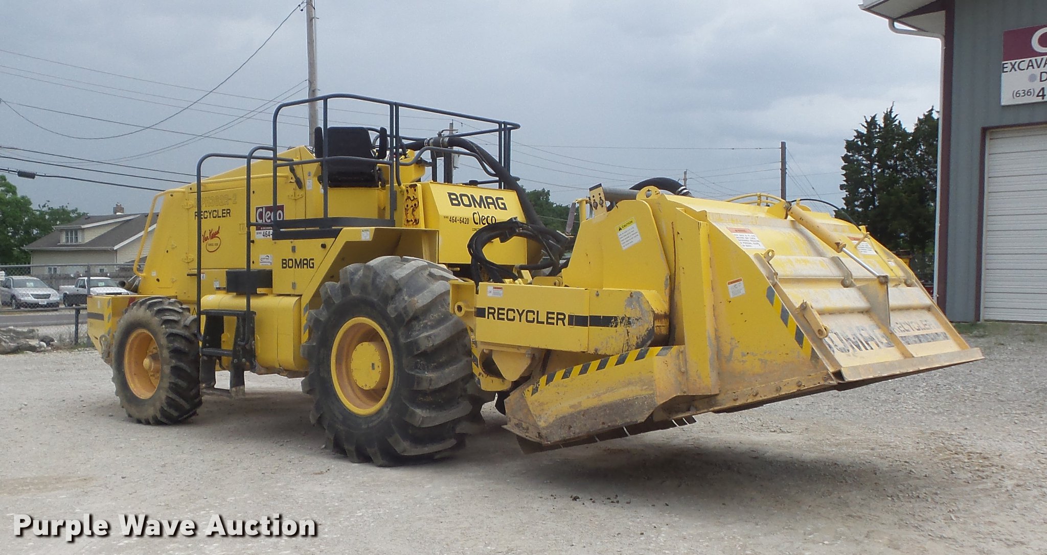 2011 Bomag MPH362R-2 recycler / stabilizer. 926 hours on meter, Cummins QSM11 six cylinder turbo diesel engine 360 HP, Serial 35279084, Two speed hydrostatic transmission, Unattached canopy, Backup alarm, 79"W cutting head Two speed rotation, (168) replaceable carbide teeth, Water system, Approximately 200 additional teeth Unused, Approximately 10 additional tooth holders Unused, 14.9-24 front tires, 28L-26 rear tires, Serial 901B23001683. CLECO - Construction Logistics & Exc Company - Open inspection June 26. 5230 US Hwy 61 67. Imperial, MO 63052