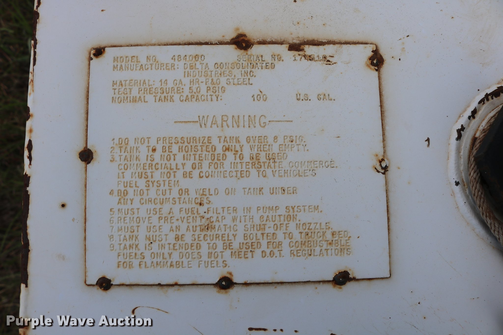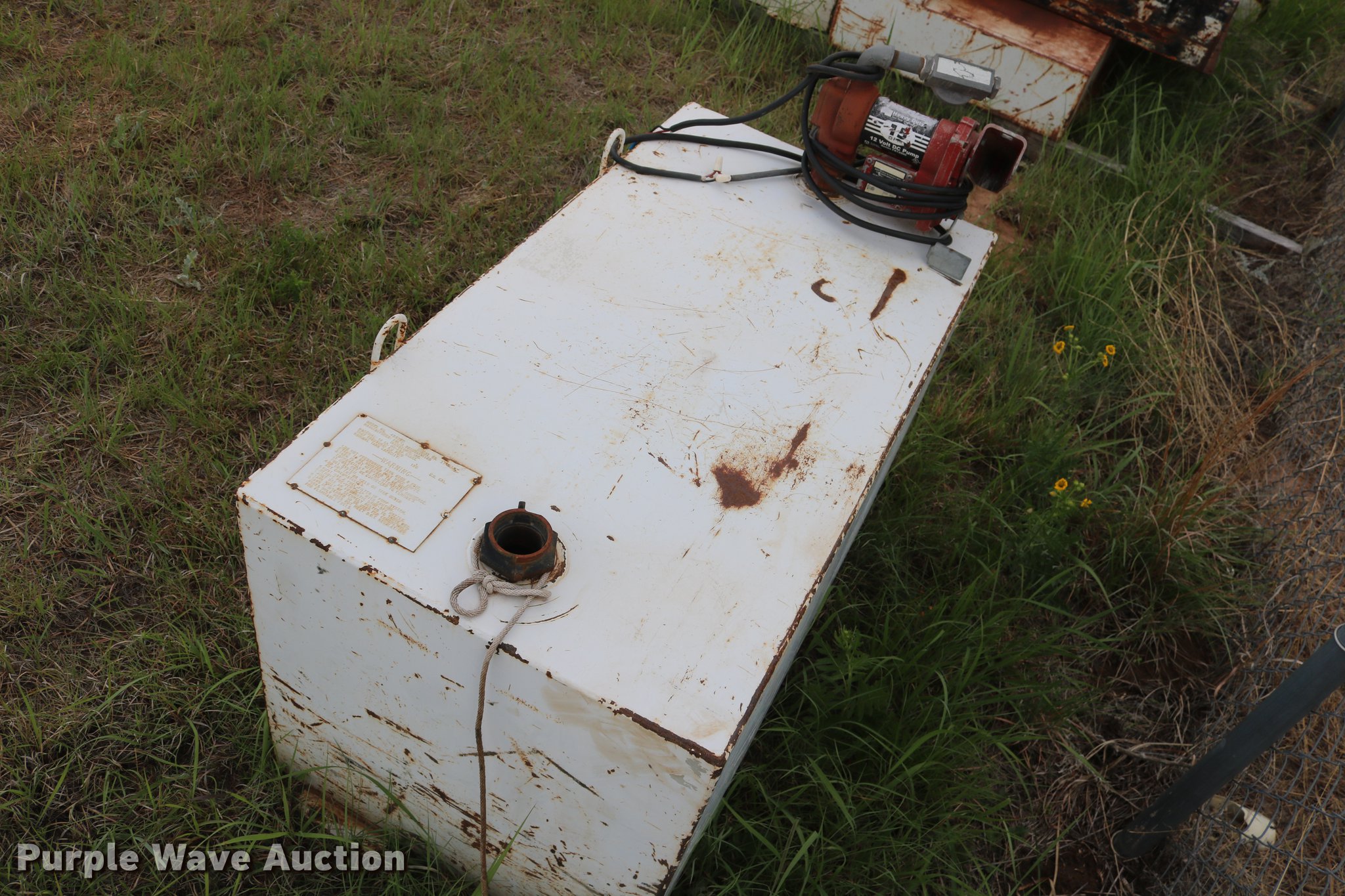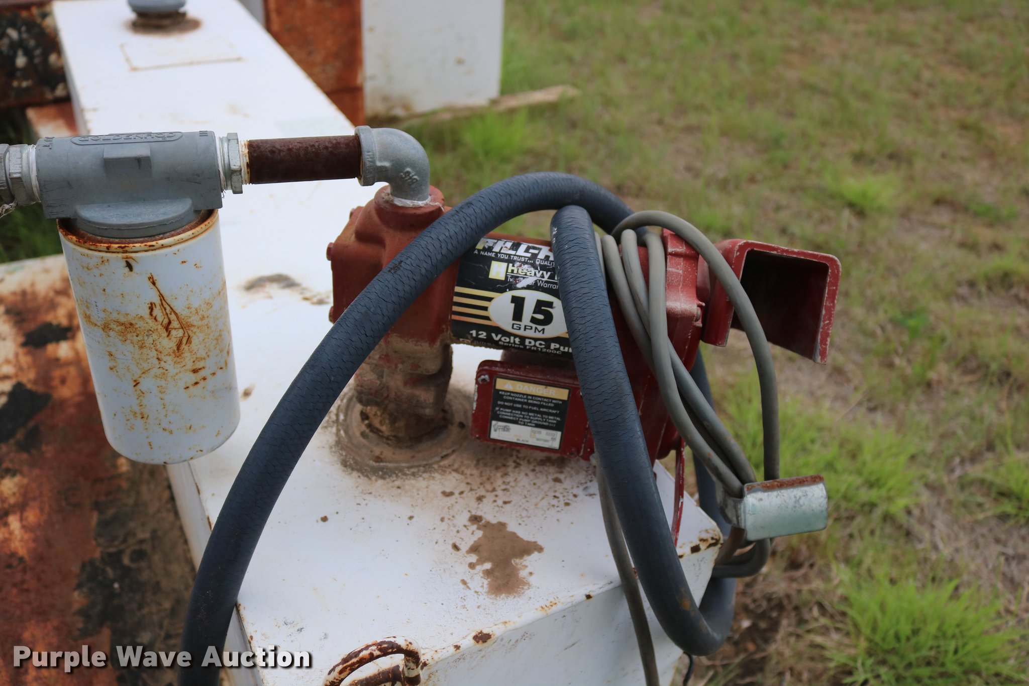 Purple Wave is selling a used Fuel and Lube in Oklahoma. This item is a (5) fuel tanks with the following: (2) 100 gallon tanks, One Fillrite 12V pump, 57 gallon fuel tank, 105 gallon fuel tank, 100 gallon fuel tank, Fill Rite 12V pump