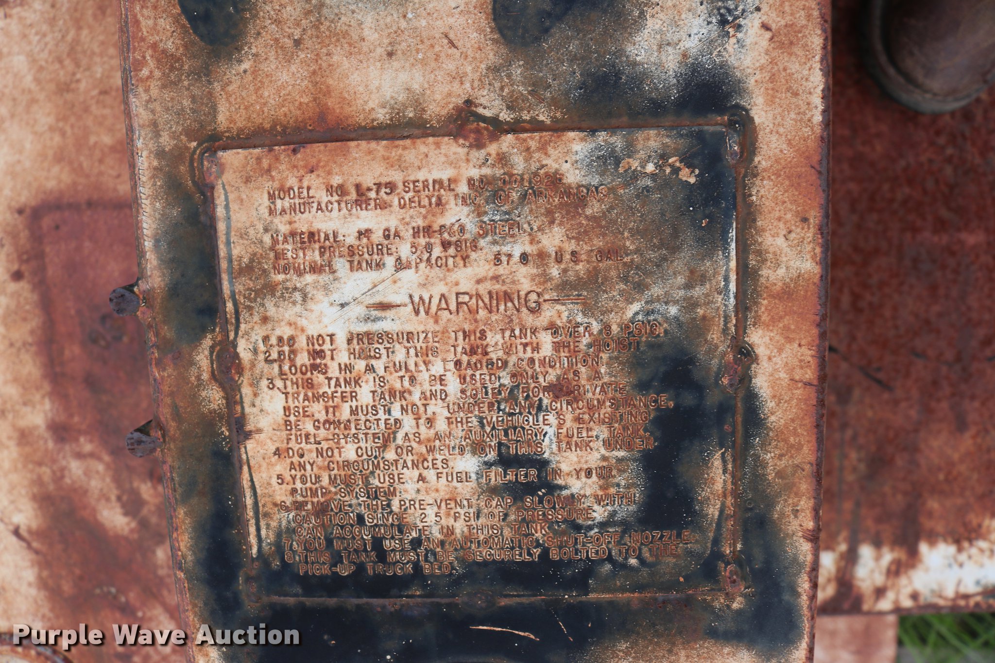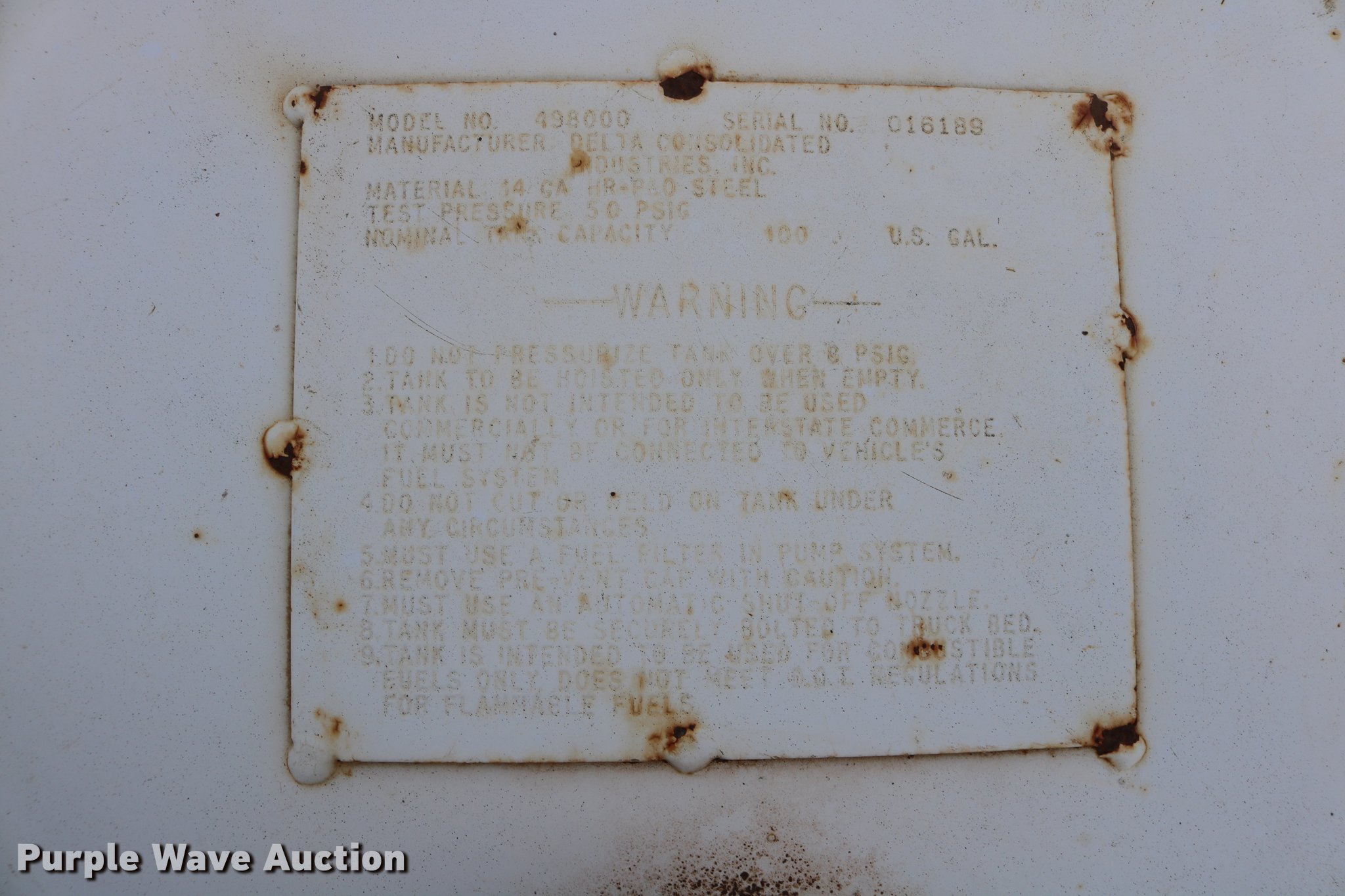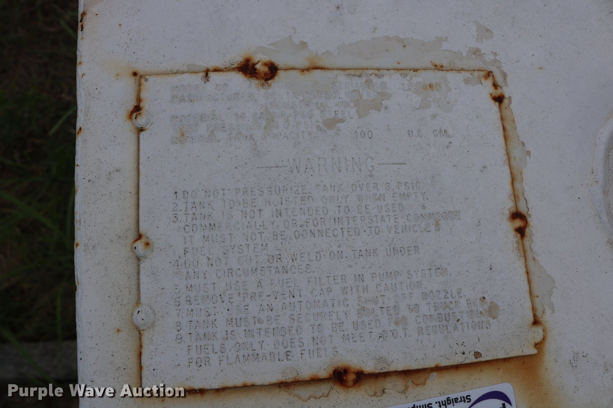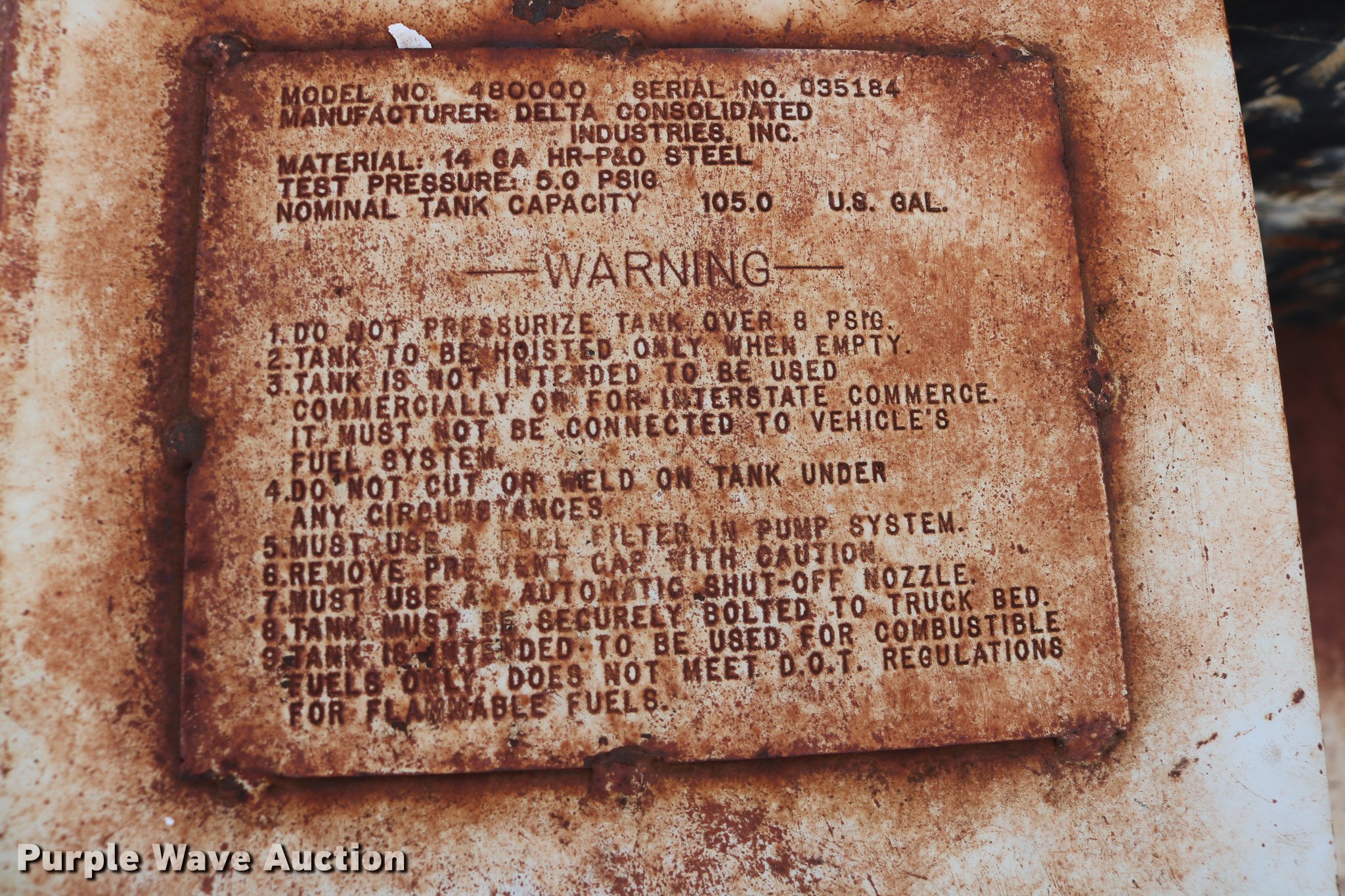 Purple Wave is selling a used Fuel and Lube in Oklahoma. This item is a (5) fuel tanks with the following: (2) 100 gallon tanks, One Fillrite 12V pump, 57 gallon fuel tank, 105 gallon fuel tank, 100 gallon fuel tank, Fill Rite 12V pump
