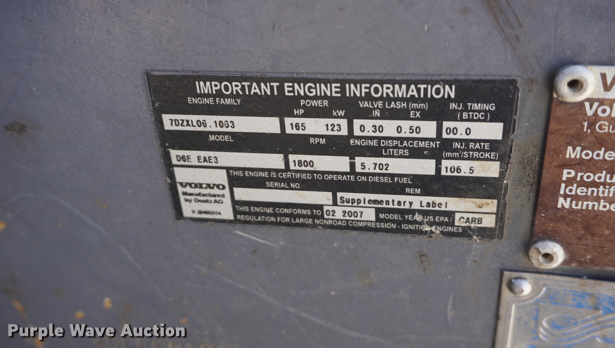 Purple Wave is selling a used Hydraulic Excavator in Kansas. This item is a 2007 Volvo EC210C L excavator with the following: 4,251 hours on meter, Approx. 7,200 to 7,400 actual hours, Volvo D6EEHE3 5.70L six cylinder turbo diesel engine, 165 HP, Hydrostatic transmission, EROPS, AC and heat, AM/FM, Suspension seat, Pattern changer, Standard boom, 9'7" stick length, Geith 36"W bucket, (5) weld-on teeth, CP EC210 hydraulic thumb, Hydraulic quick coupler, Two way auxiliary hydraulics, 31.5"W steel triple grouser track pads, Serial VCEC210CH00110225