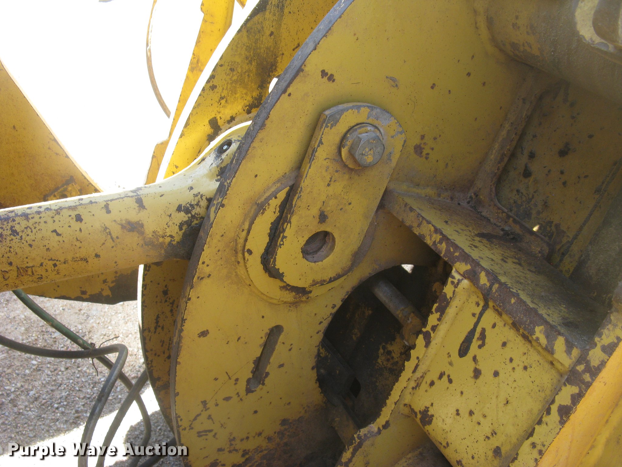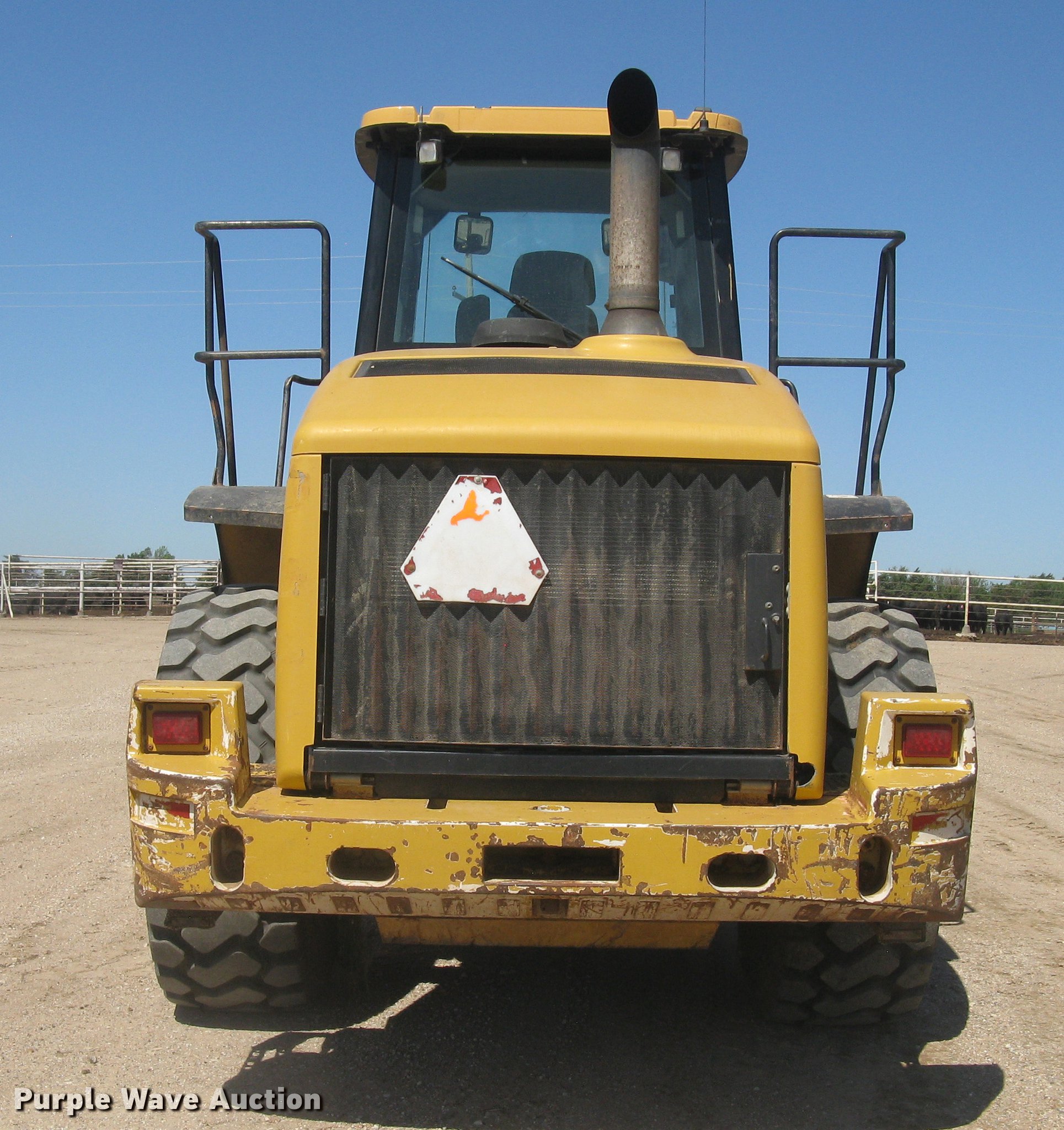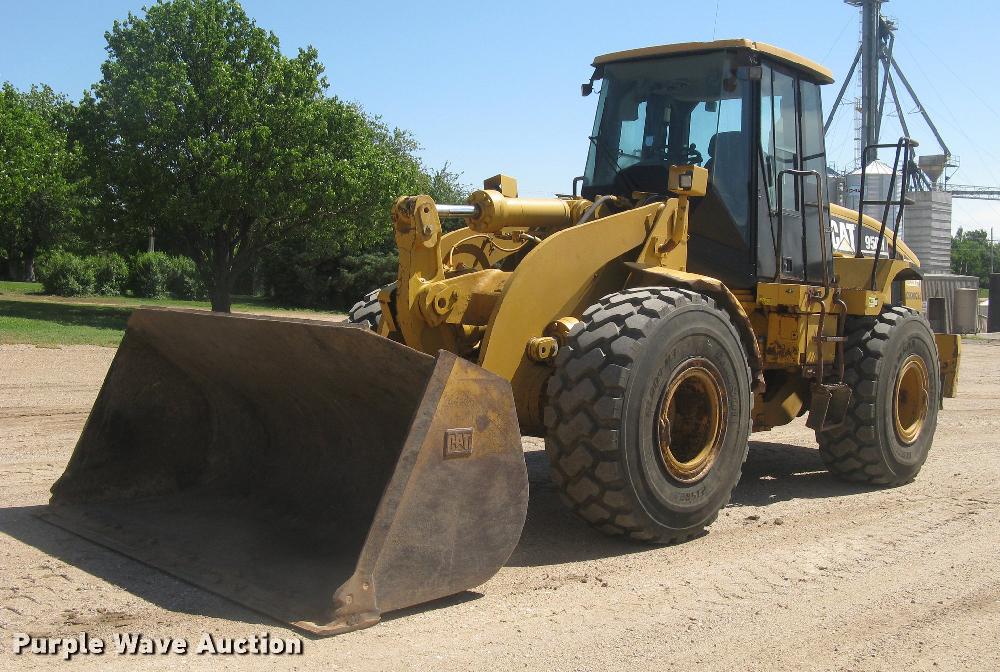 2006 Caterpillar 950H wheel loader. 14,421 hours on meter, Caterpillar six cylinder turbo diesel engine, Powershift transmission 4F-4R gears, EROPS, AC and heat, AM/FM, Tilt steering wheel, Air suspension seat, Two-lever bucket controls, Wipers, Front and rear work lights, Backup alarm, Block heater, Caterpillar 114"W general purpose bucket Bolt-on cutting edge, Self-leveling, Hydraulic quick coupler, Counterweights, Samson GLR09-M3 23.5R25 tires, Serial CAT0950HLK5K00754. Knight Feedlot. 1768 Ave J. Lyons, KS 67554
