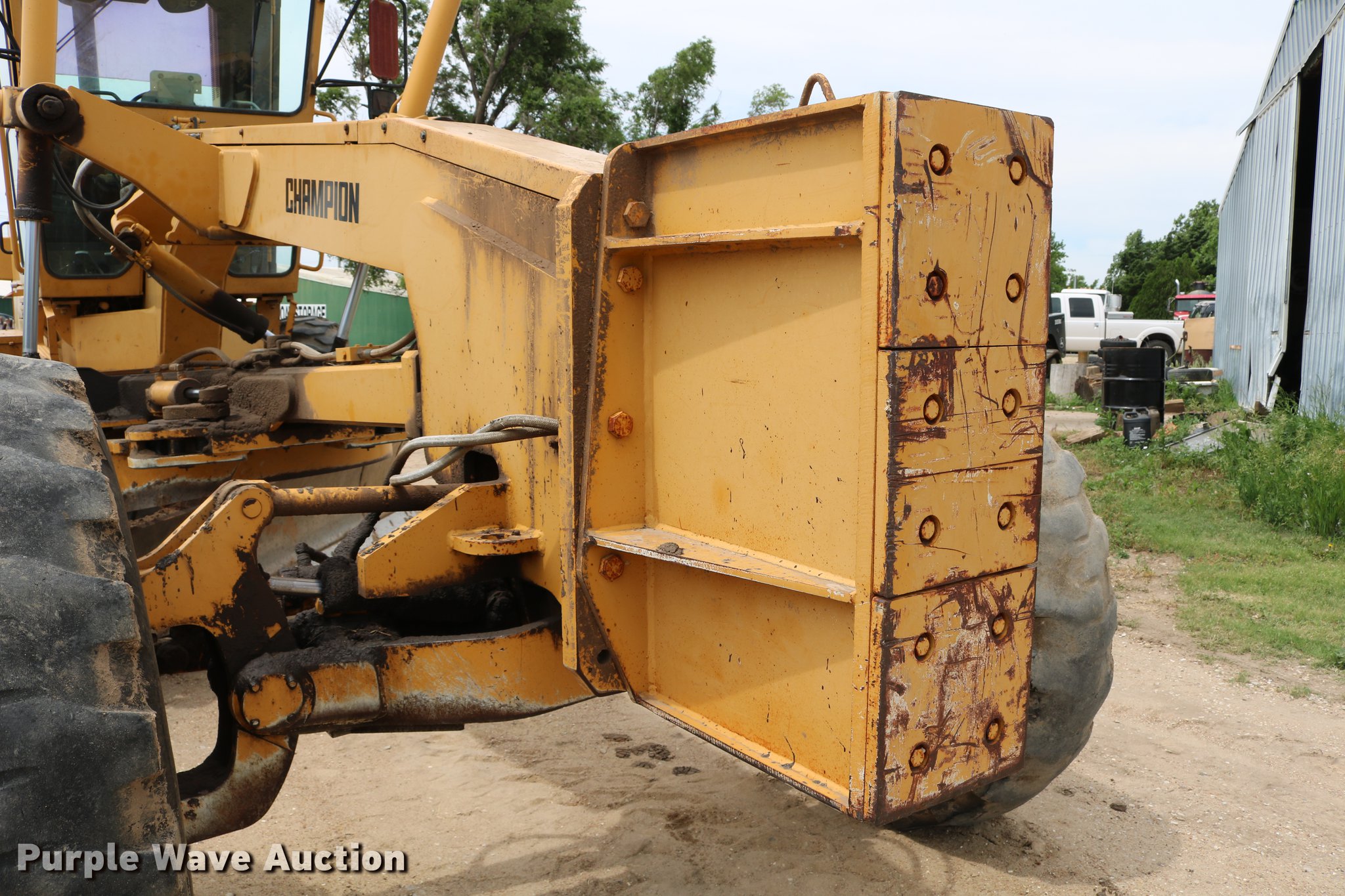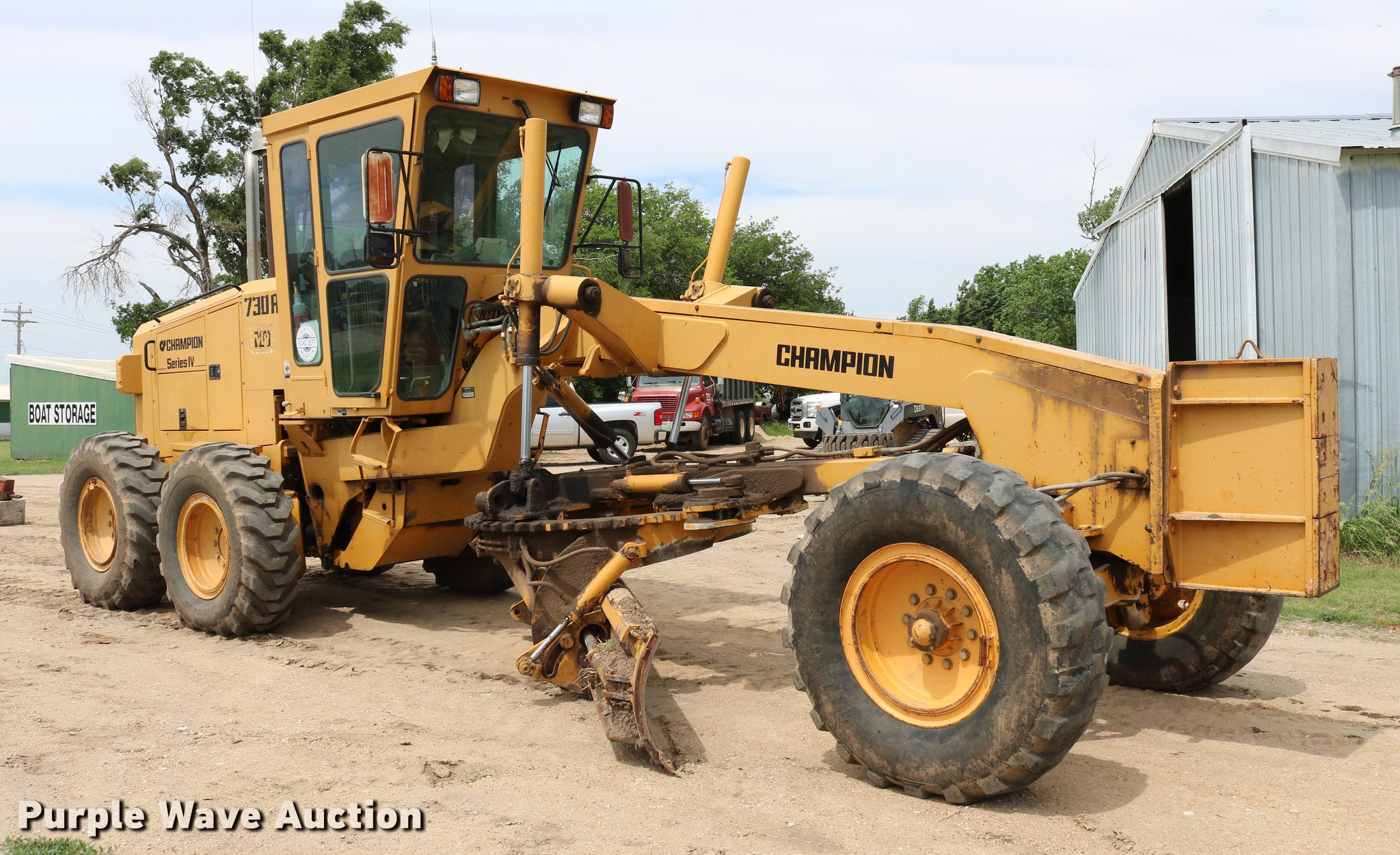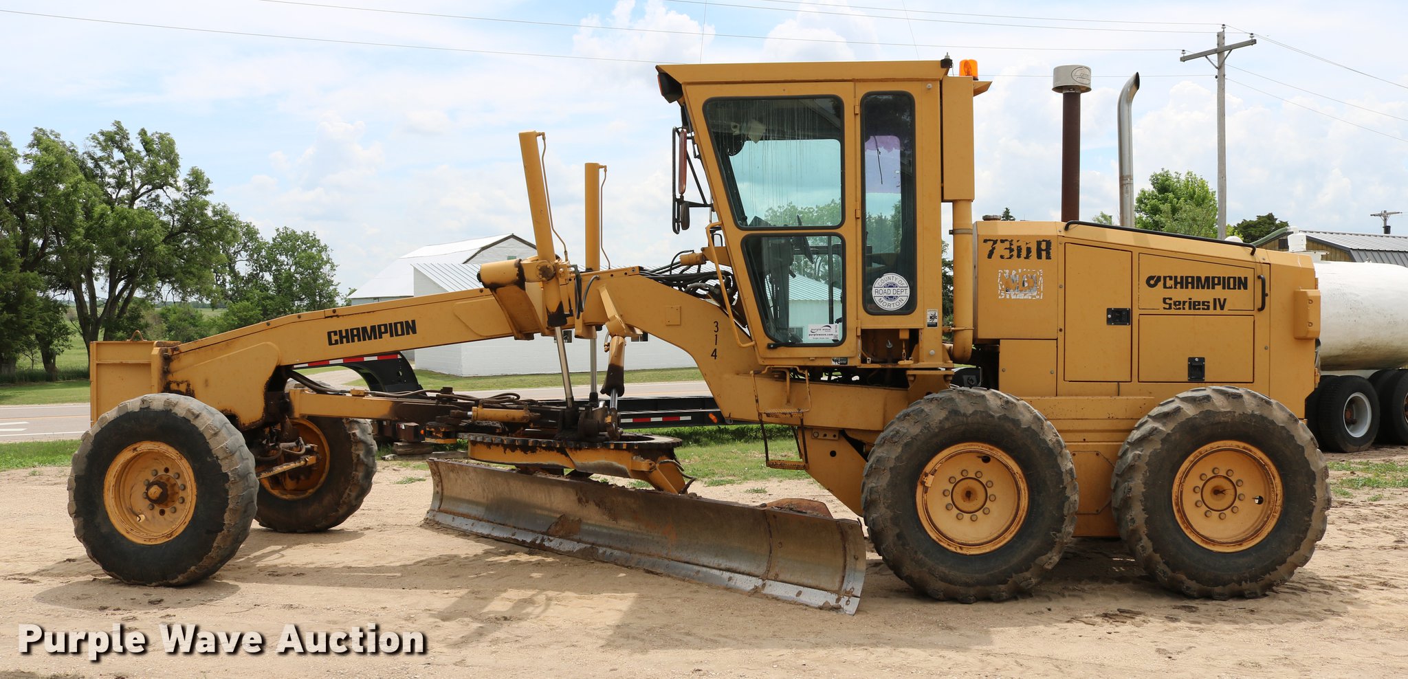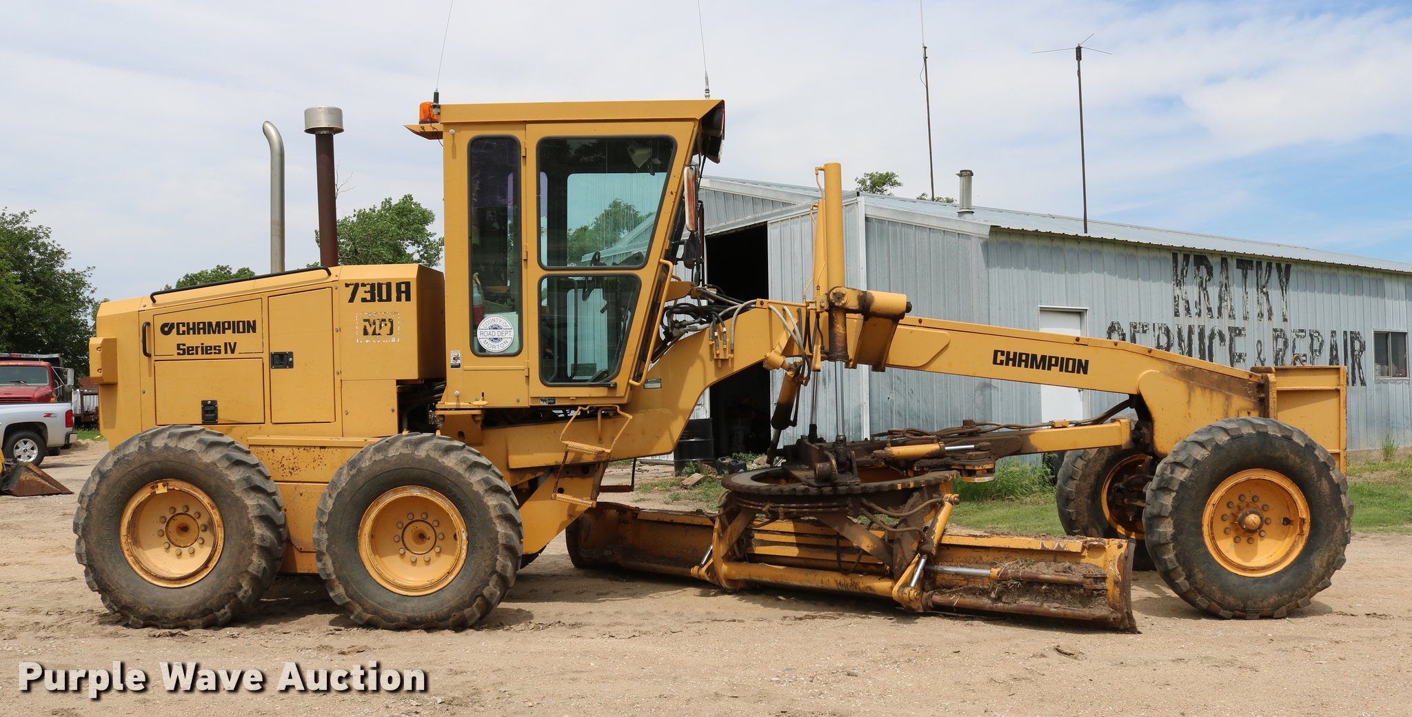 Purple Wave is selling a used Motor Grader in Kansas. This item is a 1995 Champion 730A motor grader with the following: 10,364 hours on meter, Cummins 6CT8.3-C 8.3L six cylinder turbo diesel engine, Powershift transmission, 7F-7R gears, Differential lock, EROPS, AC and heat, Suspension seat, Front work lights, 10 hydraulic control valves, 16'W moldboard, Tip control, Side shift, Left blade extension, Circle slip clutch, Front mounted weight, 14.00-24 tires, Cracked lower left side window, Serial X025078X