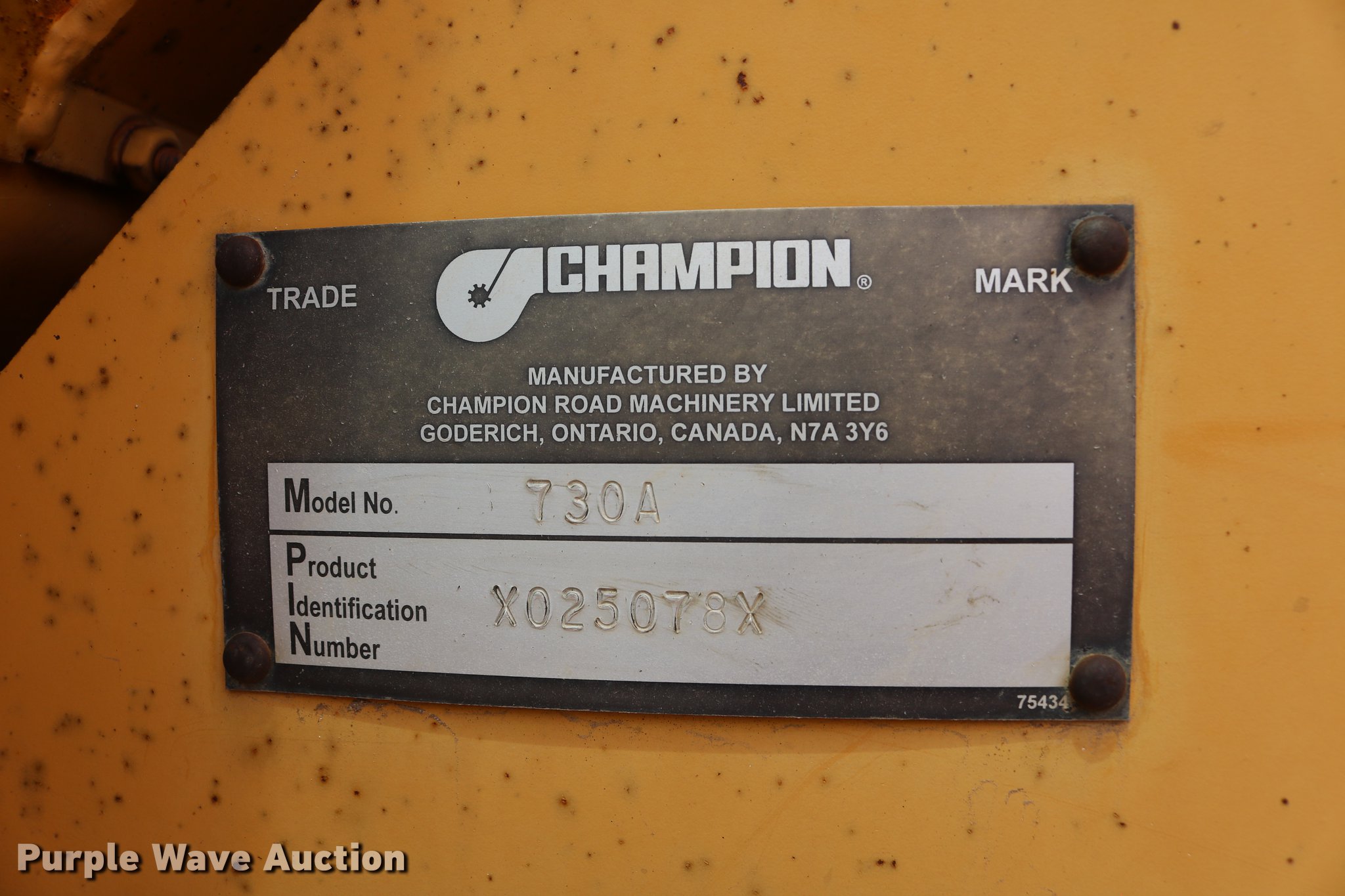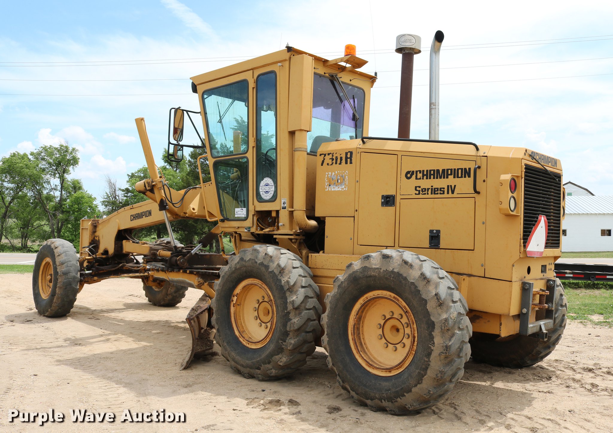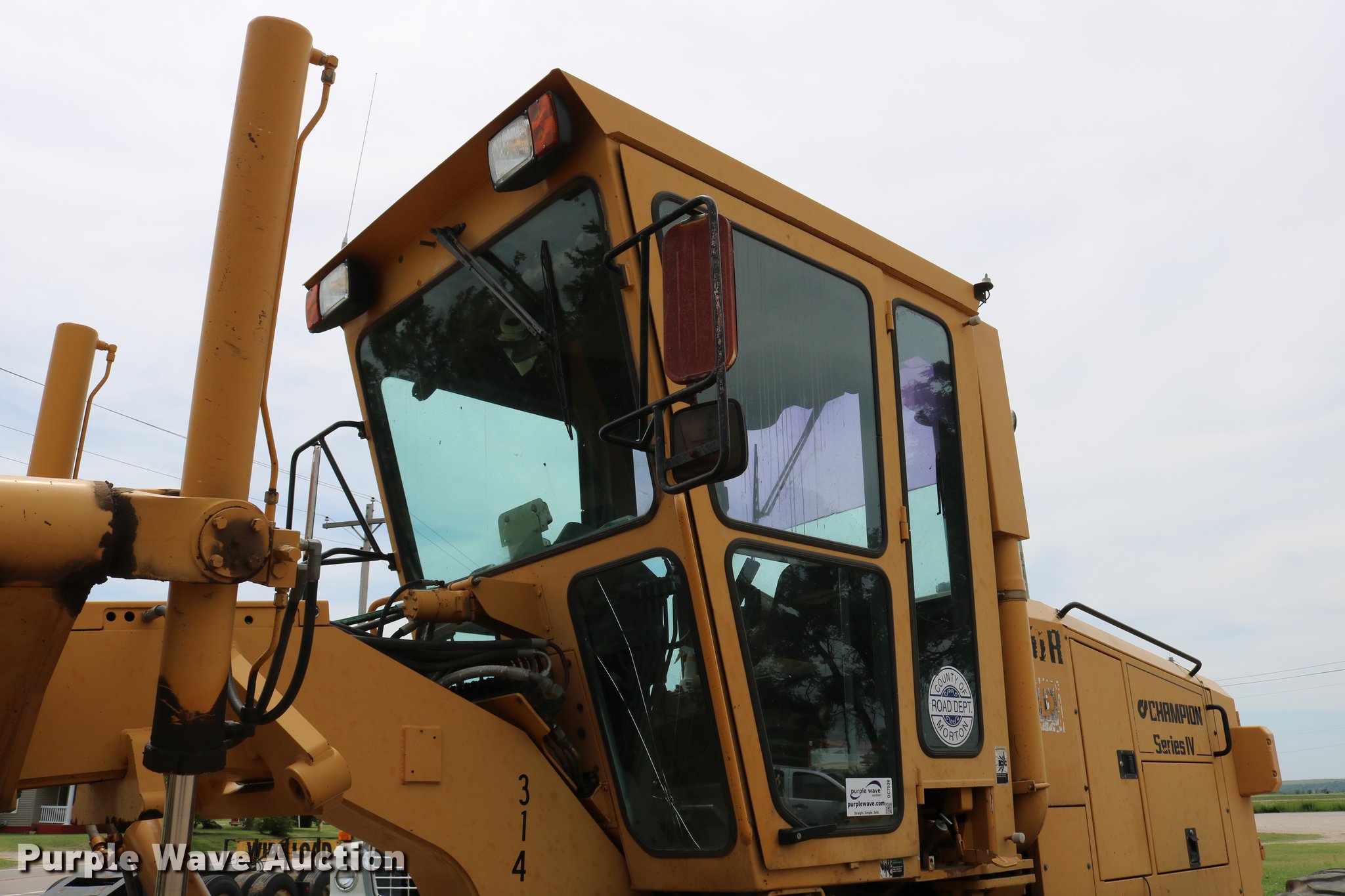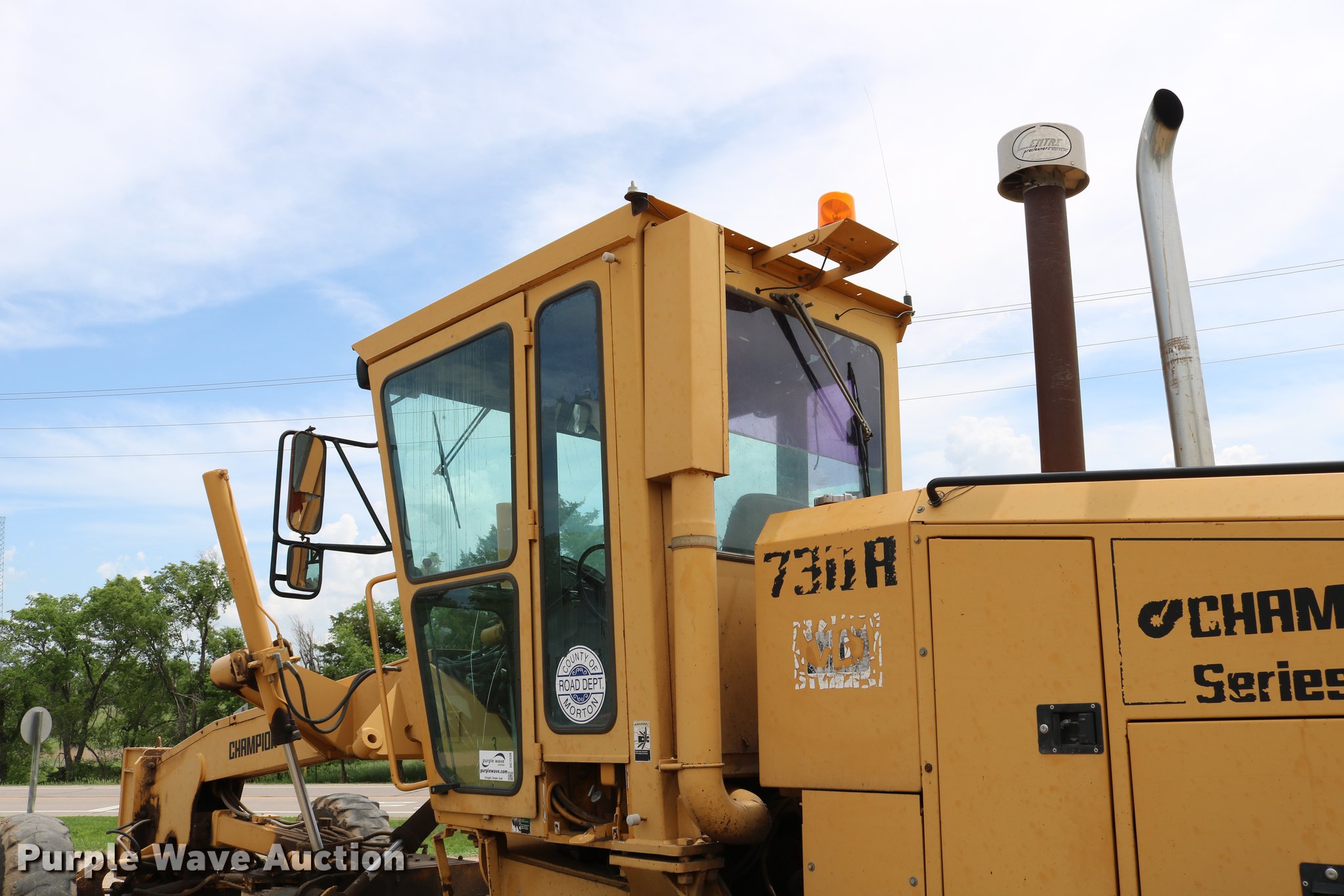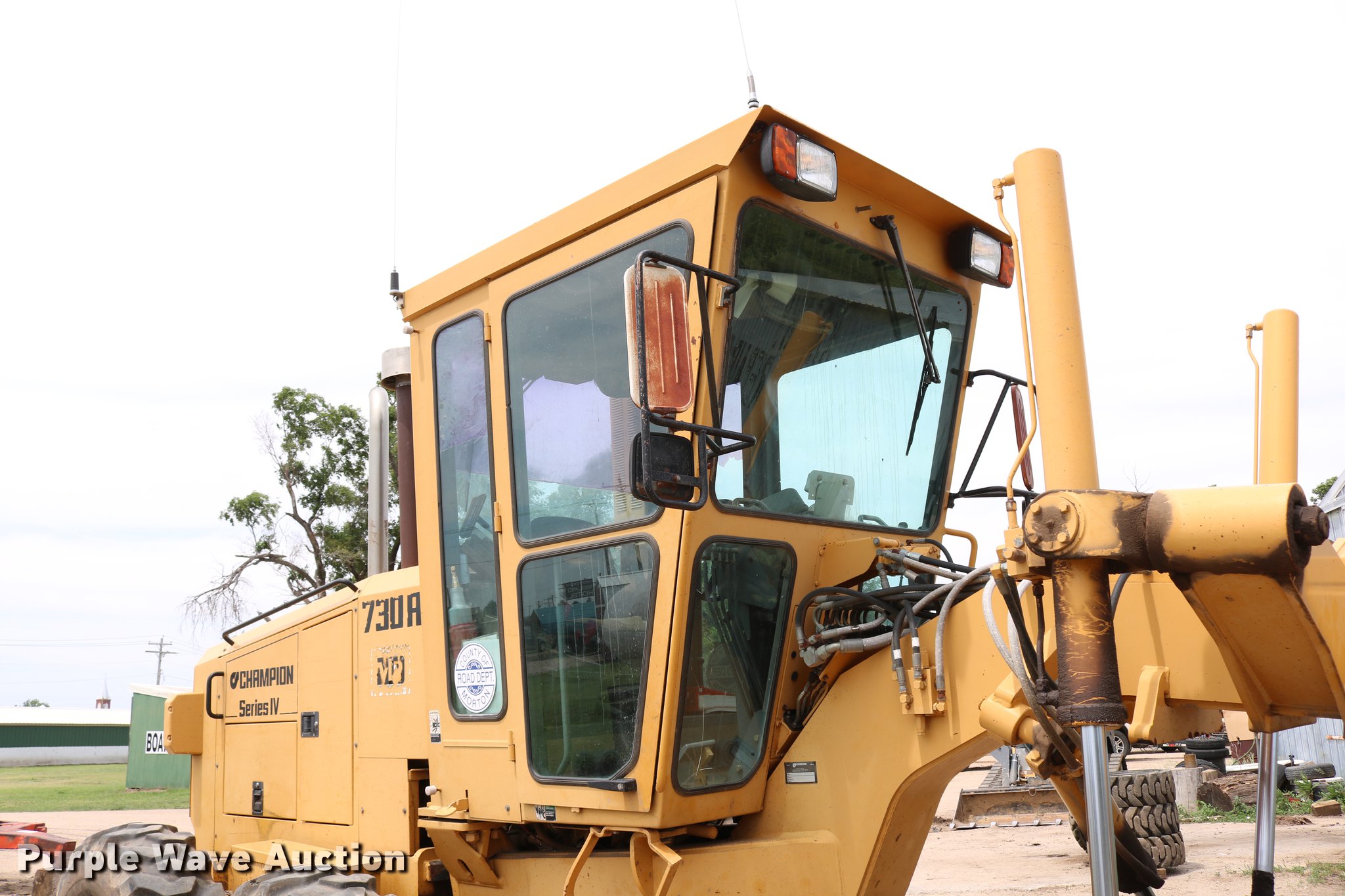 Purple Wave is selling a used Motor Grader in Kansas. This item is a 1995 Champion 730A motor grader with the following: 10,364 hours on meter, Cummins 6CT8.3-C 8.3L six cylinder turbo diesel engine, Powershift transmission, 7F-7R gears, Differential lock, EROPS, AC and heat, Suspension seat, Front work lights, 10 hydraulic control valves, 16'W moldboard, Tip control, Side shift, Left blade extension, Circle slip clutch, Front mounted weight, 14.00-24 tires, Cracked lower left side window, Serial X025078X
