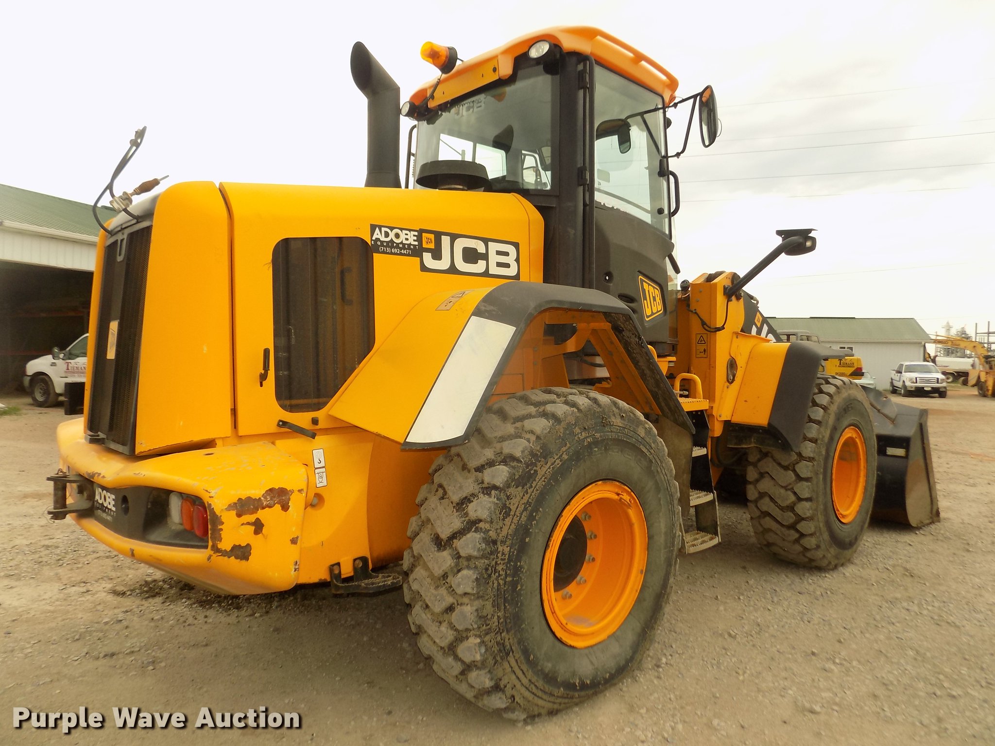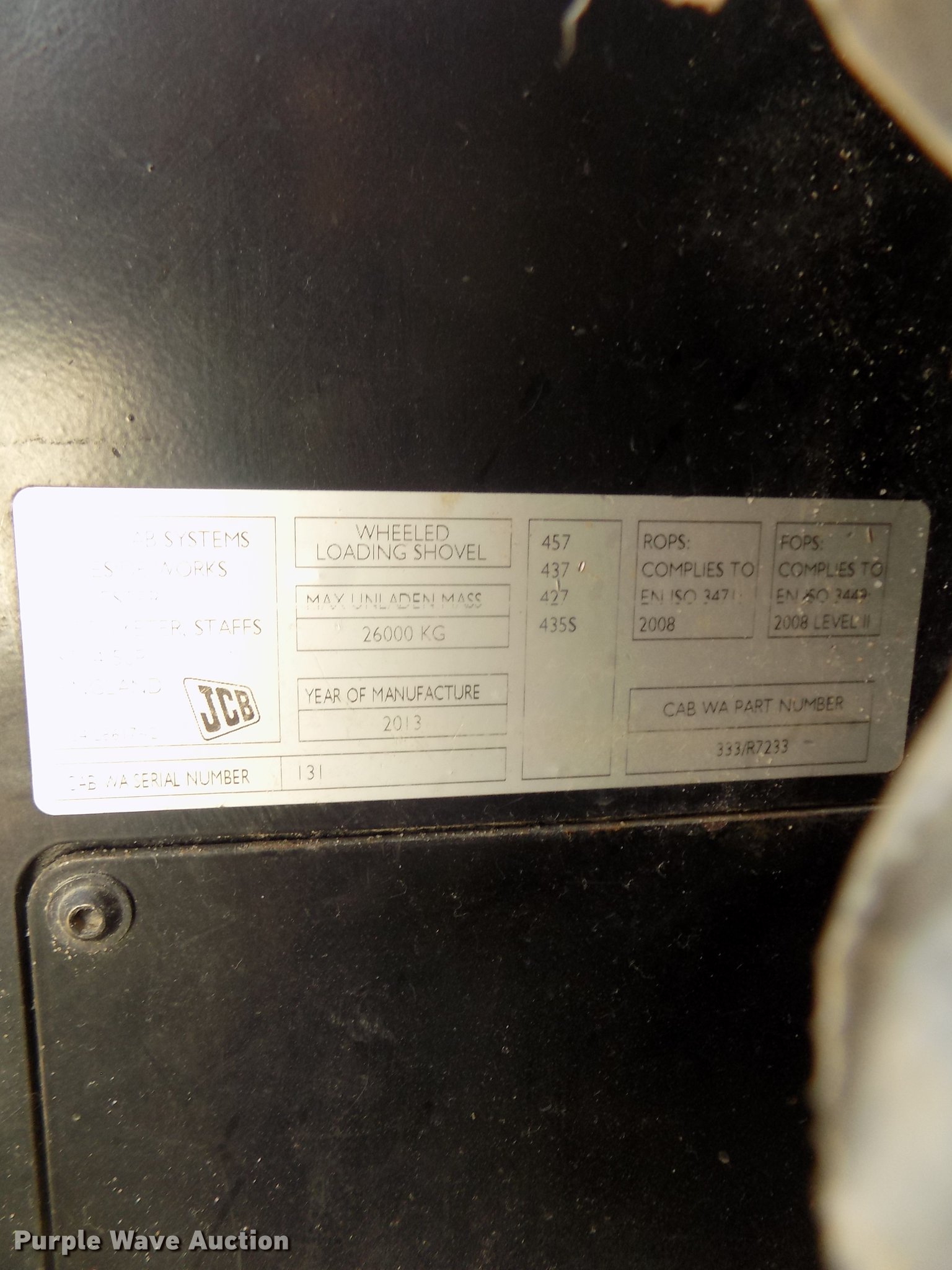 Purple Wave is selling a used Wheel Loader in Nebraska. This item is a 2013 JCB 437 ZX wheel loader with the following: 5,819 hours on meter, Six cylinder turbo diesel engine, Serial 22068955, Powershift transmission, 4F-4R gears, Enclosed cab, AC and heat, Tilt steering wheel, Suspension seat, Wipers, Front work lights, JCB general purpose bucket, 3.5 cu. yd. capacity, Bolt-on cutting edge, Manual quick coupler, Front auxiliary hydraulics, Capped, Pin hitch, Maxam 20.5R25 tires, Windshield cracked, Serial JCB437Z0A02063717