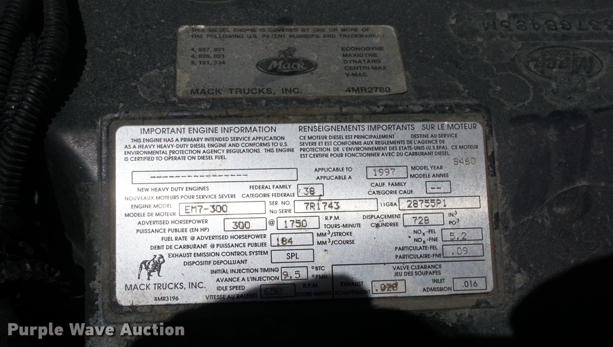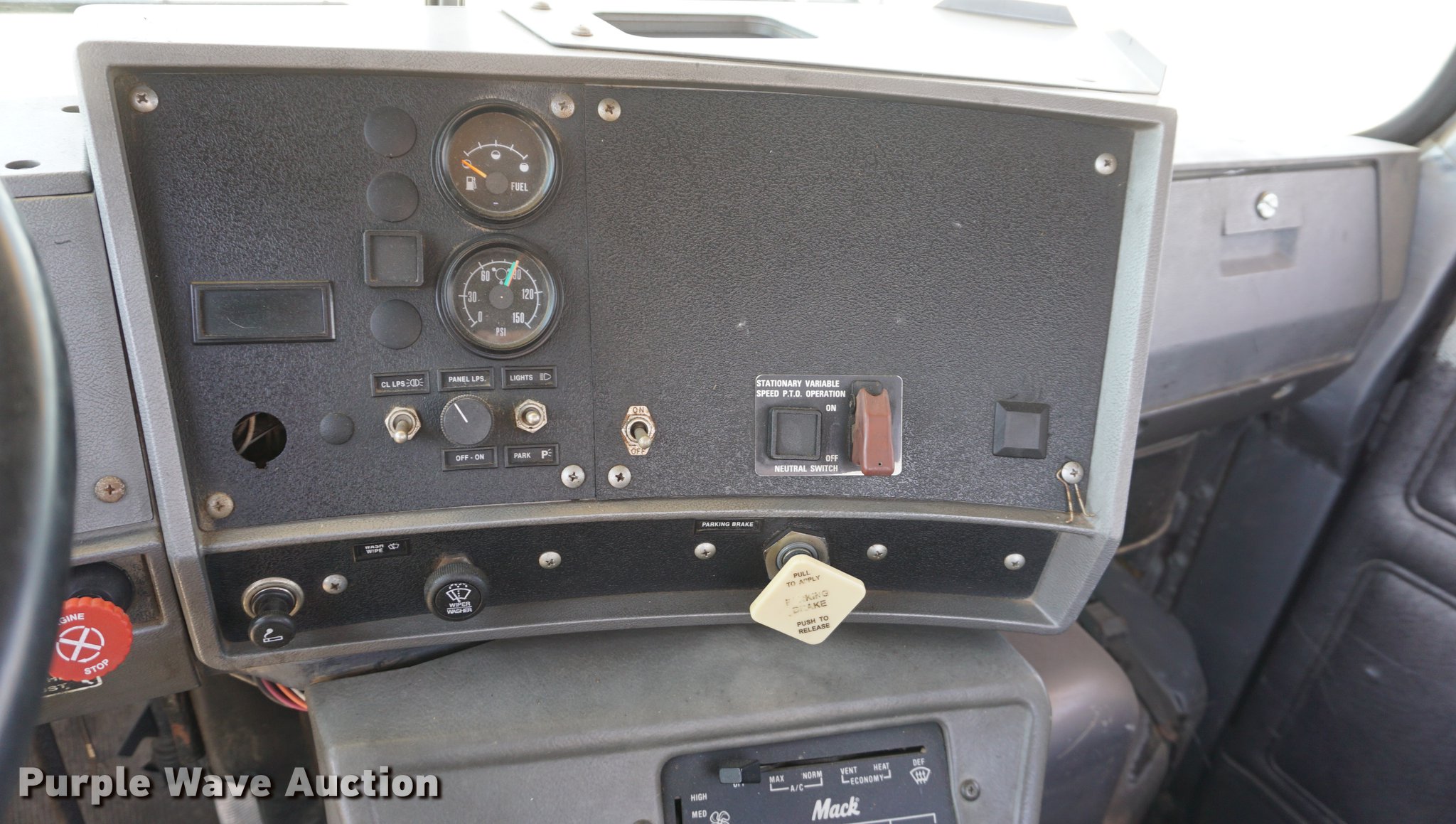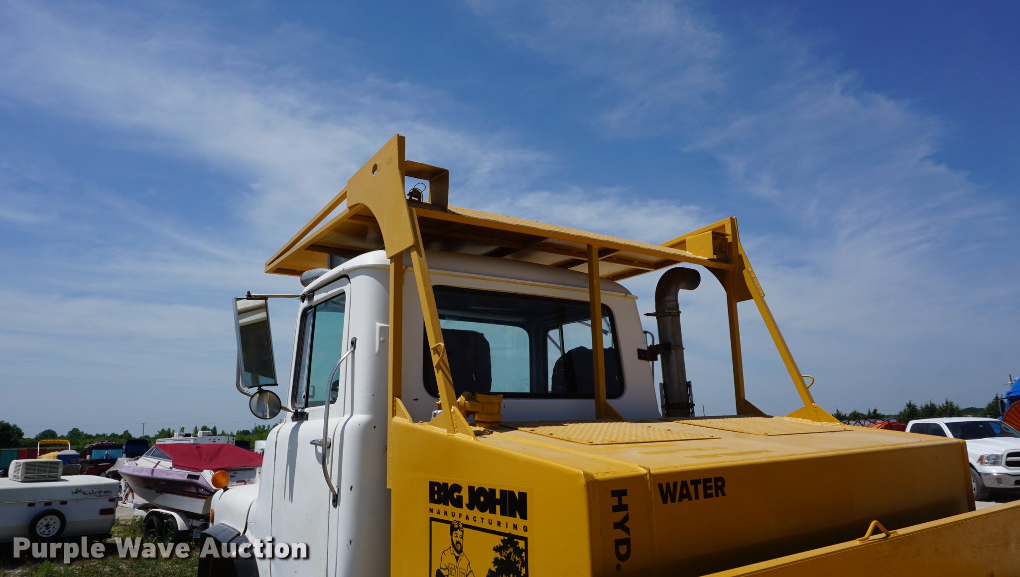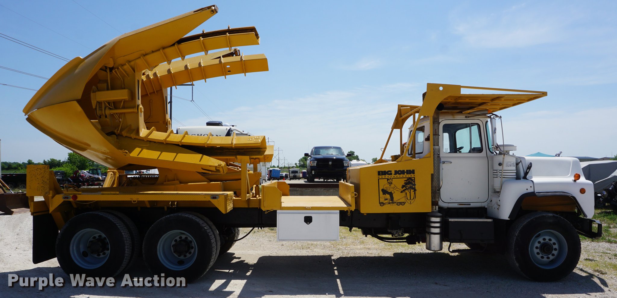 Purple Wave is selling a used Tree Spade in Kansas. This item is a 1998 Mack DM690S truck with Big John tree spade with the following: 127,939 miles on odometer, 8,626 hours on meter, Mack EM7 12.0L L6 turbo diesel engine, 300 HP, Maxitorque seven speed manual transmission, Tandem axle, Inter-axle differential lock, AC and heat, AM/FM, Air suspension seat, PTO, Big John 90B tree spade, 90"W x 60"D root ball capacity, 10" to 12" tree trunk diameter, Serial 412, 400 gallon water tank, Camelback suspension, Air brakes, 385/65R22.5 front tires, 11R22.5 rear tires