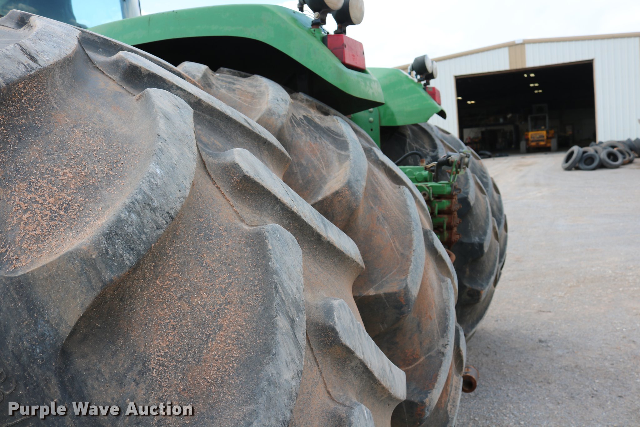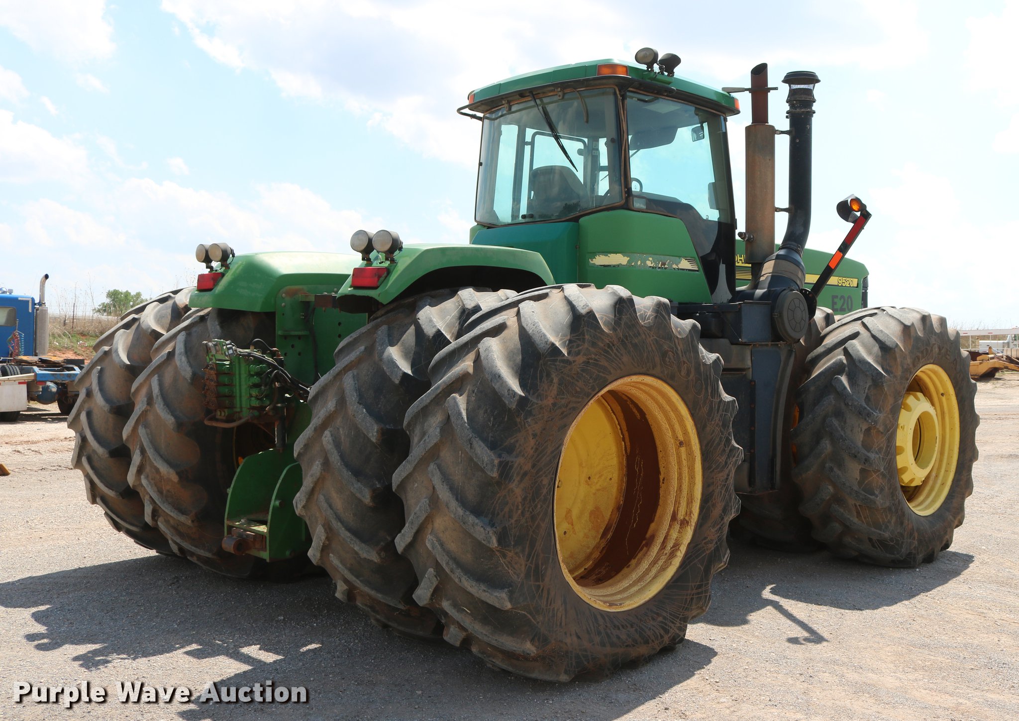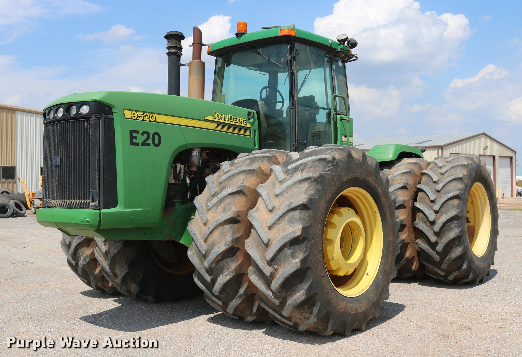 Purple Wave is selling a used Articulated 4-Wheel Drive Tractor in Oklahoma. This item is a 2003 John Deere 9520 Scraper Special 4WD tractor with the following: 13,035 hours on meter, John Deere 6125HRW15A 12.5L six cylinder turbo diesel engine, Powershift transmission, 18F-6R gears, Differential lock, AC, AM/FM, Air suspension seat, Tilt steering wheel, Visors, Seven pin outlet, ISO electrical outlet, (4) rear hydraulic remote sets, (8) wheel weights, 110/70R42 tires, Serial RW9520E011367, Unit# E20