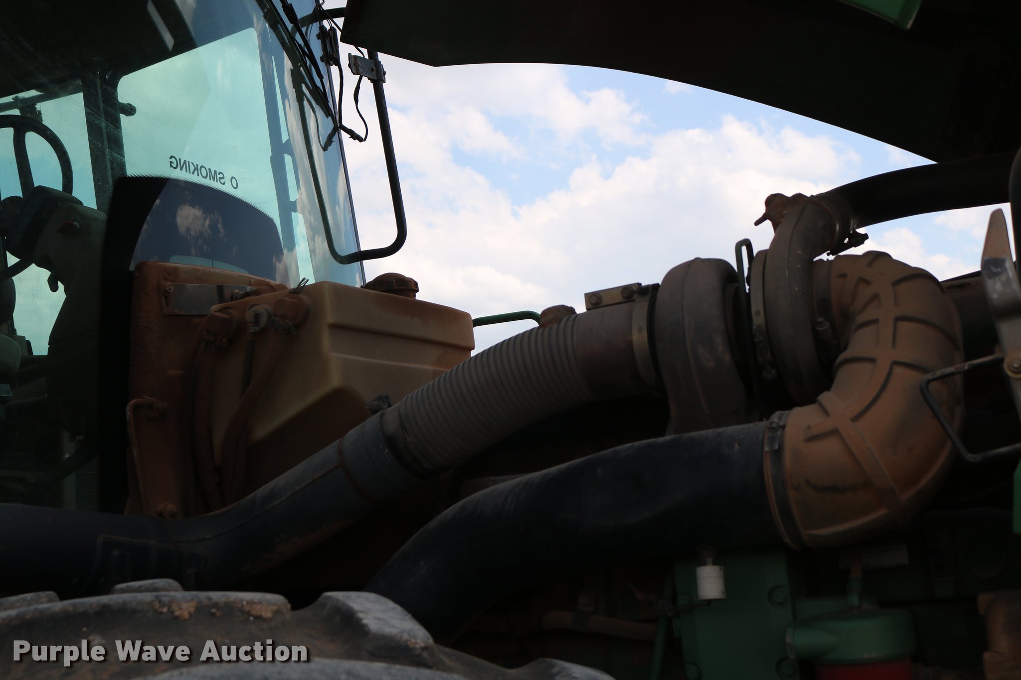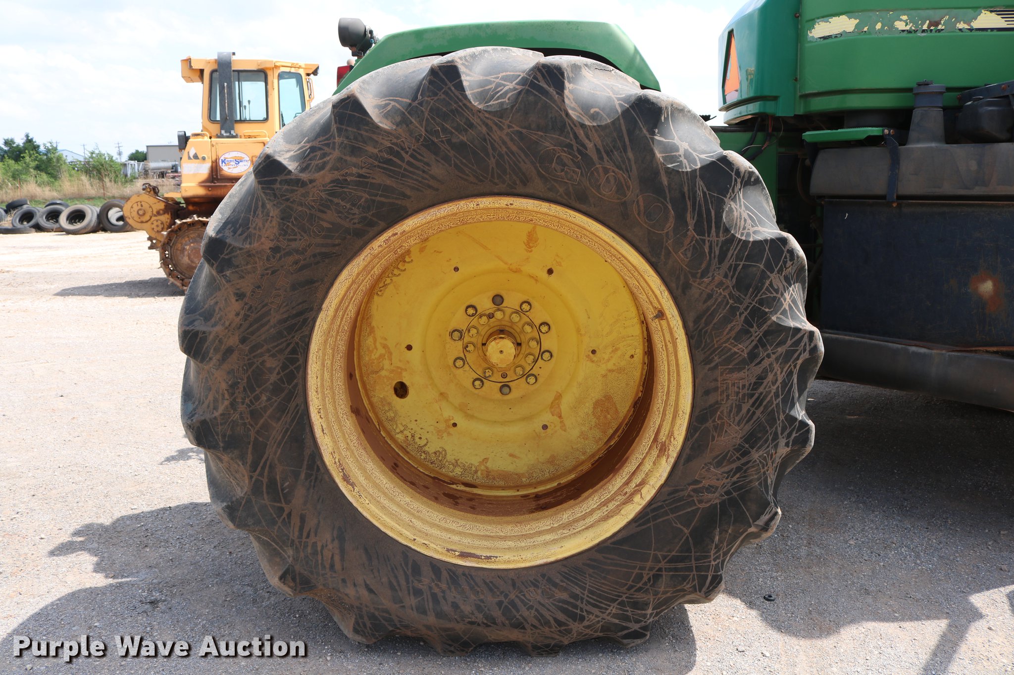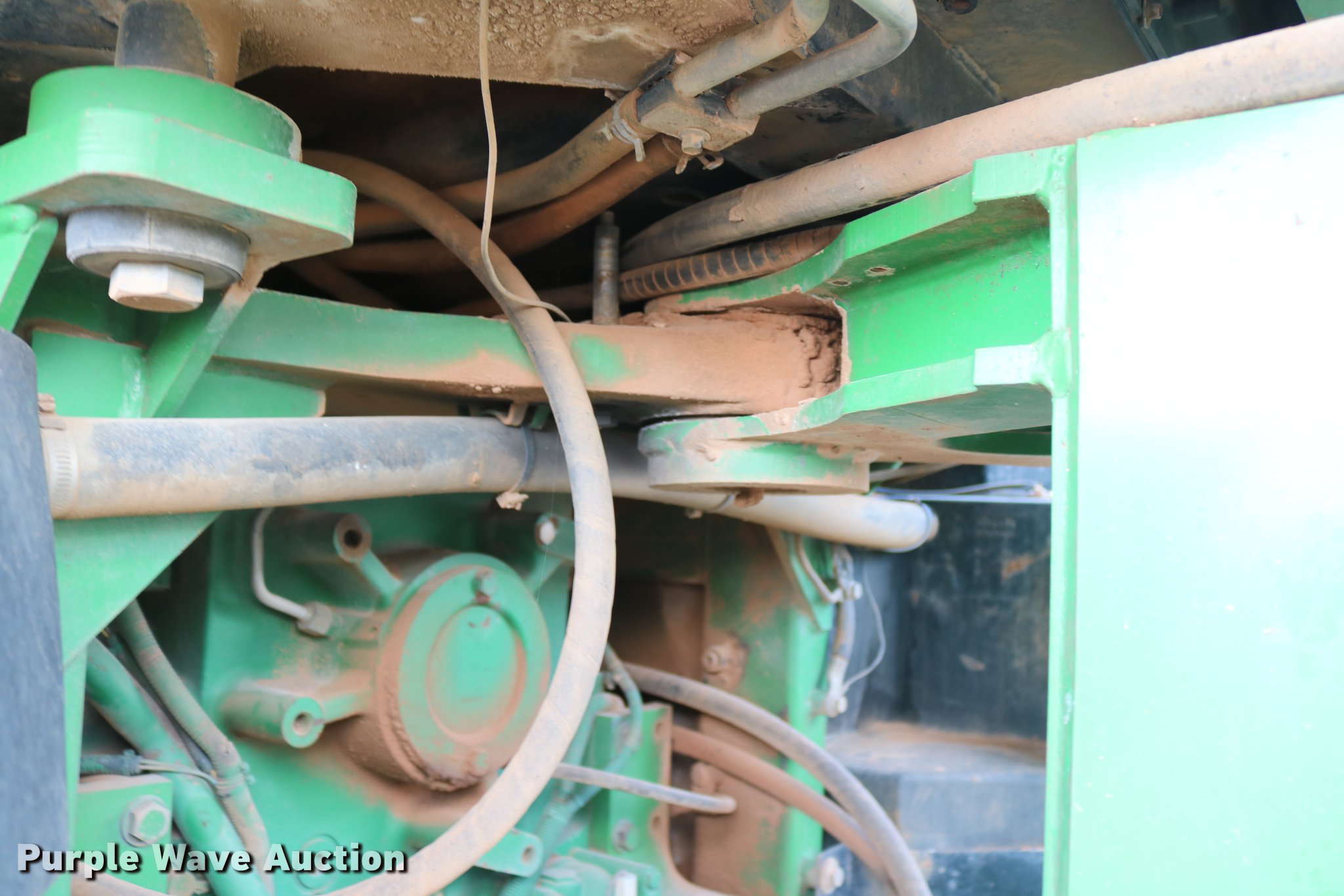 Purple Wave is selling a used Articulated 4-Wheel Drive Tractor in Oklahoma. This item is a 2003 John Deere 9520 Scraper Special 4WD tractor with the following: 13,035 hours on meter, John Deere 6125HRW15A 12.5L six cylinder turbo diesel engine, Powershift transmission, 18F-6R gears, Differential lock, AC, AM/FM, Air suspension seat, Tilt steering wheel, Visors, Seven pin outlet, ISO electrical outlet, (4) rear hydraulic remote sets, (8) wheel weights, 110/70R42 tires, Serial RW9520E011367, Unit# E20