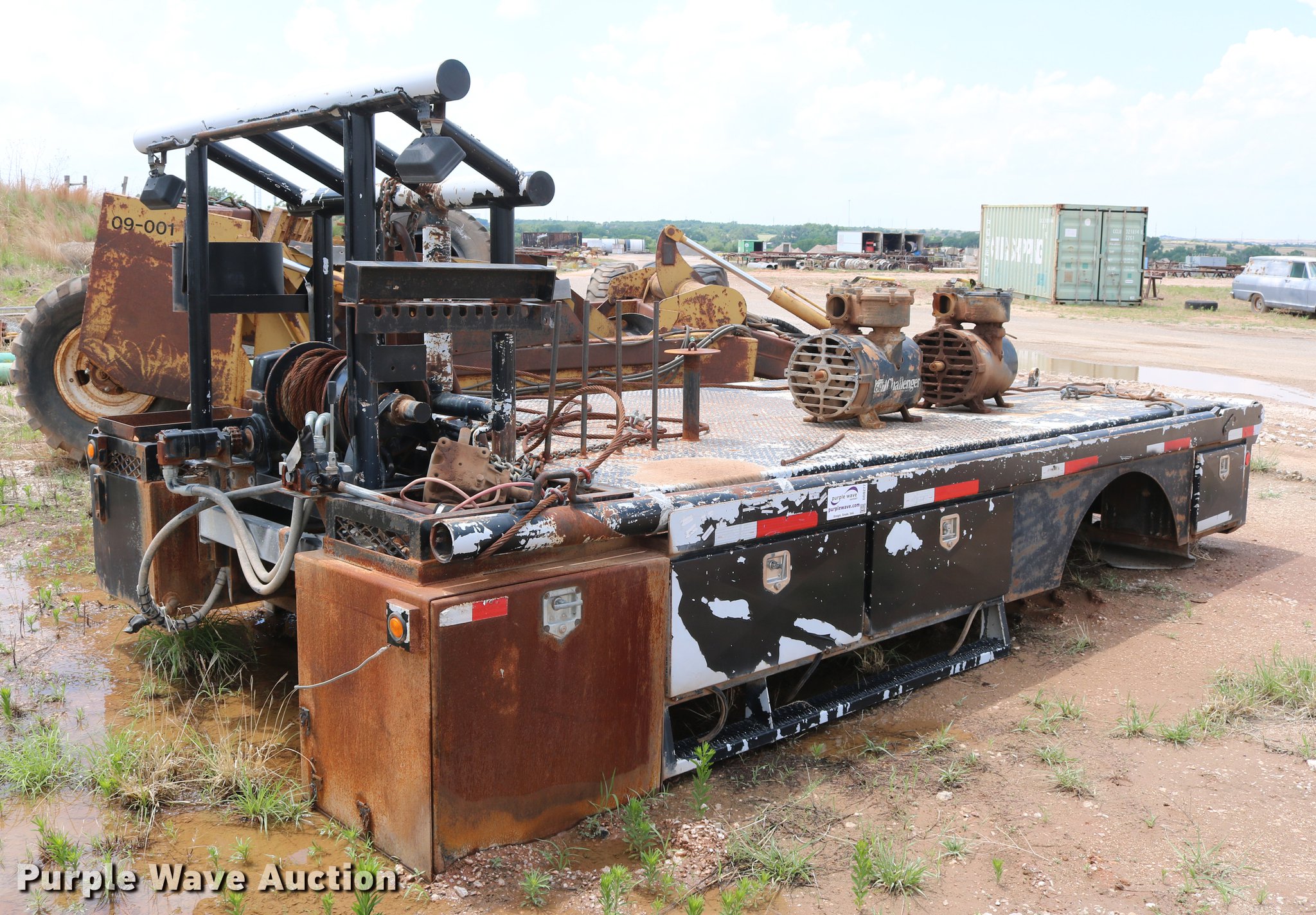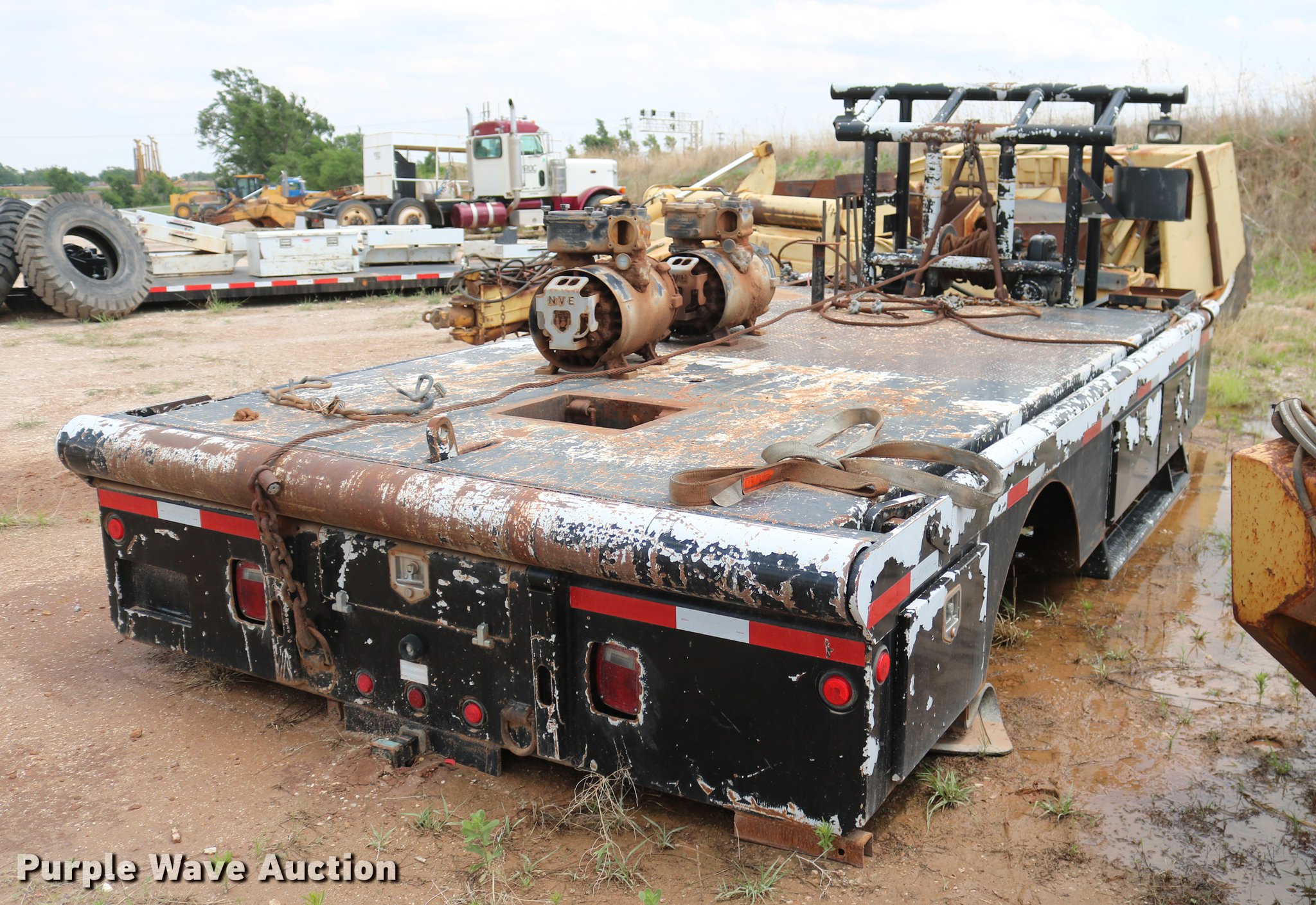 Purple Wave is selling a used Truck Part and Attach. in Oklahoma. This item is a Flatbed with the following: 19.5'L x 96"W, Headache rack, Work lights, Rufneck hydraulic winch, Hydraulic reservoir, Toolboxes, Cut out for gooseneck hitch, Receiver hitch