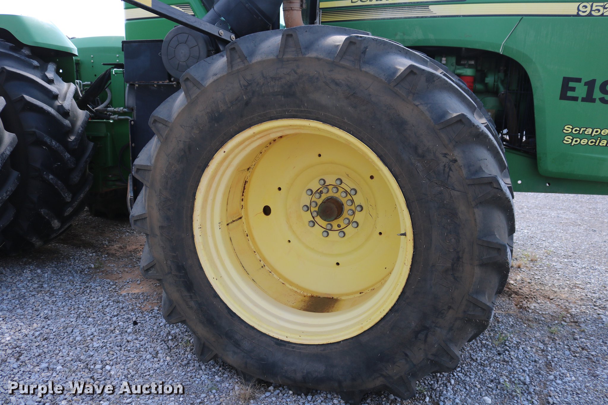 Purple Wave is selling a used Articulated 4-Wheel Drive Tractor in Oklahoma. This item is a 2006 John Deere 9520 Scraper Special 4WD tractor with the following: 7,841 hours on meter, John Deere 6125HRW1TA 12.5L six cylinder turbo diesel engine, 450 HP, Powershift transmission, 18F-6R gears, Differential lock, AC and heat, AM/FM, Air suspension seat, Instructor's seat, Tilt steering wheel, Shades, Seven pin outlet, ISO electrical outlet, (4) rear hydraulic remote sets, 110/70R42 dual tires, Transmission issues, Serial RW9520E041242, Unit# E19