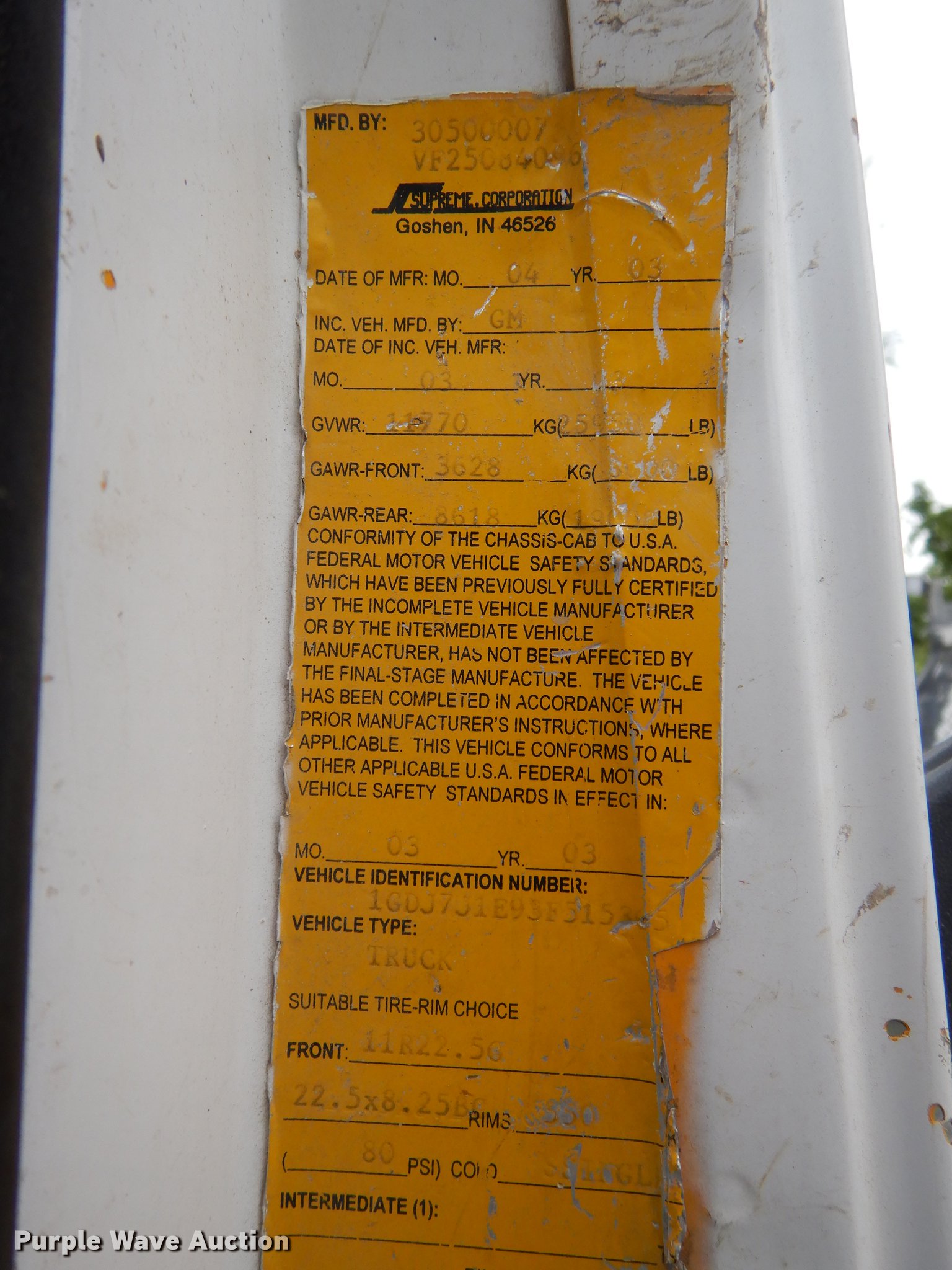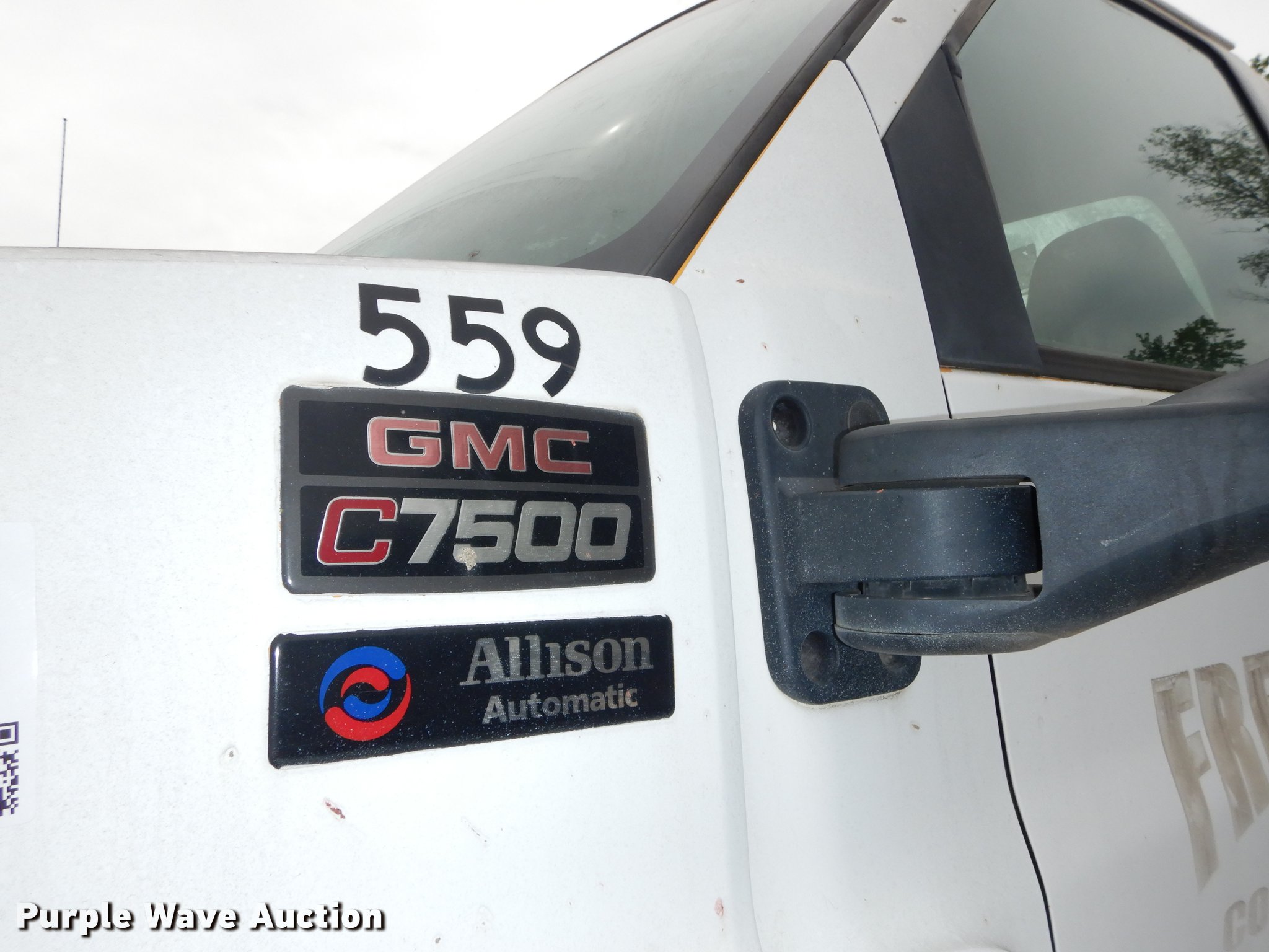 Purple Wave is selling a used Truck Chassis in Kansas. This item is a 2003 GMC C7500 truck cab and chassis with the following: Unknown miles on odometer, 8.1L V8 gas engine, Allison automatic transmission, Single axle, Heat, AM/FM, Single fuel tank, 224" wheelbase, Spring suspension, Hydraulic brakes, 11R22.5 tires, GVWR 25,950 lbs, Non-operational engine, No tail lights