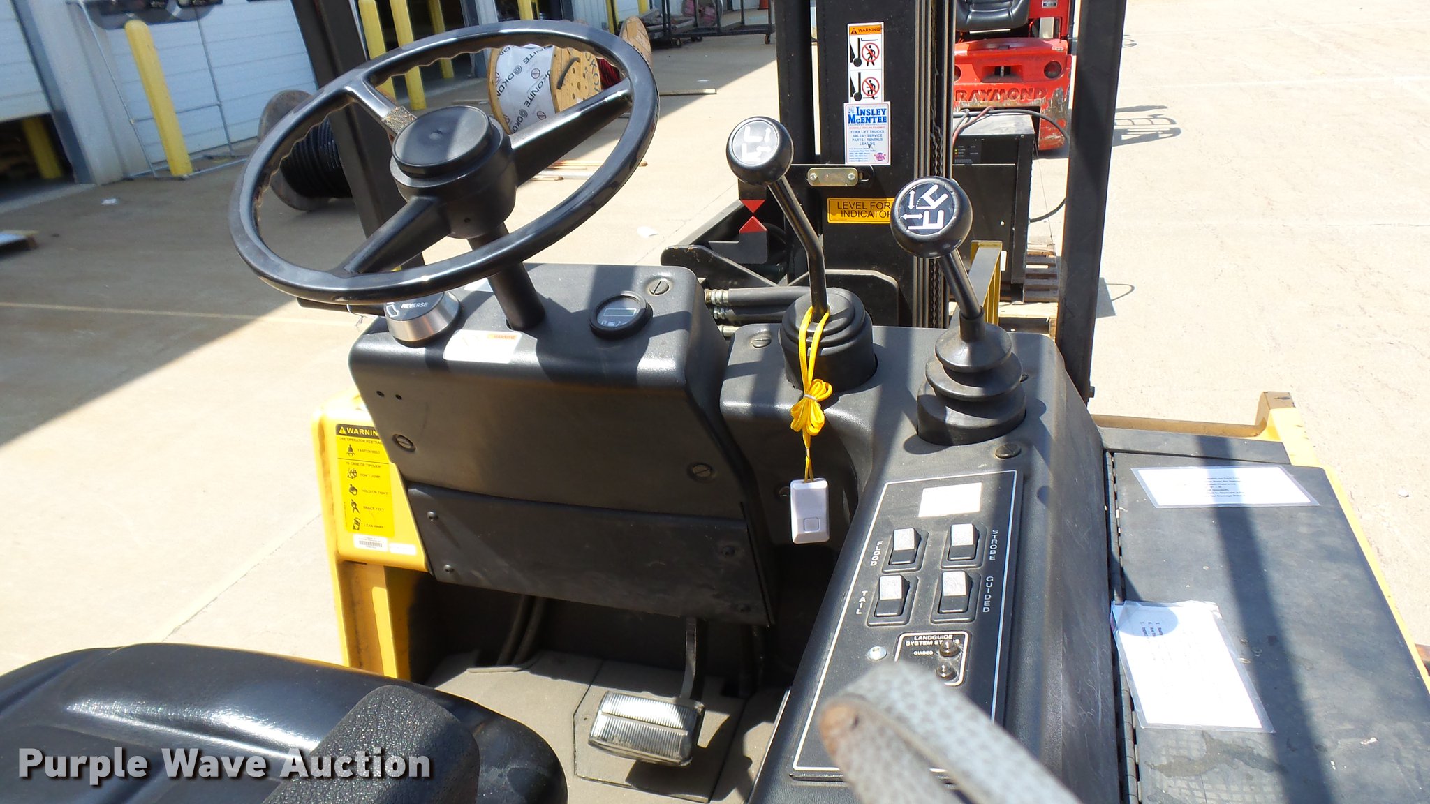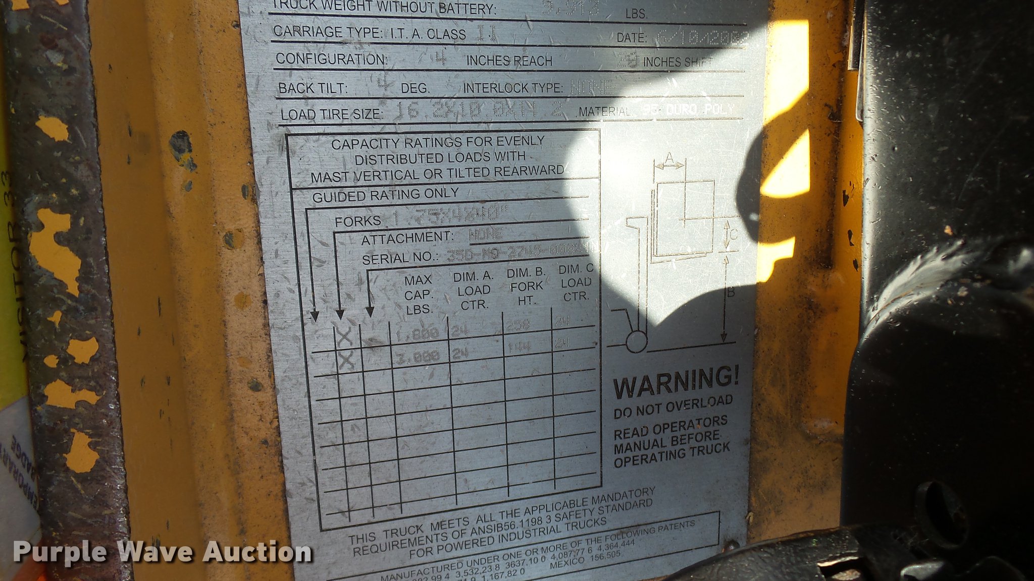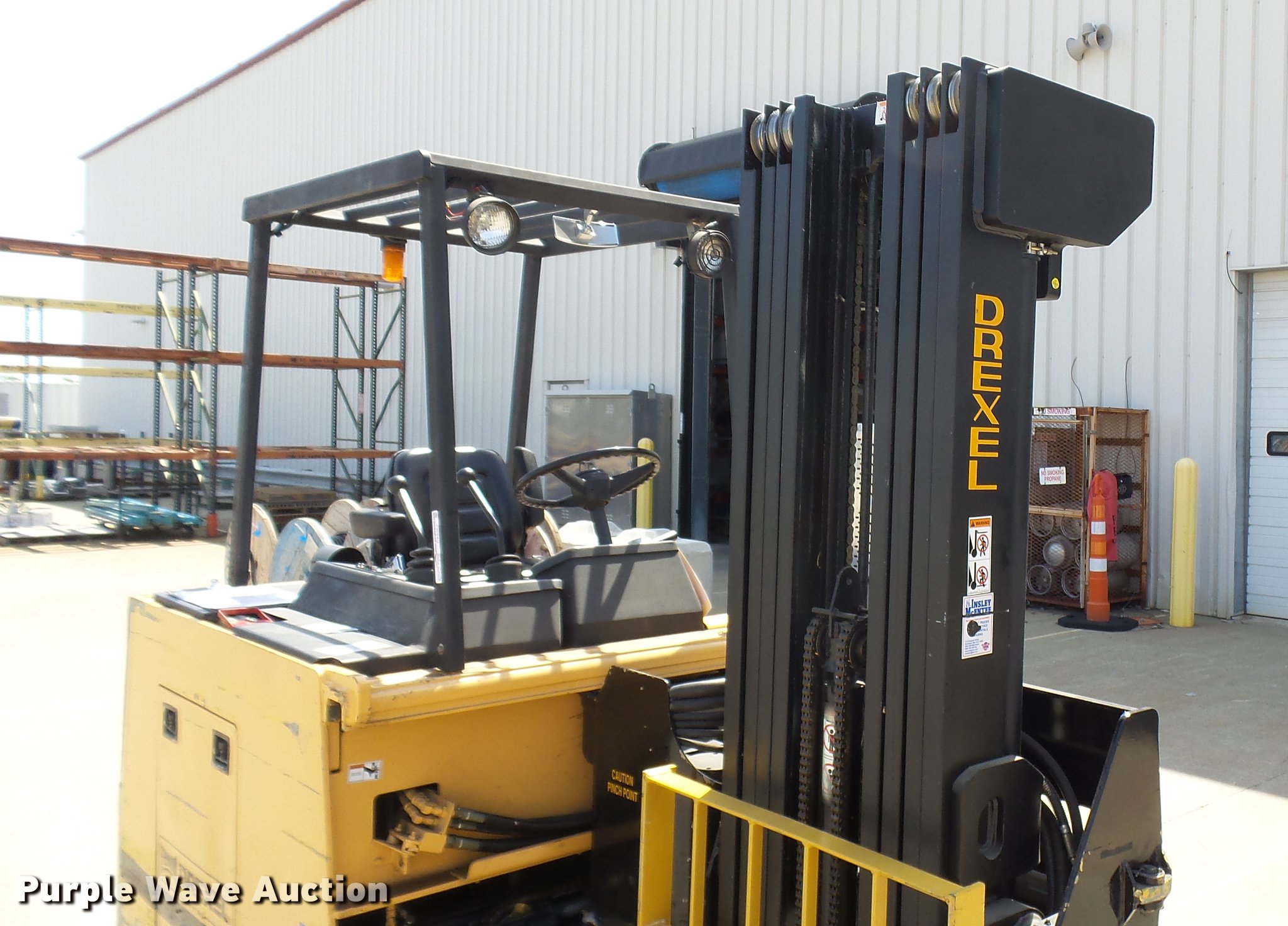Purple Wave is selling a used Warehouse Forklift in Missouri. This item is a 2002 Drexel SLT30R forklift with the following: 40 hours on meter, 36V operation, 1F-1R gears, OROPS, Worklights, Backup alarm, 3,000 lbs maximum lift capacity at 144" lift height, 1,800 lbs maximum lift capacity at 258" lift height, 144" maximum lift height, 40" fork length, Four mast stages, Side shift, Mast tilt, Hydraulic leveling, Swing carriage, Charger, 37215-12 solid front tires, 18 x 7 solid rear tires, Serial 462000D31002