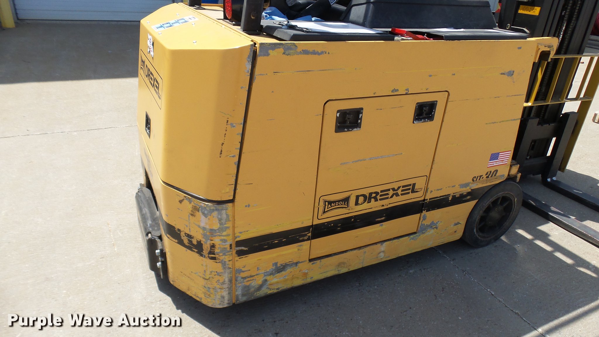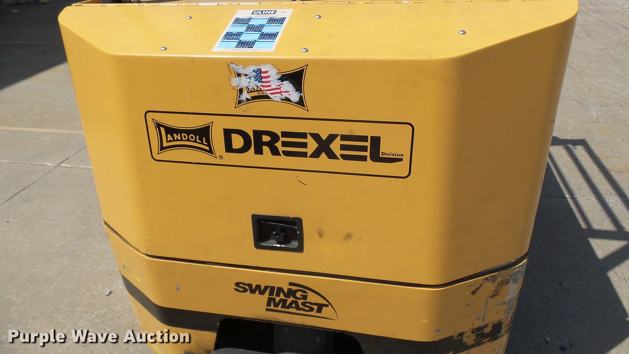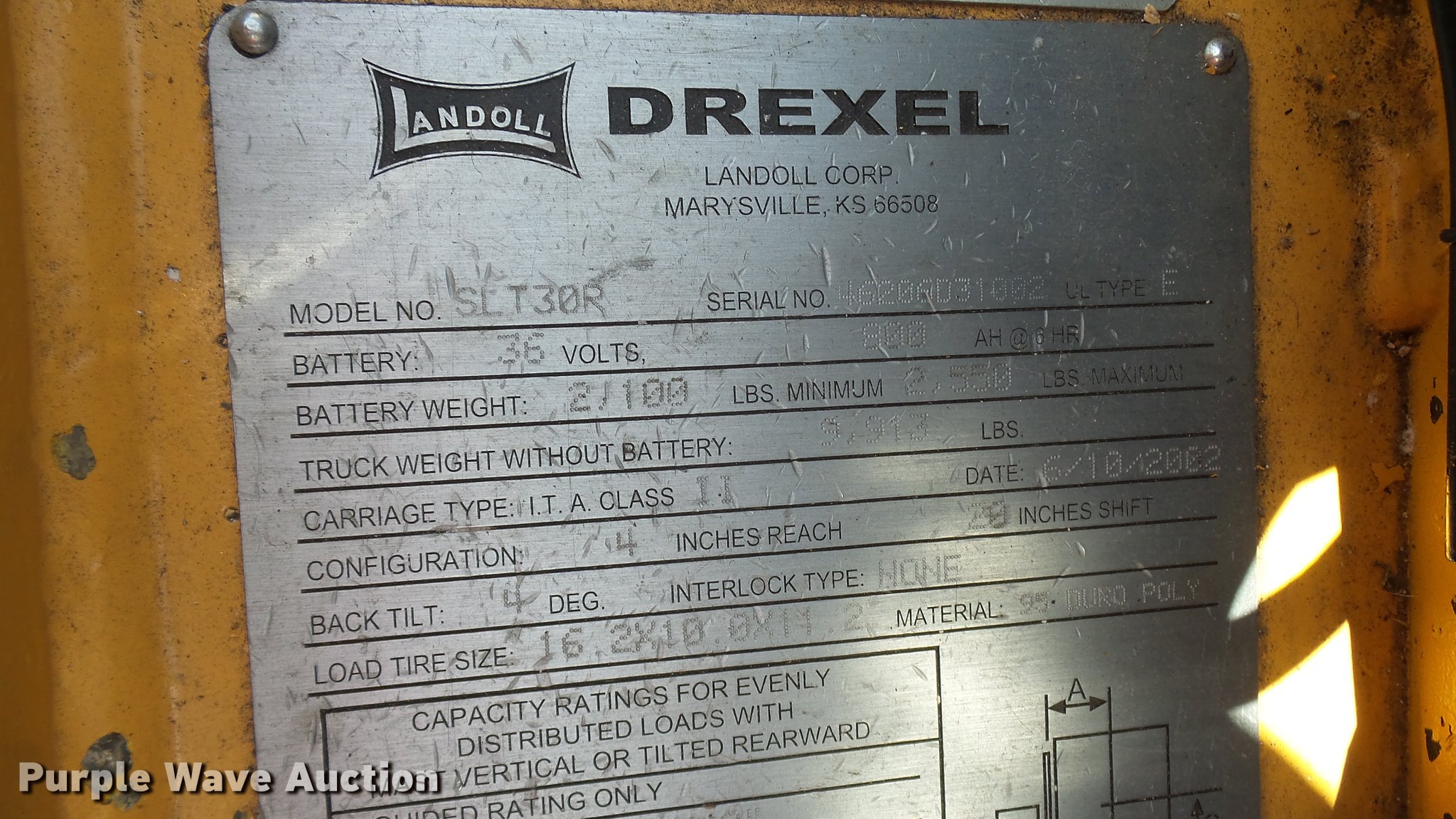 2002 Drexel SLT30R forklift. 40 hours on meter, 36V operation, 1F-1R gears, OROPS, Worklights, Backup alarm, 3,000 lbs maximum lift capacity at 144" lift height, 1,800 lbs maximum lift capacity at 258" lift height, 144" maximum lift height, 40" fork length, Four mast stages, Side shift, Mast tilt, Hydraulic leveling, Swing carriage, Charger, 37215-12 solid front tires, 18 x 7 solid rear tires, Serial 462000D31002. Alstom Signaling Operation. 609A N. Enterprise Dr.. Warrensburg, MO 64093