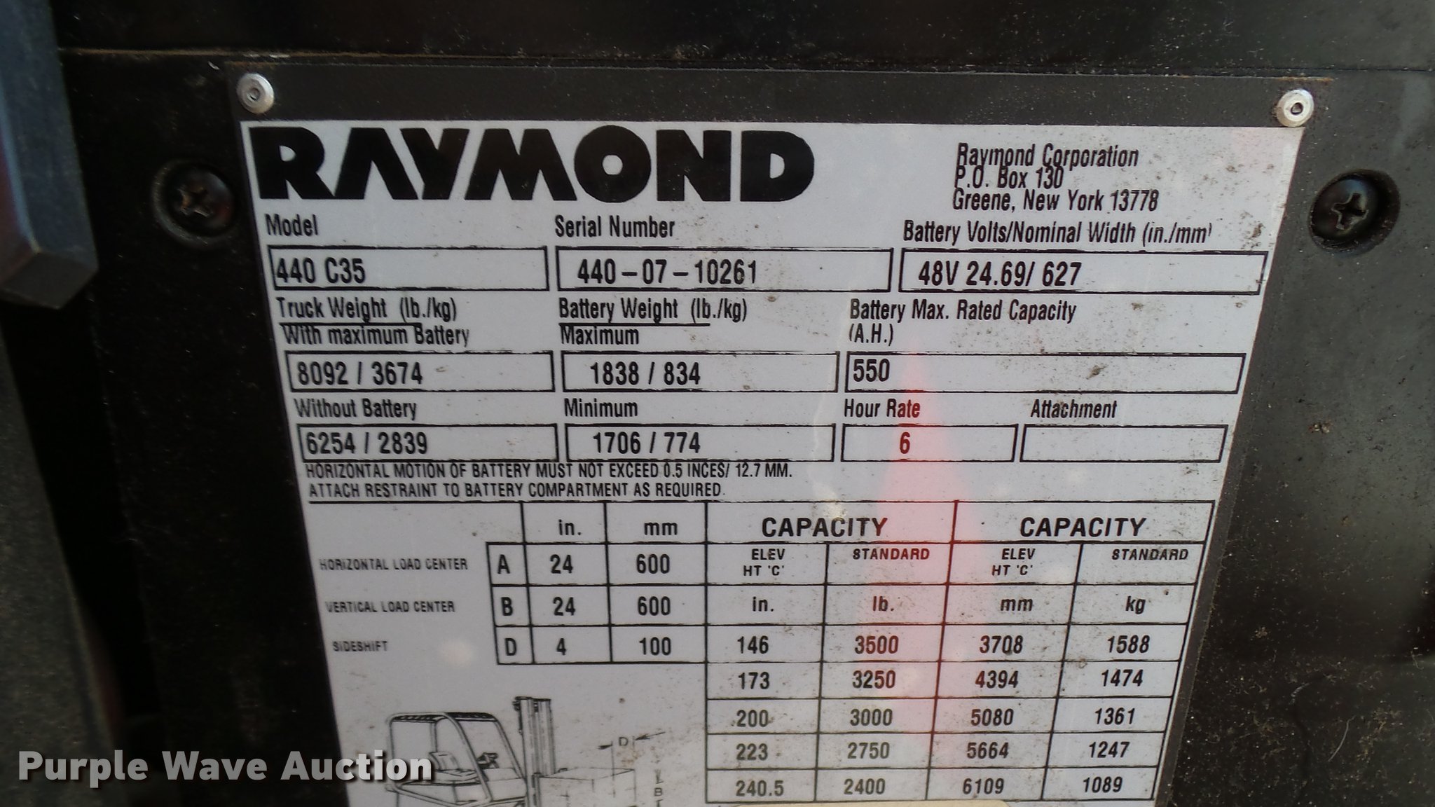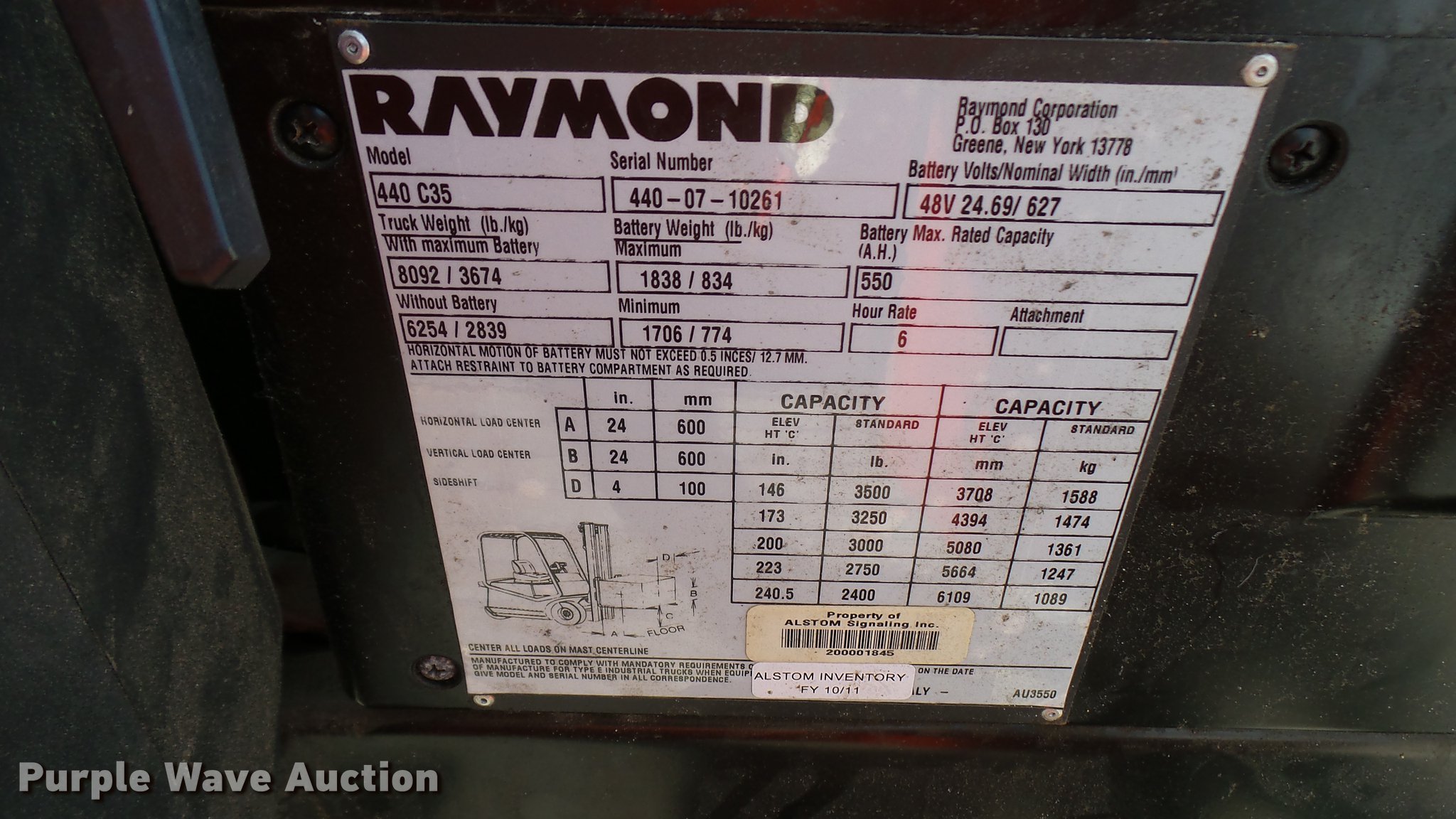 Raymond 440-C35 forklift. 2,711 hours on meter, 48V operation, 1F-1R gears, OROPS, Work lights, Backup alarm, 3,500 lbs maximum lift capacity, 180" maximum lift height, 42" fork length, Side shift, Mast tilt, Charger, 18 x 7 x 12 solid front tires, 16 x 6 x 10.5 solid rear tires, Serial 440-07-10261, Unit# 10. Alstom Signaling Operation. 609A N. Enterprise Dr.. Warrensburg, MO 64093
