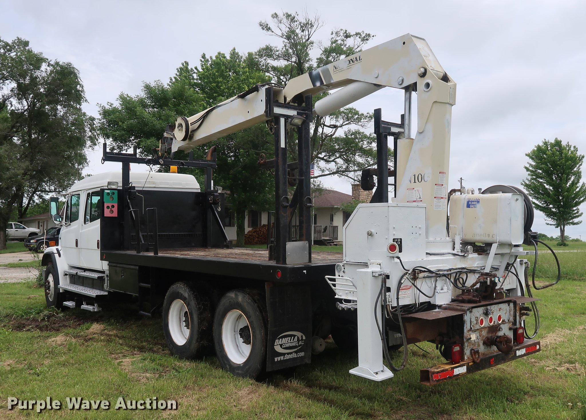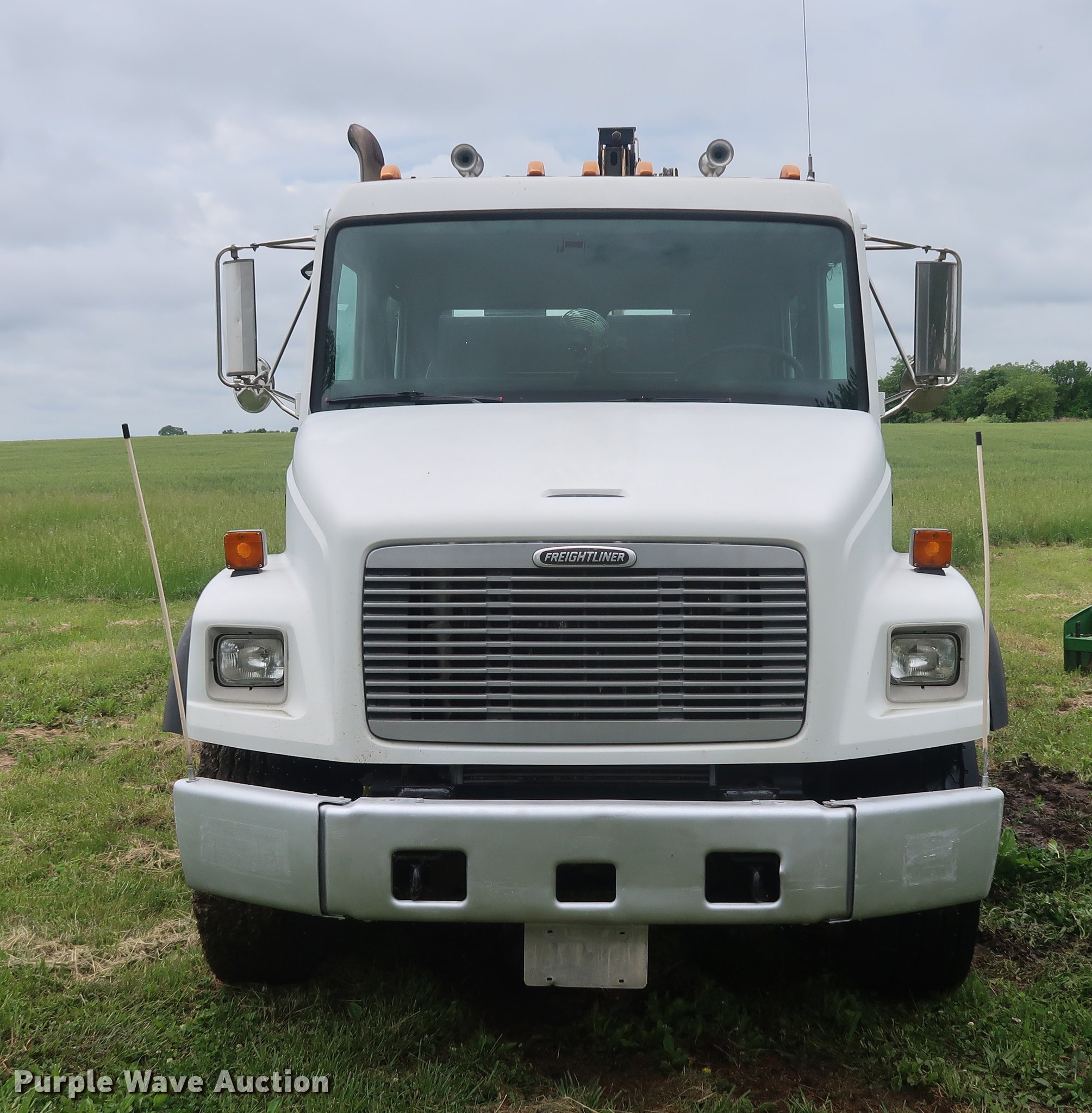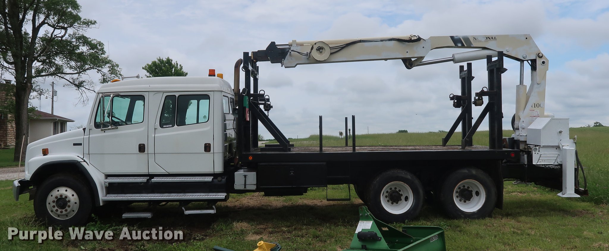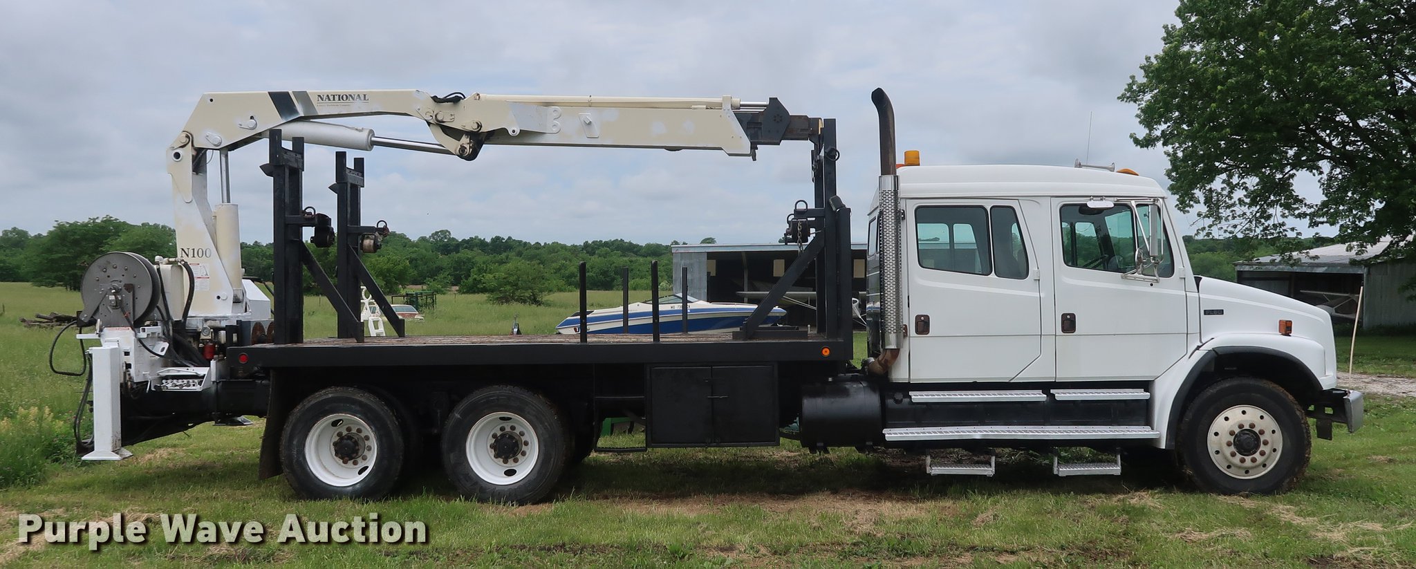 Purple Wave is selling a used Crane Truck in Missouri. This item is a 2002 Freightliner FL80 Crew Cab crane truck with the following: 177,142 miles on odometer, Caterpillar 3126 7.2L L6 turbo diesel engine, Serial CKM40050, Eaton Fuller 10 speed manual transmission, Tandem axle, Heat, Cruise, AM/FM, PTO, 16'L x 8'W flatbed, National N100 crane, Auxiliary hydraulics, Hydraulic outriggers, Toolbox, Single exhaust stack, Spring suspension, Air brakes, 315/80R22.5 front tires, 11R22.5 rear tires