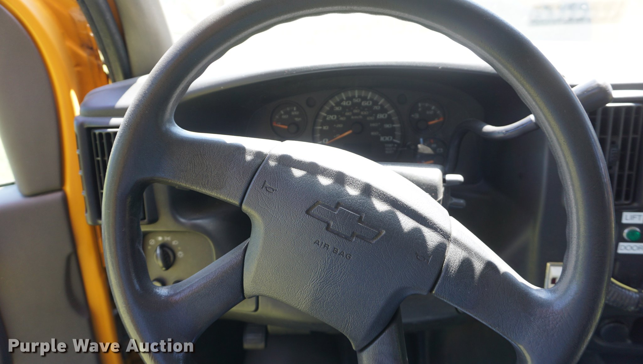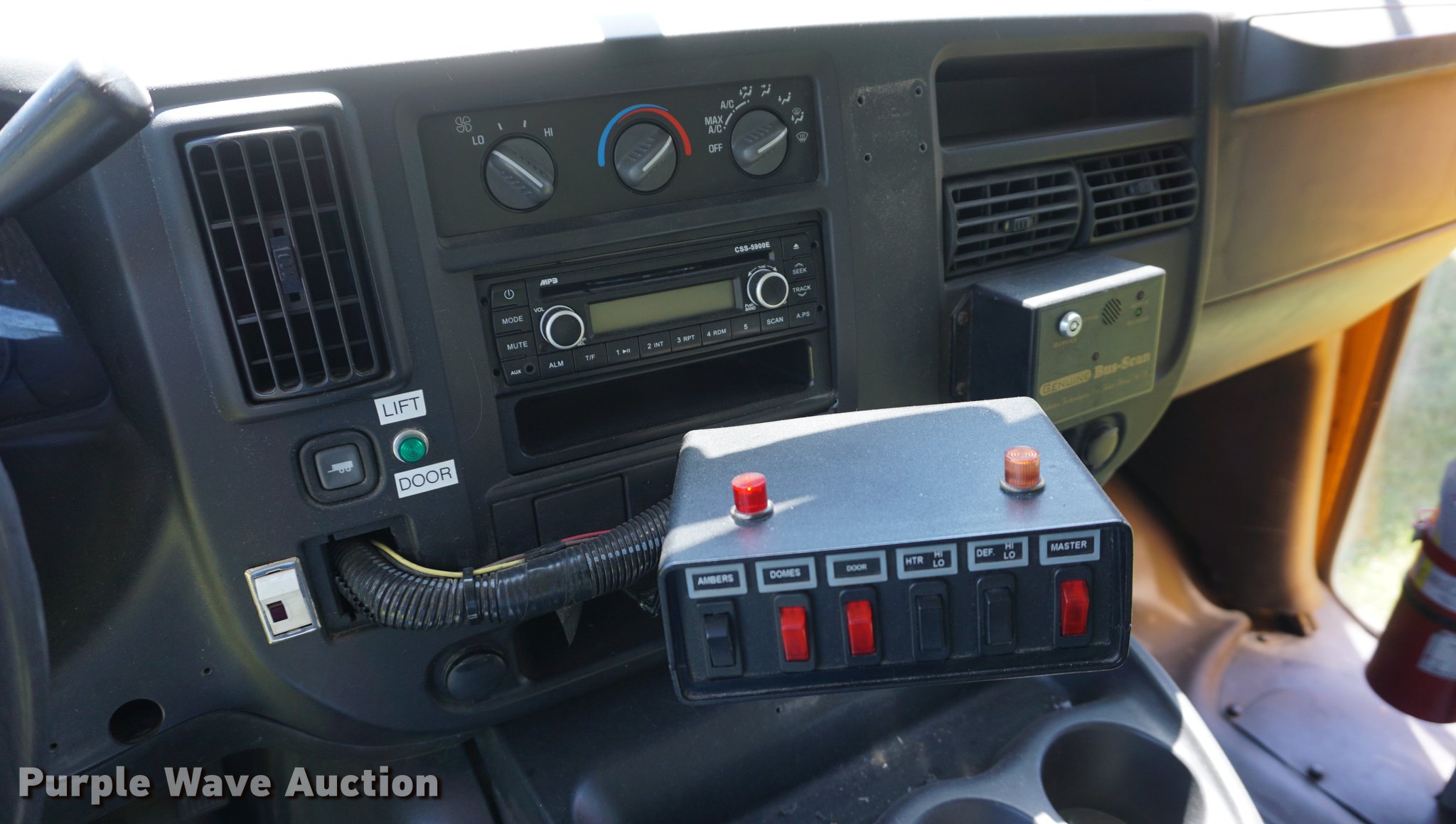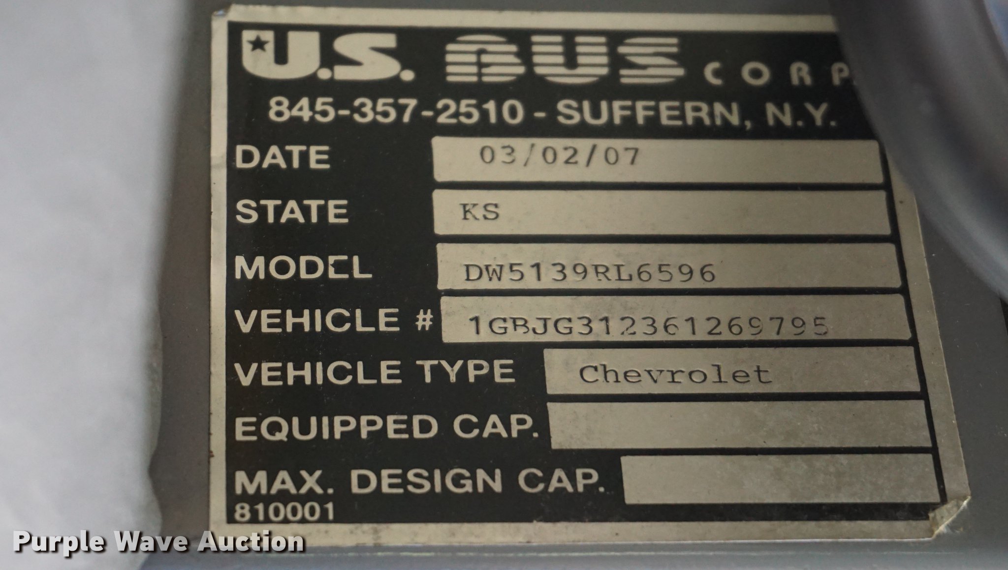 Purple Wave is selling a used Bus in Kansas. This item is a 2006 Chevrolet Express 3500 Cargo bus with the following: 136,819 miles on odometer, 6.6L V8 OHV 32V turbo diesel engine, Automatic transmission, Single axle, AC and ehat, AM/FM, 15 passenger capacity, Braun NL9171B wheel chair lift, Serial B5-04089, Single wheel chair tie-down area, Ceiling, front, rear, and side emergency exits, Stop sign, Spring suspension, Hydraulic brakes, 225/75R16 tires, GVWR 12,300 lbs, Power steering leak, Unit# 32
