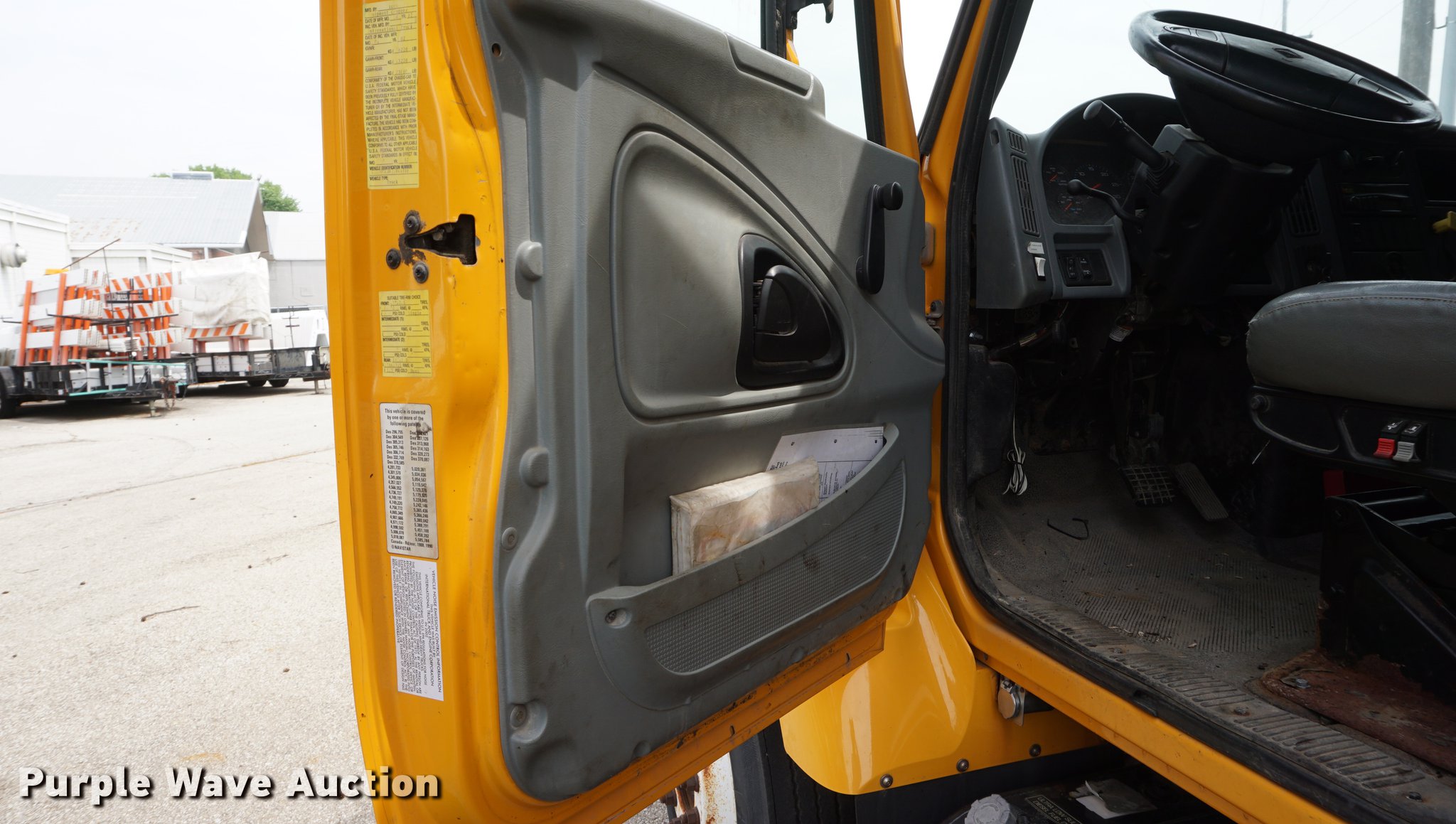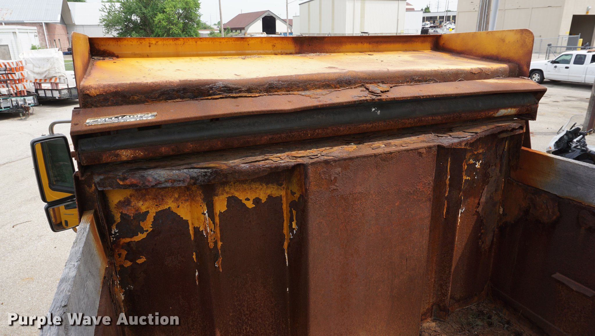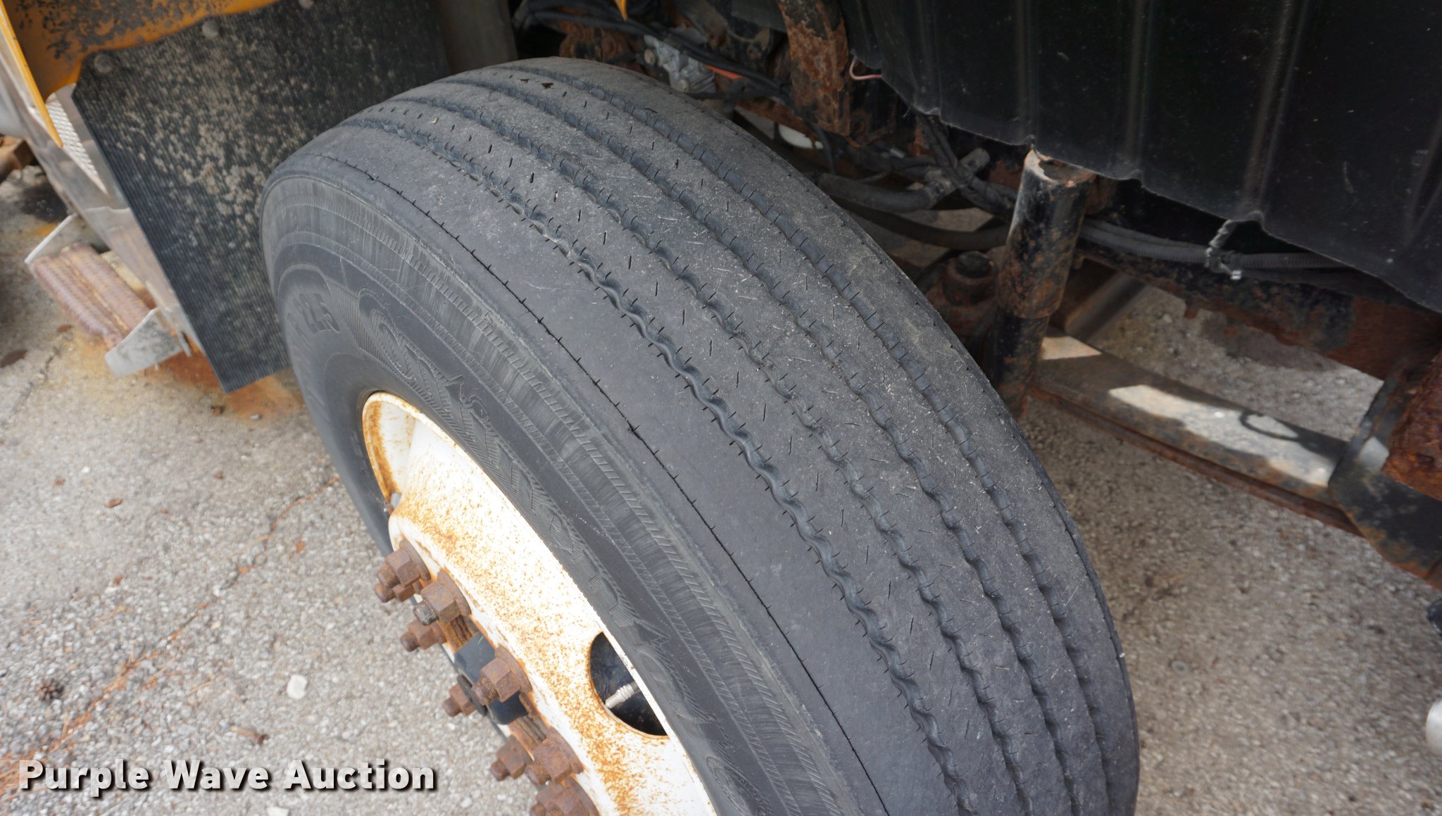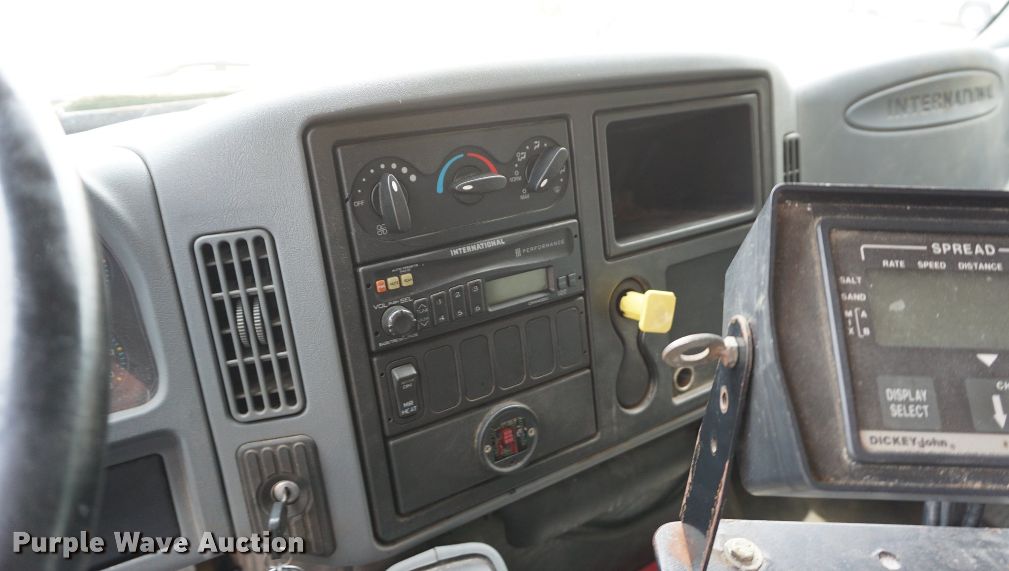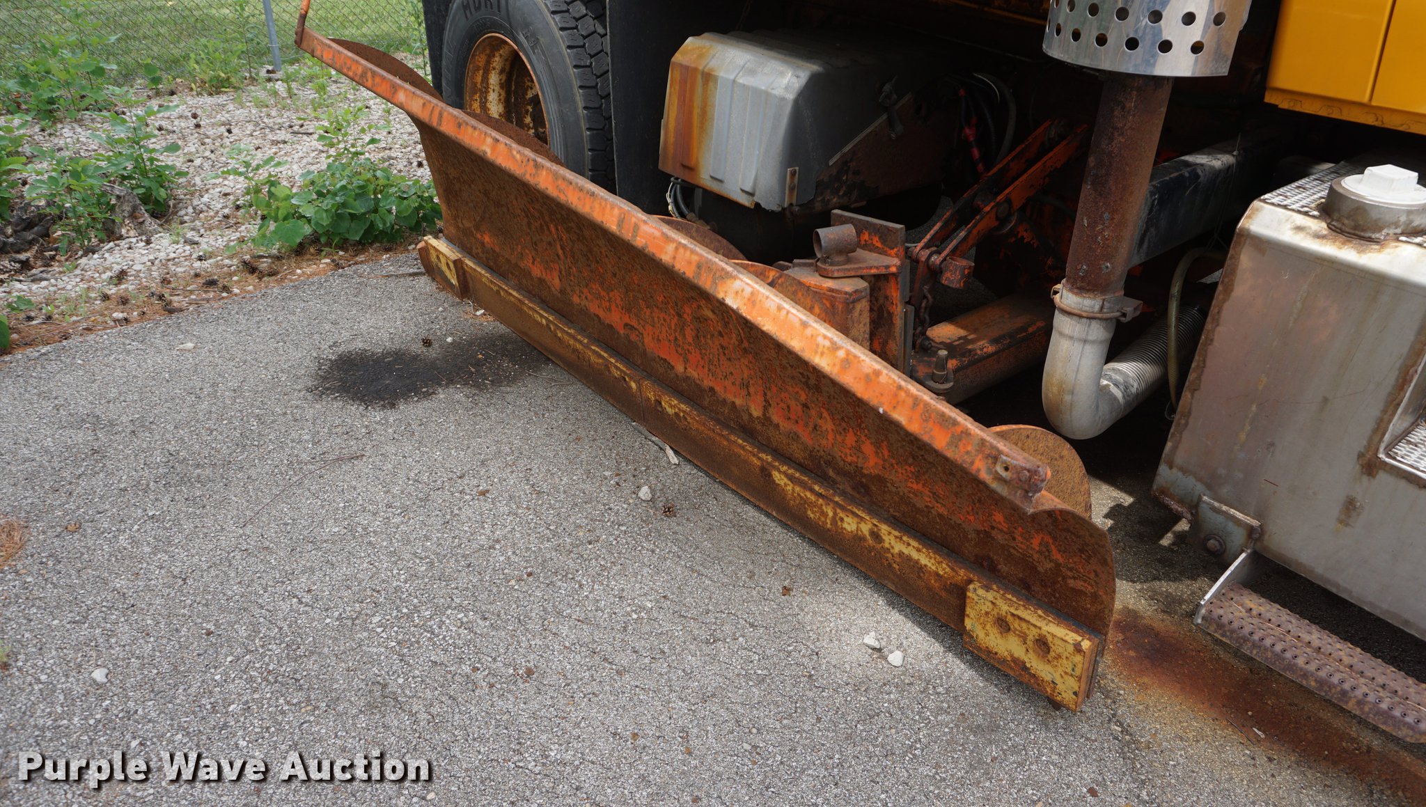 Purple Wave is selling a used Construction Dump Truck in Kansas. This item is a 2002 International 7400 dump truck with the following: 52,800 miles on odometer, 3,875 hours on meter, International DT530 8.7L L6 turbo diesel engine, Allison automatic transmission, Single axle, AC and heat, AM/FM, Heated mirrors, Air suspension seat, PTO, 10'L x 95"W steel dump bed, 34" side height, 9" side board height, 32" conveyor chain in bed, Single ram hoist, Air operated end gate, Viking 11'W plow, Coats 8'W wing plow, Stainless steel magnesium tank, Single spinner, Spring suspension, Air brakes, 11R22.5 tires, GVWR 36,220 lbs, FAWR 13,220 lbs, RAWR 23,000 lbs, Dead battery, Unit# 8129