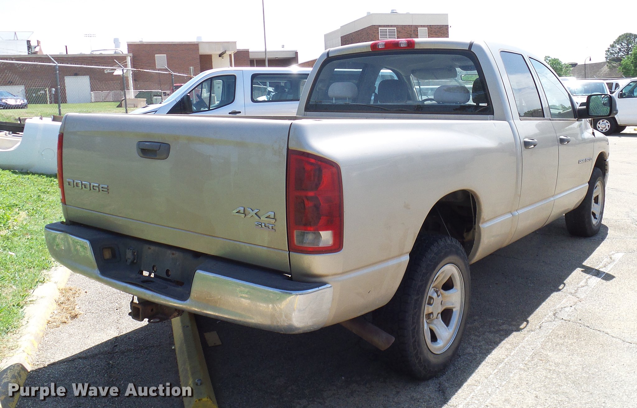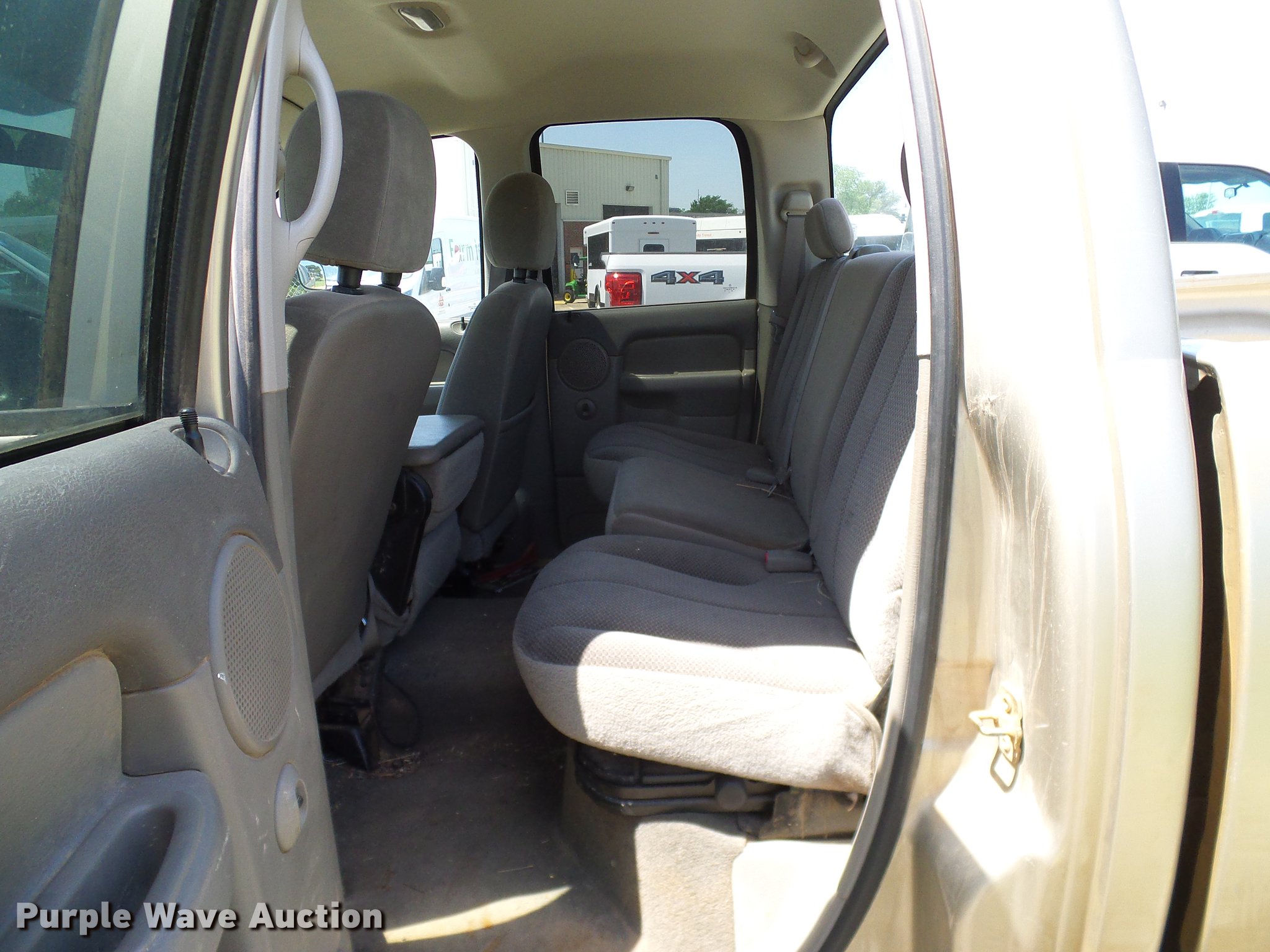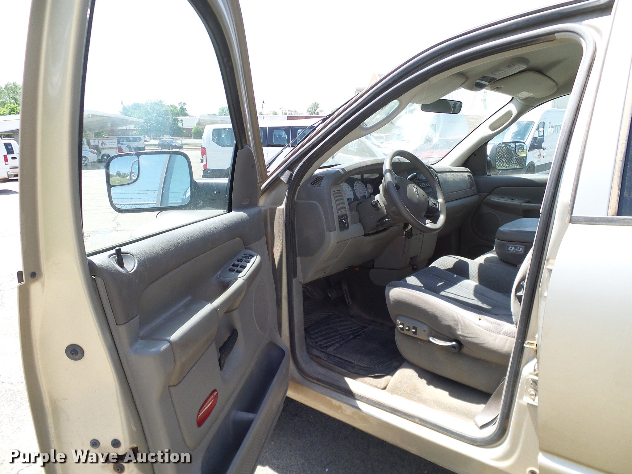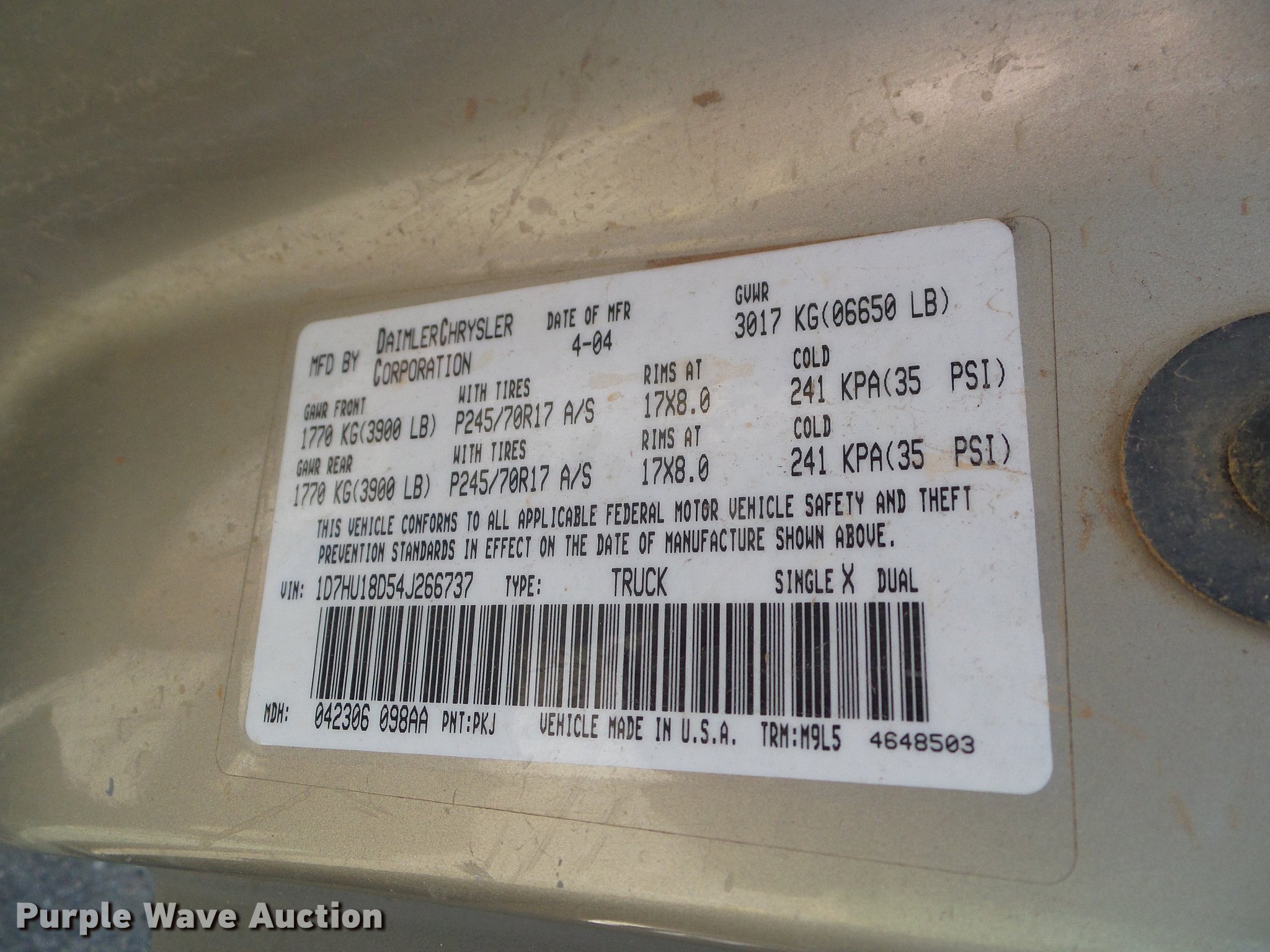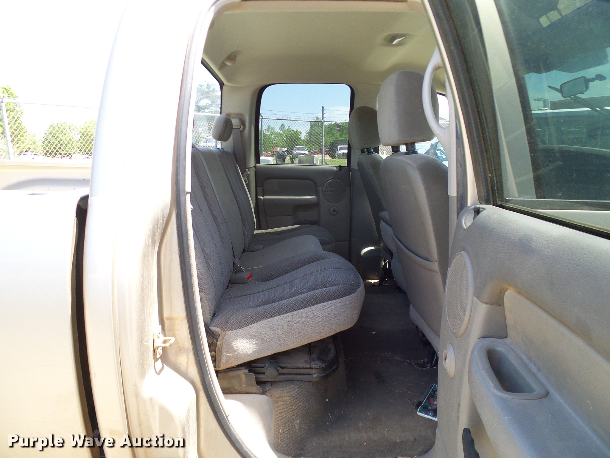 Purple Wave is selling a used 1/2 Ton Pickup or Van in Oklahoma. This item is a 2004 Dodge Ram 1500 Quad Cab pickup truck with the following: 146,472 miles on odometer, 5.7L V8 OHV 16V gas engine, Automatic transmission, Four wheel drive, AC and heat, Tilt, Cruise, AM/FM/CD, Power windows, locks, mirrors, and seat, Cloth interior, Fog lights, Front tow hooks, Receiver hitch, Trailer wiring, Hankook 245/70R17 tires, Dead battery, Sale# 1901-KP, Unit# 360