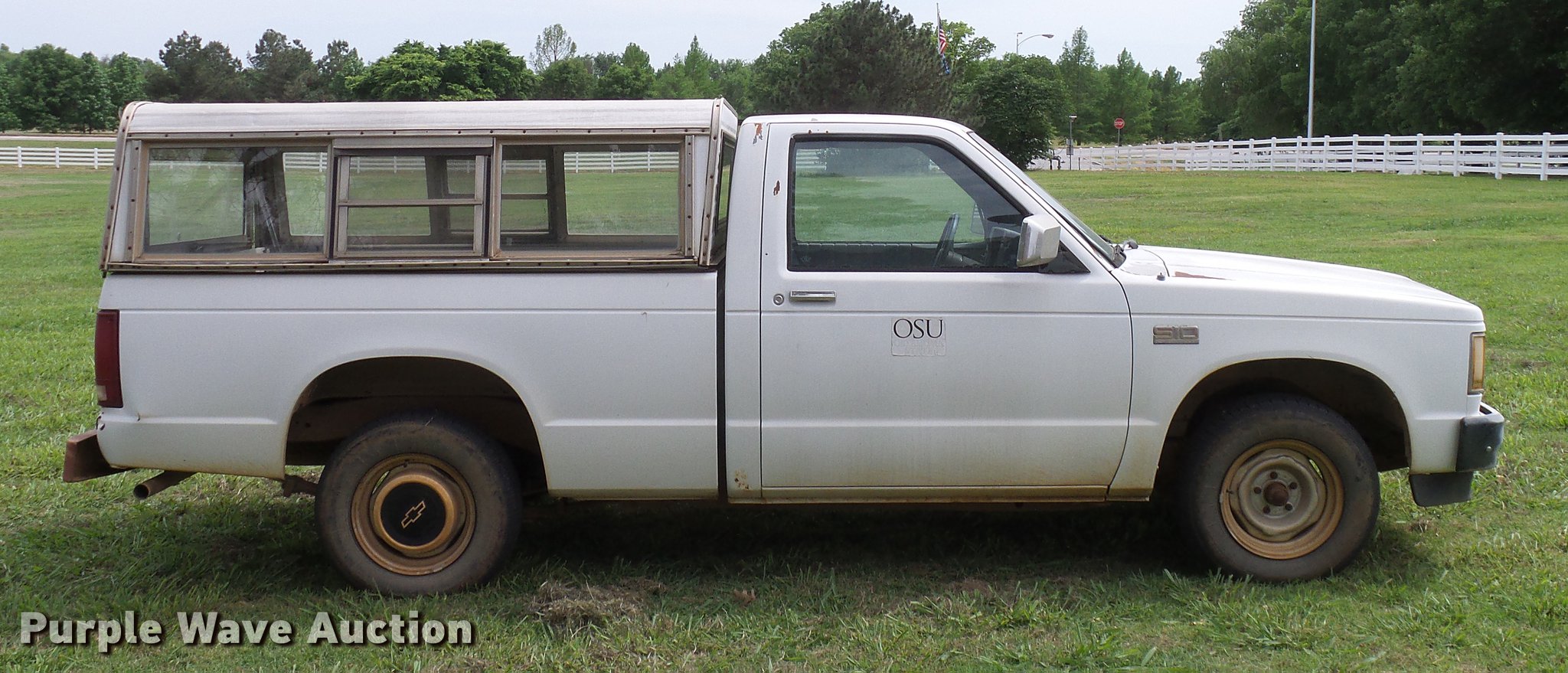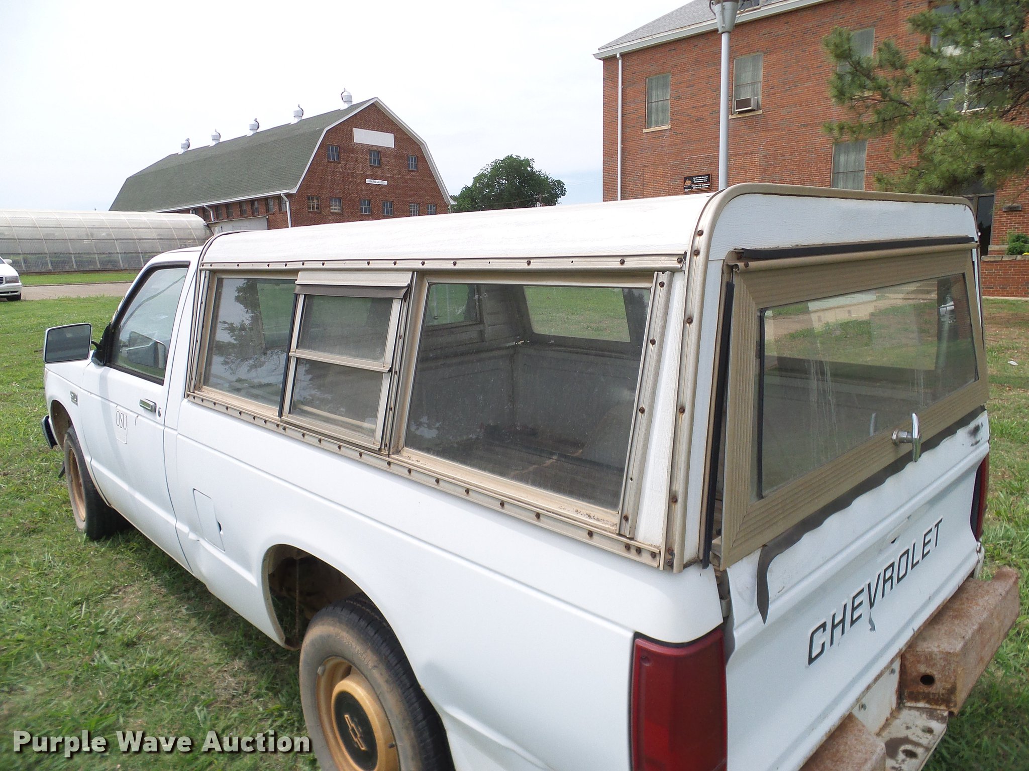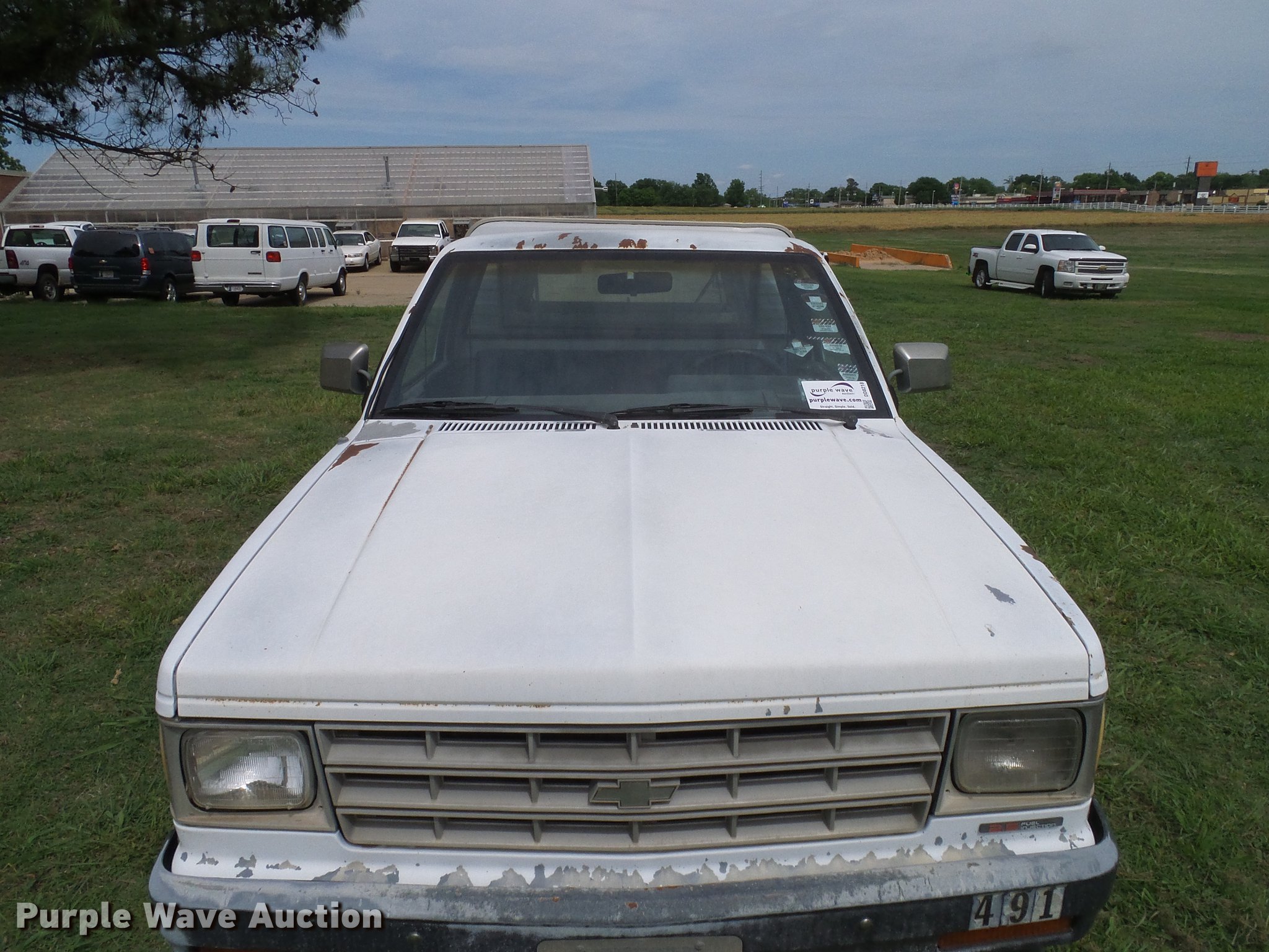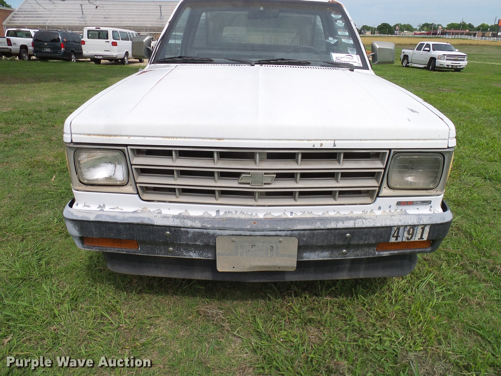 Purple Wave is selling a used Compact Pickup or Van in Oklahoma. This item is a 1988 Chevrolet S10 pickup truck with the following: 131,901 miles on odometer, 2.5L L4 OHV 8V gas engine, Five speed manual transmission, AC and heat, Cruise, AM/FM, Vinyl interior, Topper, Door struts broken, 195/75R14 tires, Sale# 1903-KP, Unit# 491