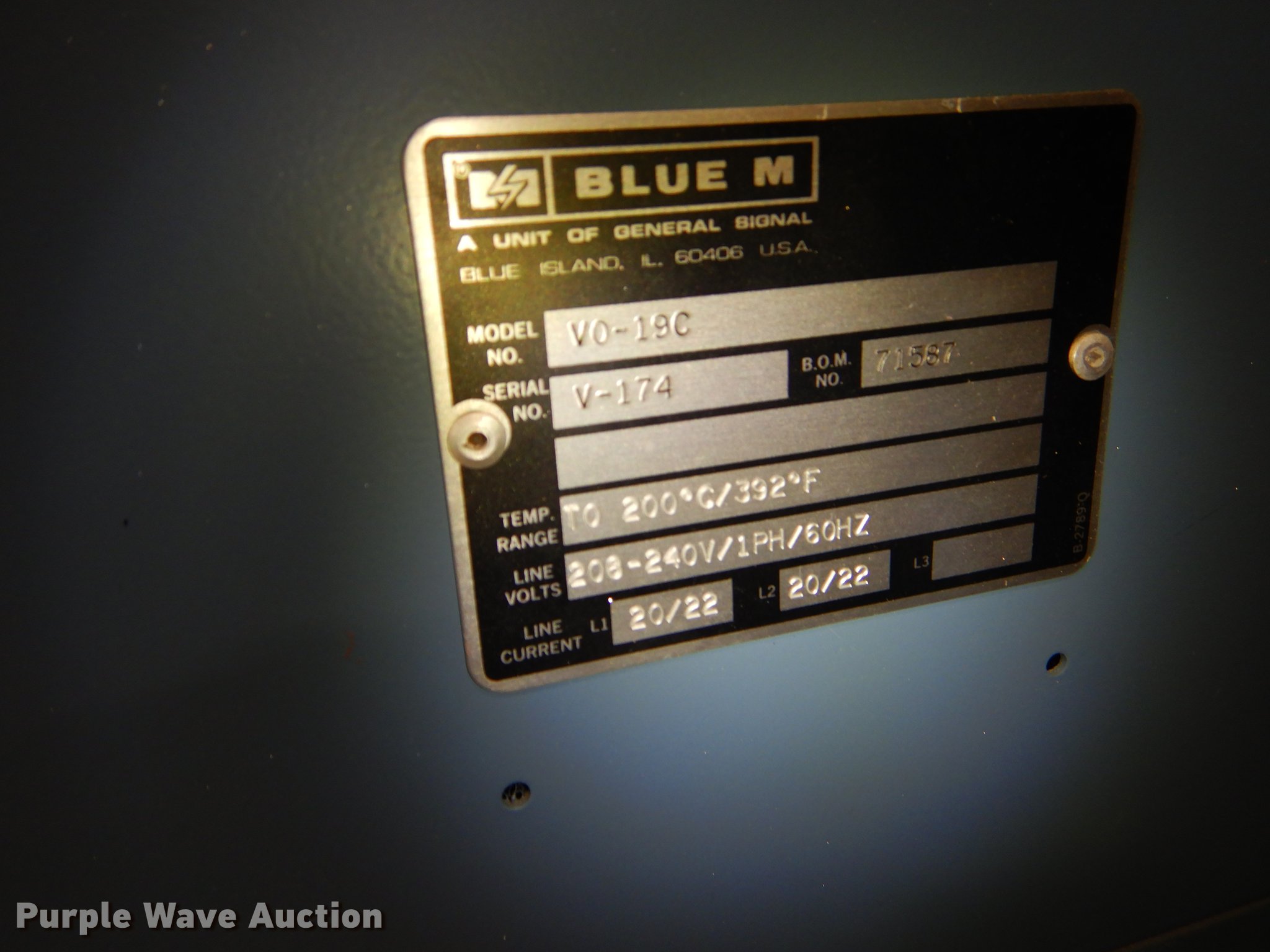 Purple Wave is selling a used Tools in Kansas. This item is a Blue M V0-19C vacuum oven with the following: 33" x 31" x 75", Single phase, 208-240V line voltage, 392 degree Fahrenheit temperature range, Unknown operating condition, Serial V-174
