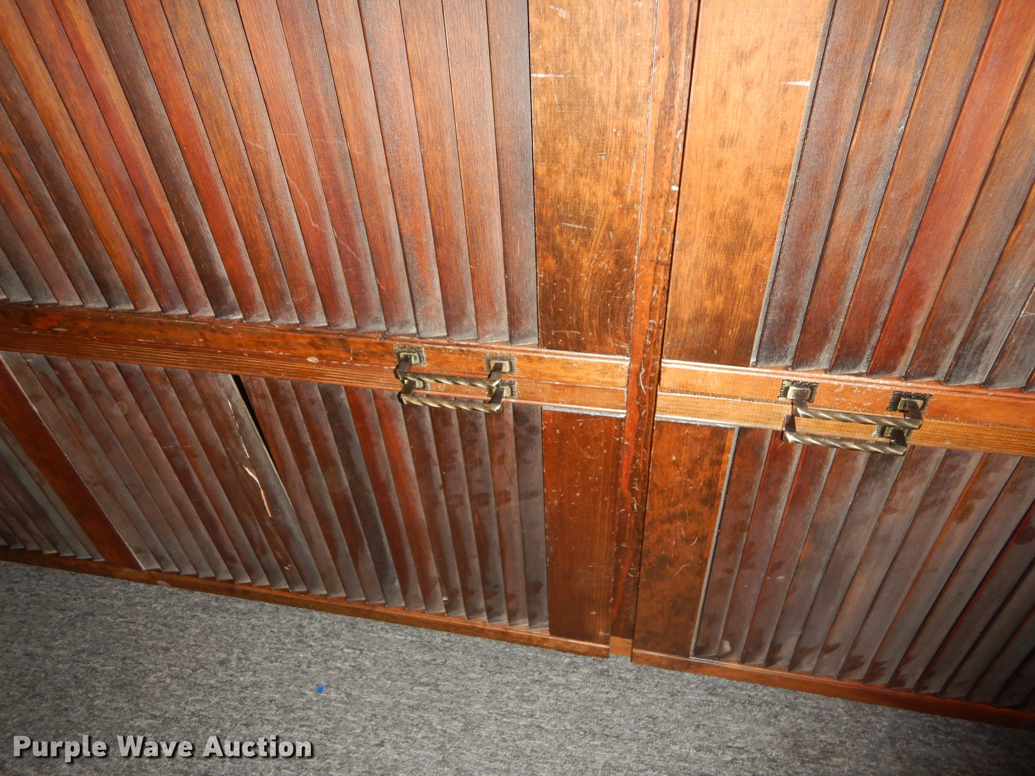 Purple Wave is selling a used Furniture in Kansas. This item is a (3) wood cabinets with the following: 43" x 12" x 31" wall mount, 36" x 24" x 7' upright with doors, 43" x 17" x 78" upright with shelving