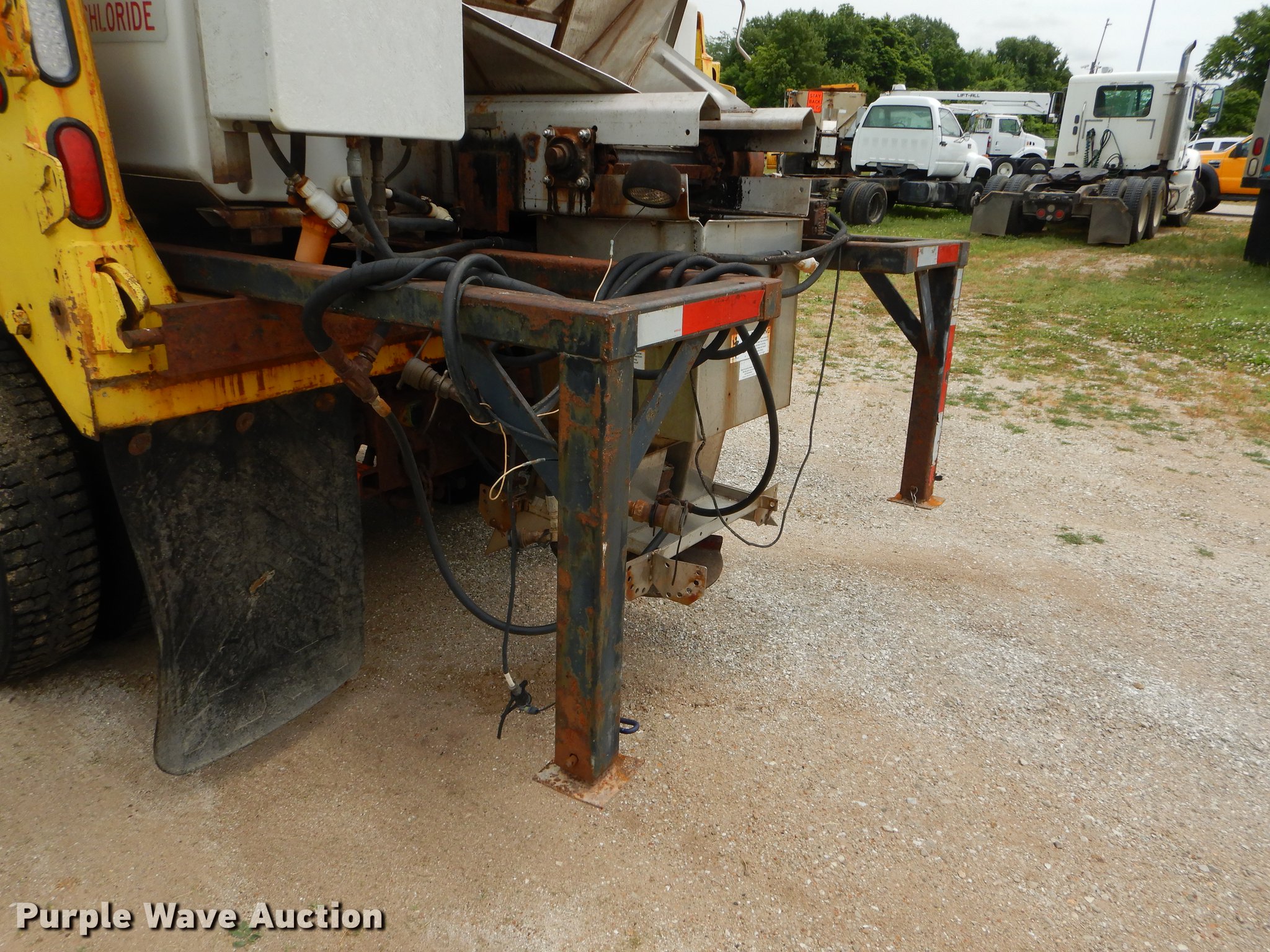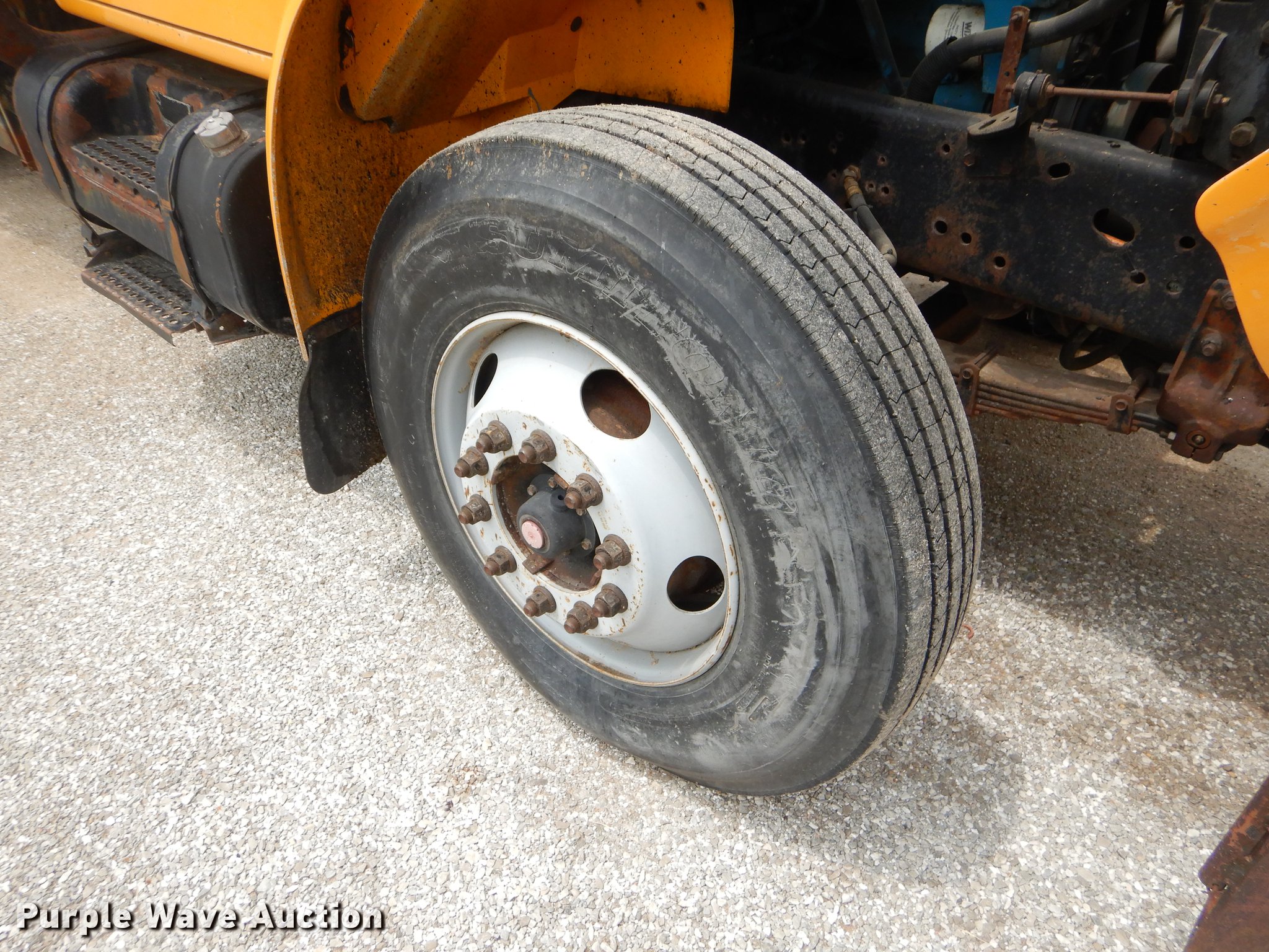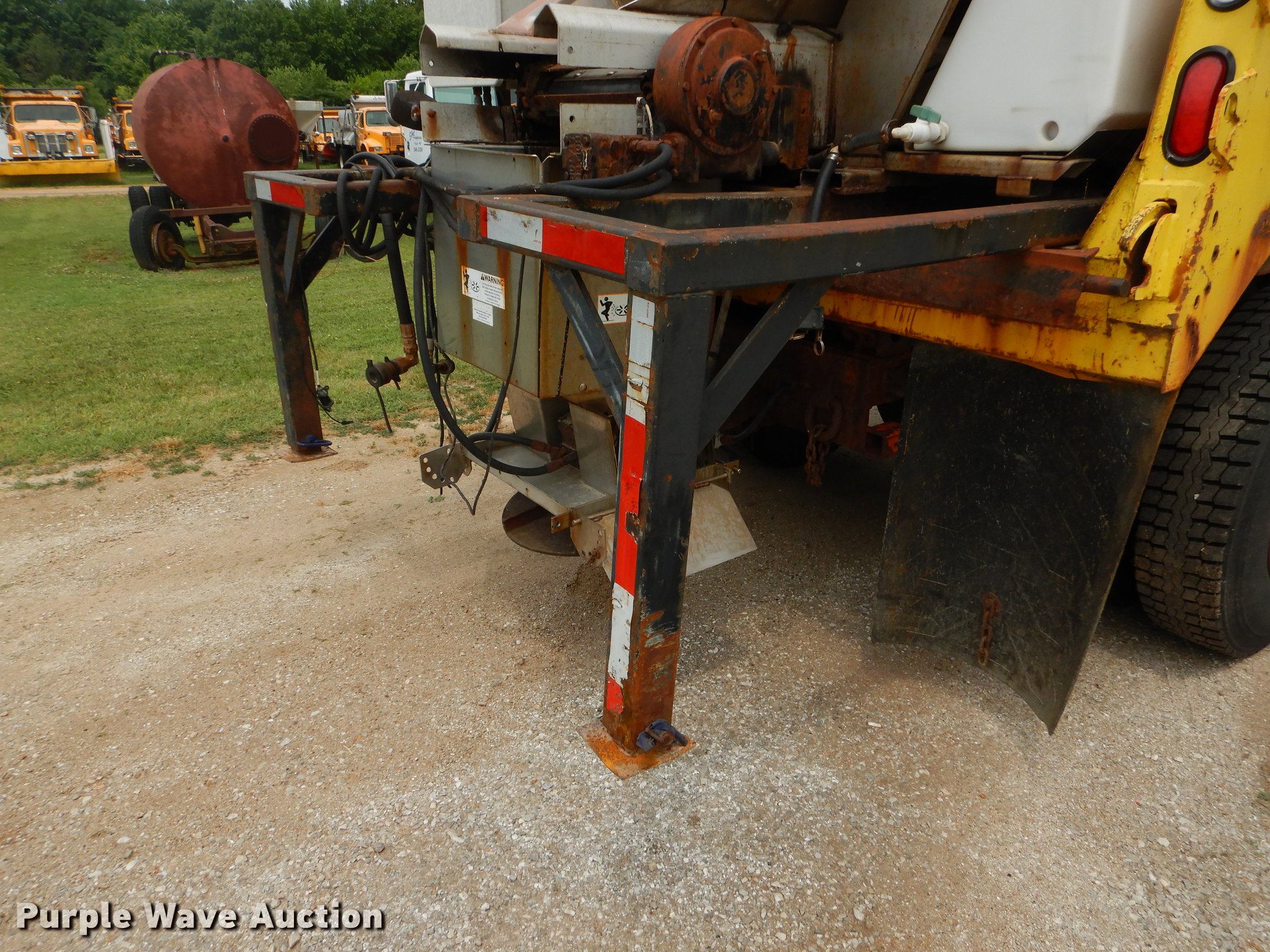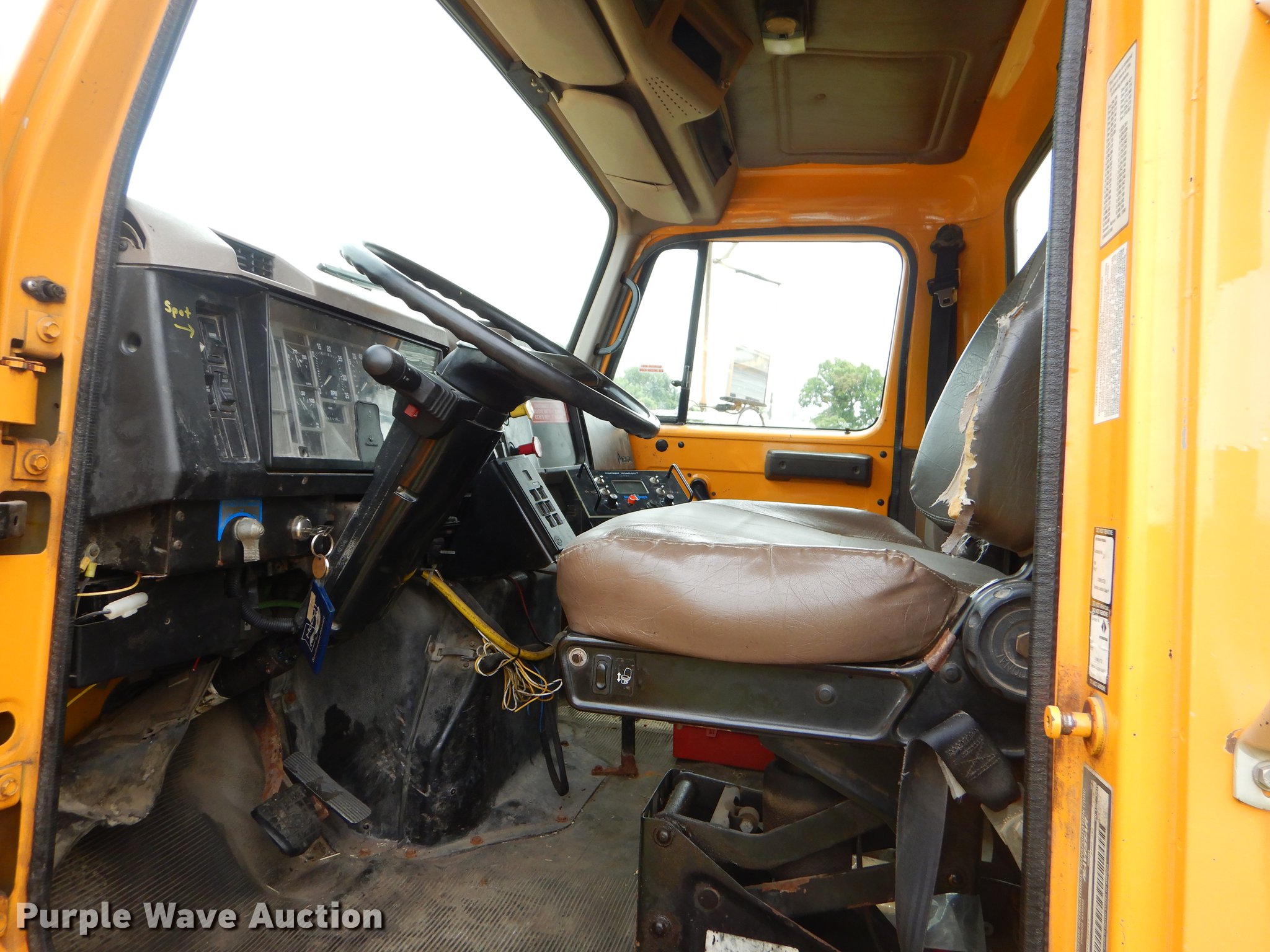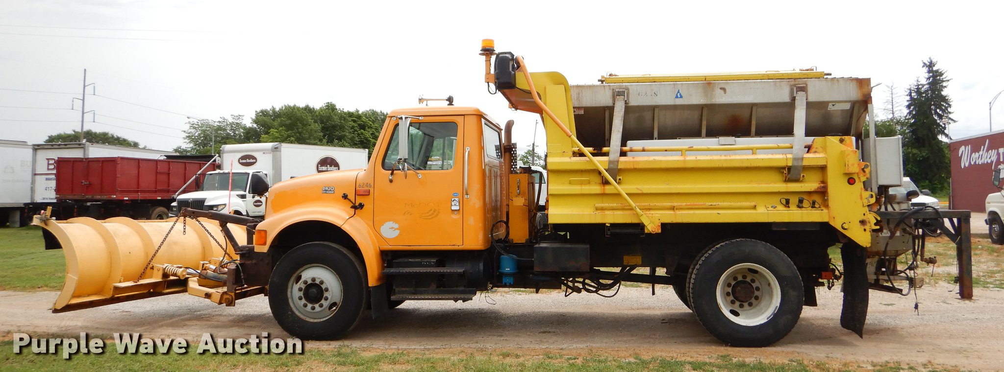 Purple Wave is selling a used Construction Dump Truck in Missouri. This item is a 2001 International 4900 dump truck with the following: 160,512 miles on odometer, 8,701 hours on meter, International DT466 7.6L L6 turbo diesel engine, Automatic transmission, Single axle, AC and heat, Cruise, AM/FM/Weatherband, Heated mirrors, Air suspension seat, PTO, 10'L x 96"W steel dump bed, 26" side height, Single ram hoist, Manual operated end gate, Roll tarp, 134"W snow plow, Swenson spreader, 150 gallon fluid tanks, Single fuel tank, Pintle hitch, 176" wheelbase, Spring suspension, Air brakes, 11R22.5 tires, Unknown operating condition, MODOT ID 6246
