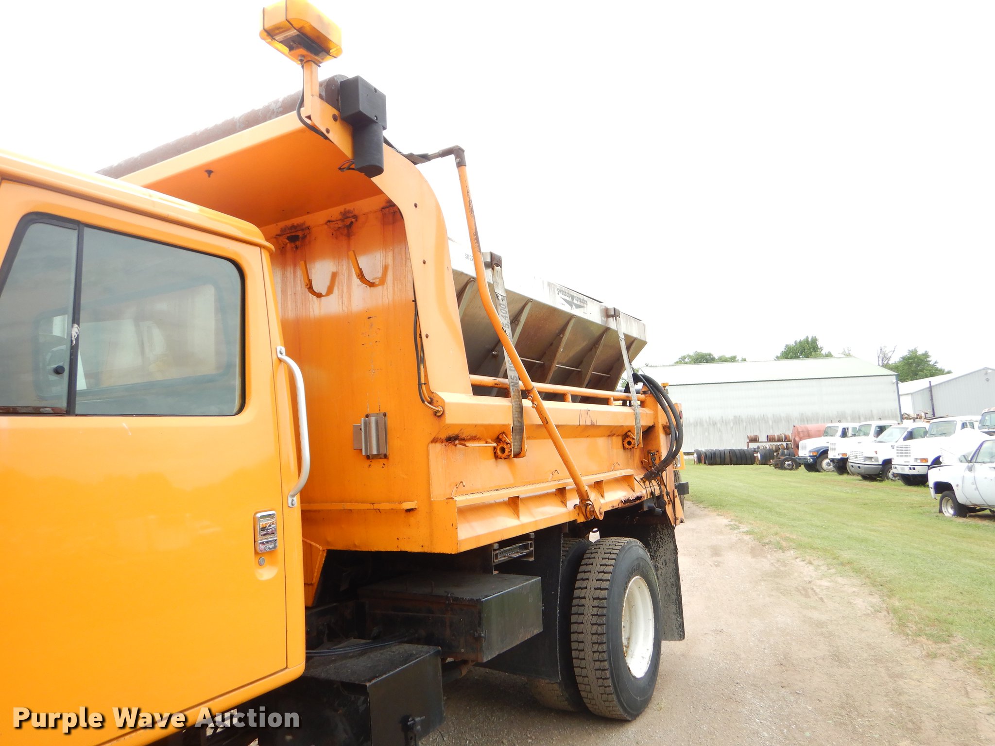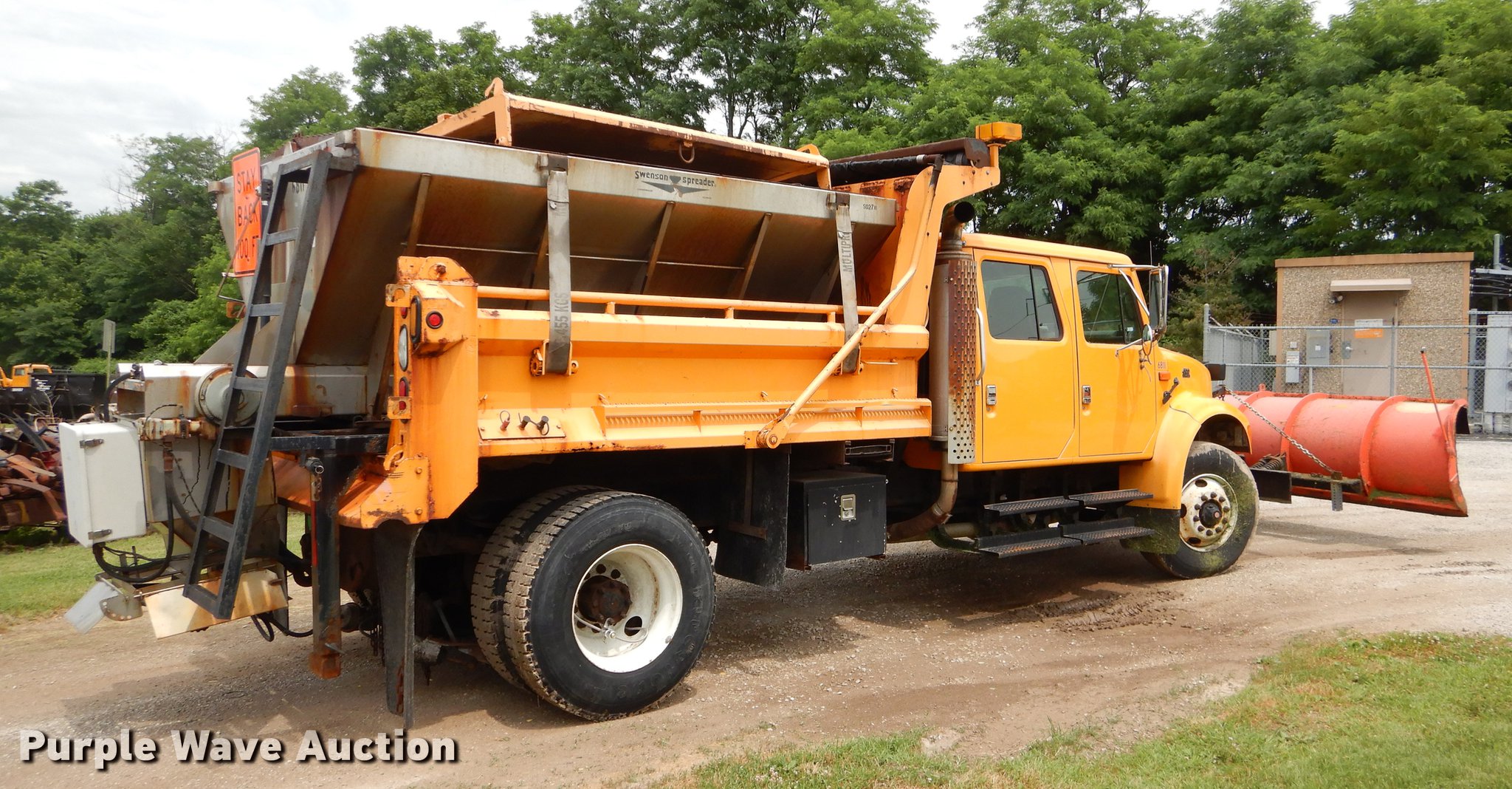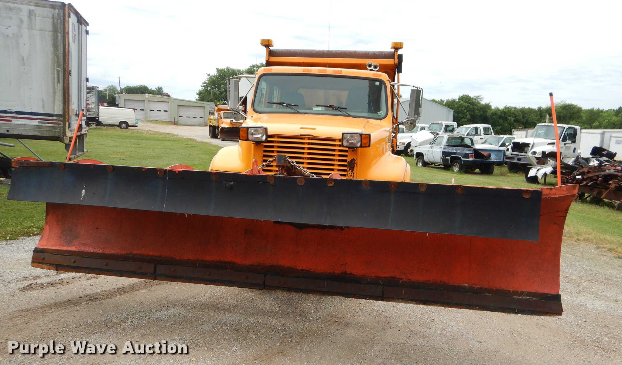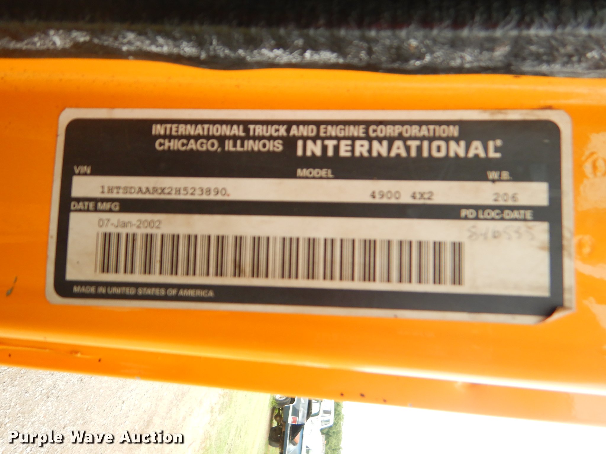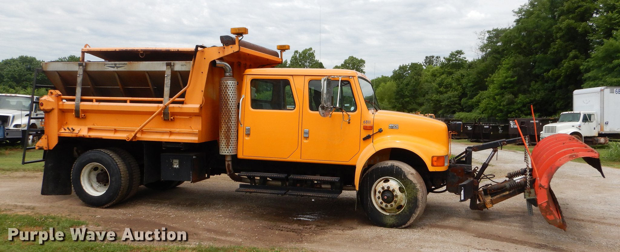 Purple Wave is selling a used Construction Dump Truck in Missouri. This item is a 2002 International 4900 Crew Cab dump truck with the following: 148,491 miles on odometer, 9,557 hours on meter, International DT466 7.6L L6 turbo diesel engine, Automatic transmission, Single axle, AC and heat, Cruise, AM/FM/Weatherband, Power windows and mirrors, Air suspension seat, PTO, 10'L x 96"W steel dump bed, 24" side height, Single ram hoist, Ladder, Swenson spreader, 165"W snow plow, Single fuel tank, Pintle hitch, 214" wheelbase, Spring suspension, Air brakes, 315/80R22.5 tires, 11R22.5 rear tires, Unknown operating condition, MODOT ID 6811