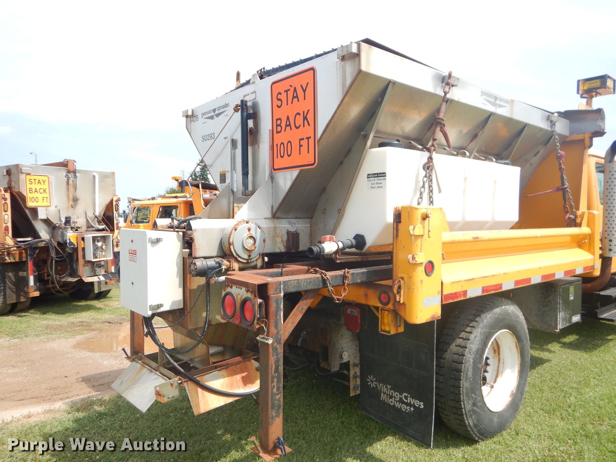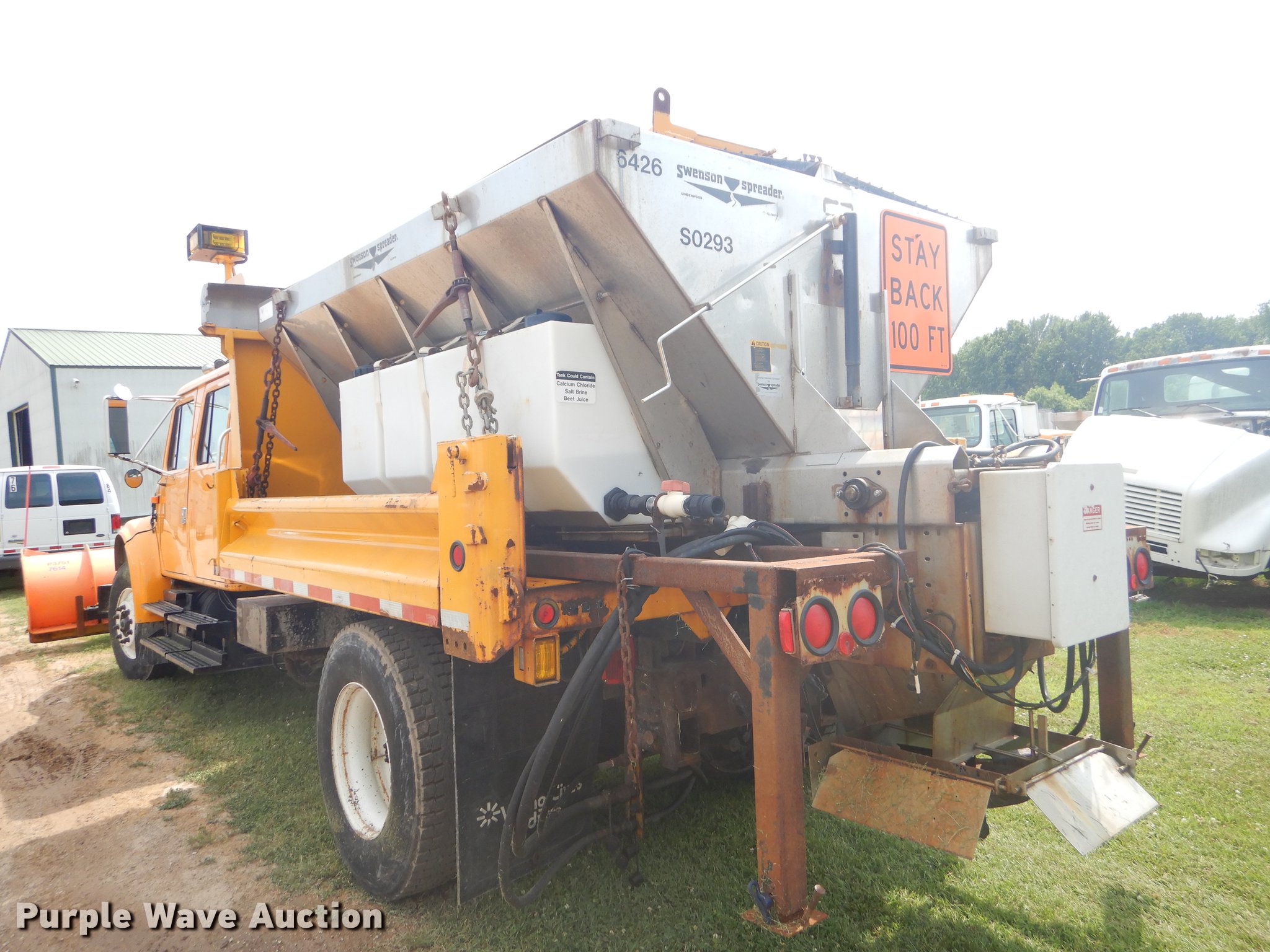 2001 International 4900 Crew Cab dump truck. 136,434 miles on odometer, 8,880 hours on meter, International DT466 7.6L L6 turbo diesel engine, Automatic transmission, Single axle, AC and heat, Cruise, AM/FM/Weatherband, Heated mirrors, Air suspension seat, PTO, 10'L x 96"W steel dump bed 12" side height, Single ram hoist, Toolboxes, Swenson spreader 150 gallon fluid tanks, 132"W snow plow, Single fuel tank, Pintle hitch, 206" wheelbase, Spring suspnesion, Air brakes, 11R22.5 tires, Unknown operating condition, MODOT ID 6426. Missouri title. 1HTSDAAR81H357951. Missouri Department of Transportation(MODOT). 615 N. West Bypass. Springfield, MO 65802