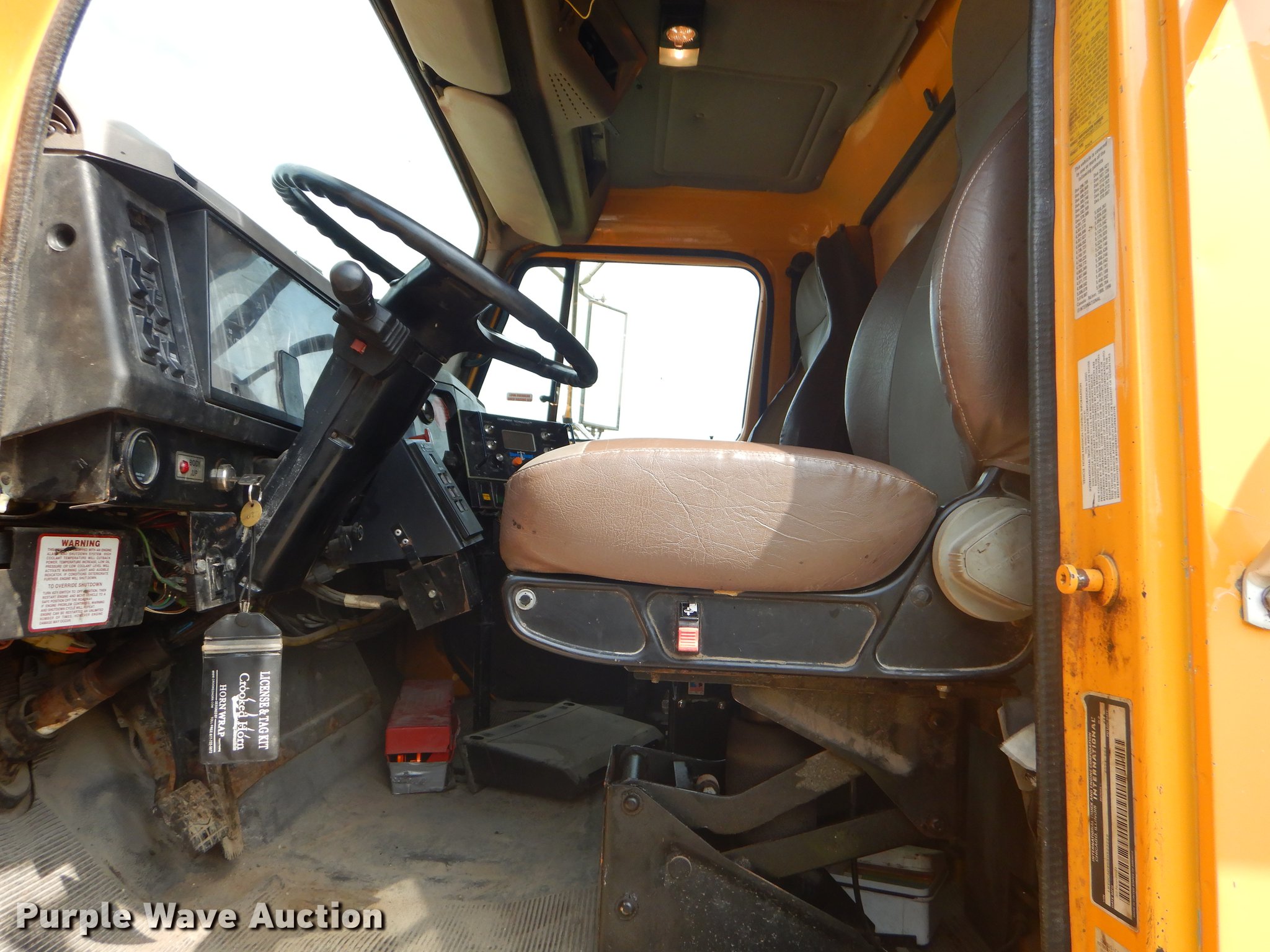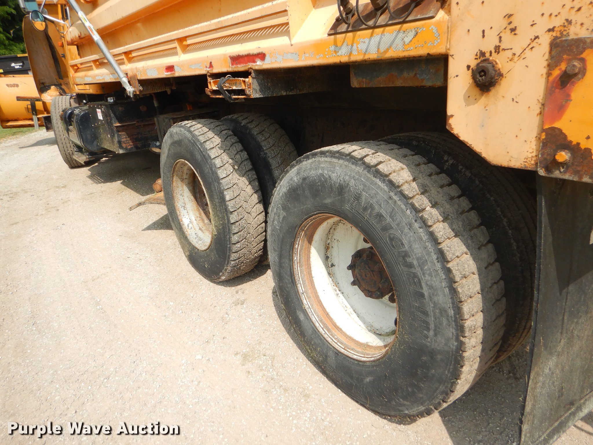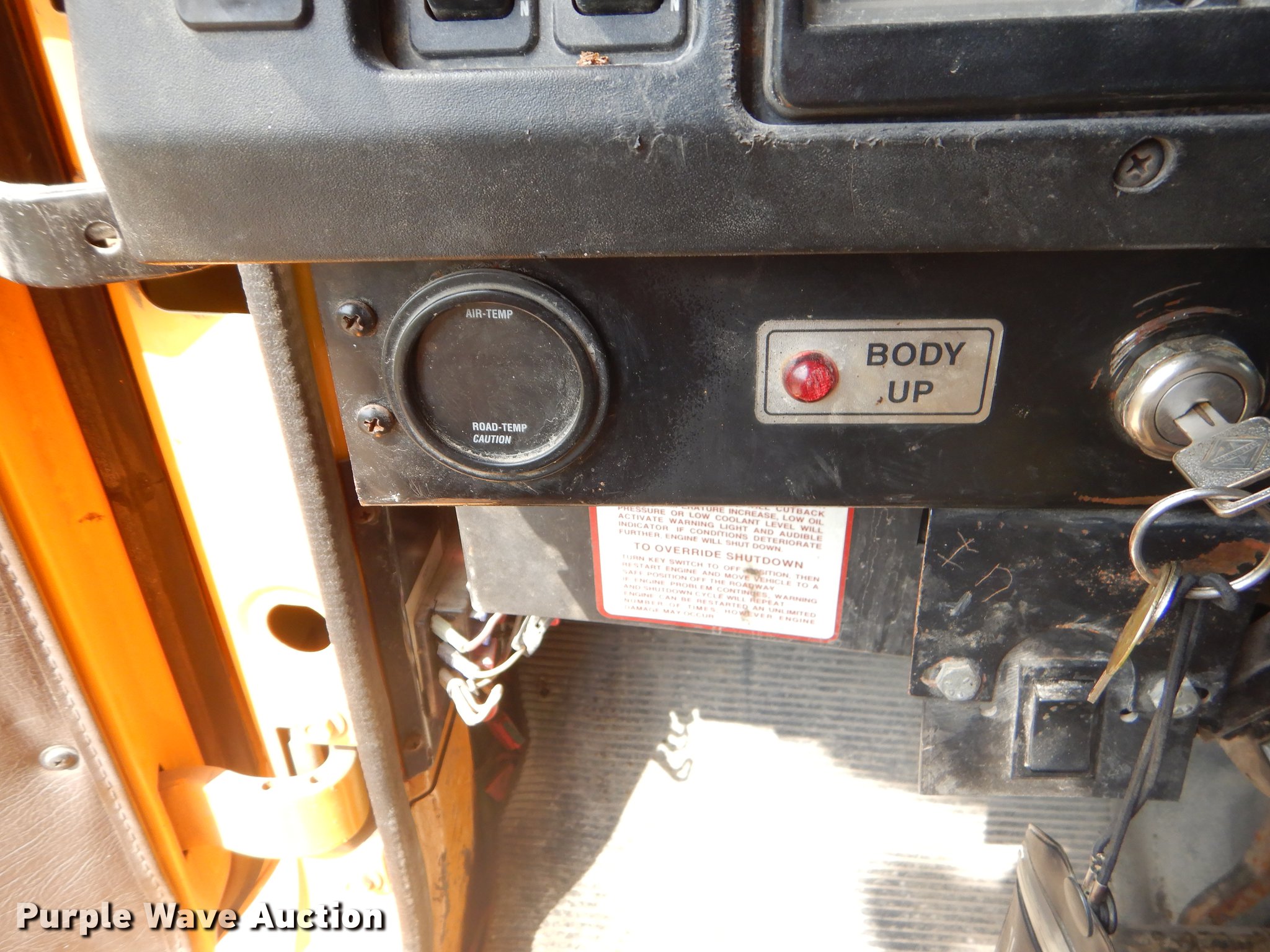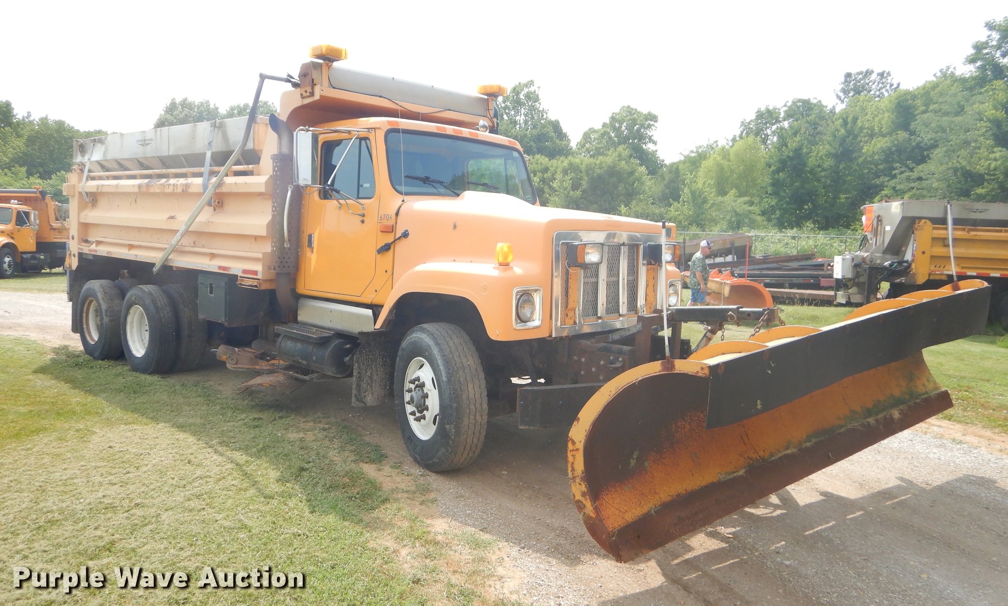 Purple Wave is selling a used Construction Dump Truck in Missouri. This item is a 2002 International 2554 dump truck with the following: 176,046 miles on odometer, 9,071 hours on meter, International DT530 8.7L L6 turbo diesel engine, Automatic transmission, Tandem axle, Inter-axle differential lock, AC and heat, Cruise, AM/FM/weatherband, Power windows, Power and heated mirrors, Air suspension seat, PTO, 16'L x 96"W steel dump bed, 36" side height, Roll tarp, Rear ladder access, 134"W plow, Swenson spreader, Under-mounted adjustable grader blade, Single fuel tank, Walking beam suspension, Air brakes, 216" wheelbase, 315/80R22.5 front tires, 11R22.5 rear tires, Chipped windshield, Unknown operating condition, MODOT ID 6706