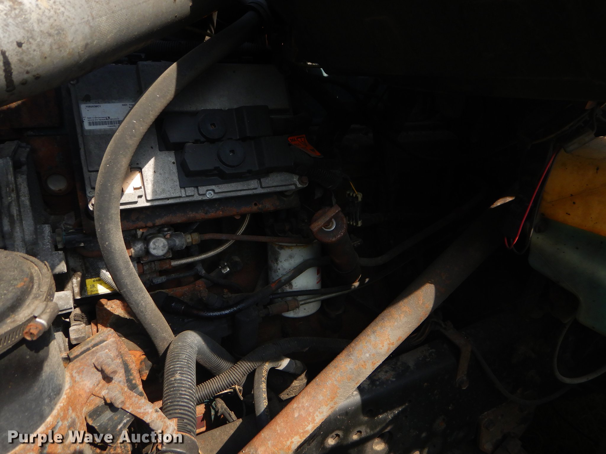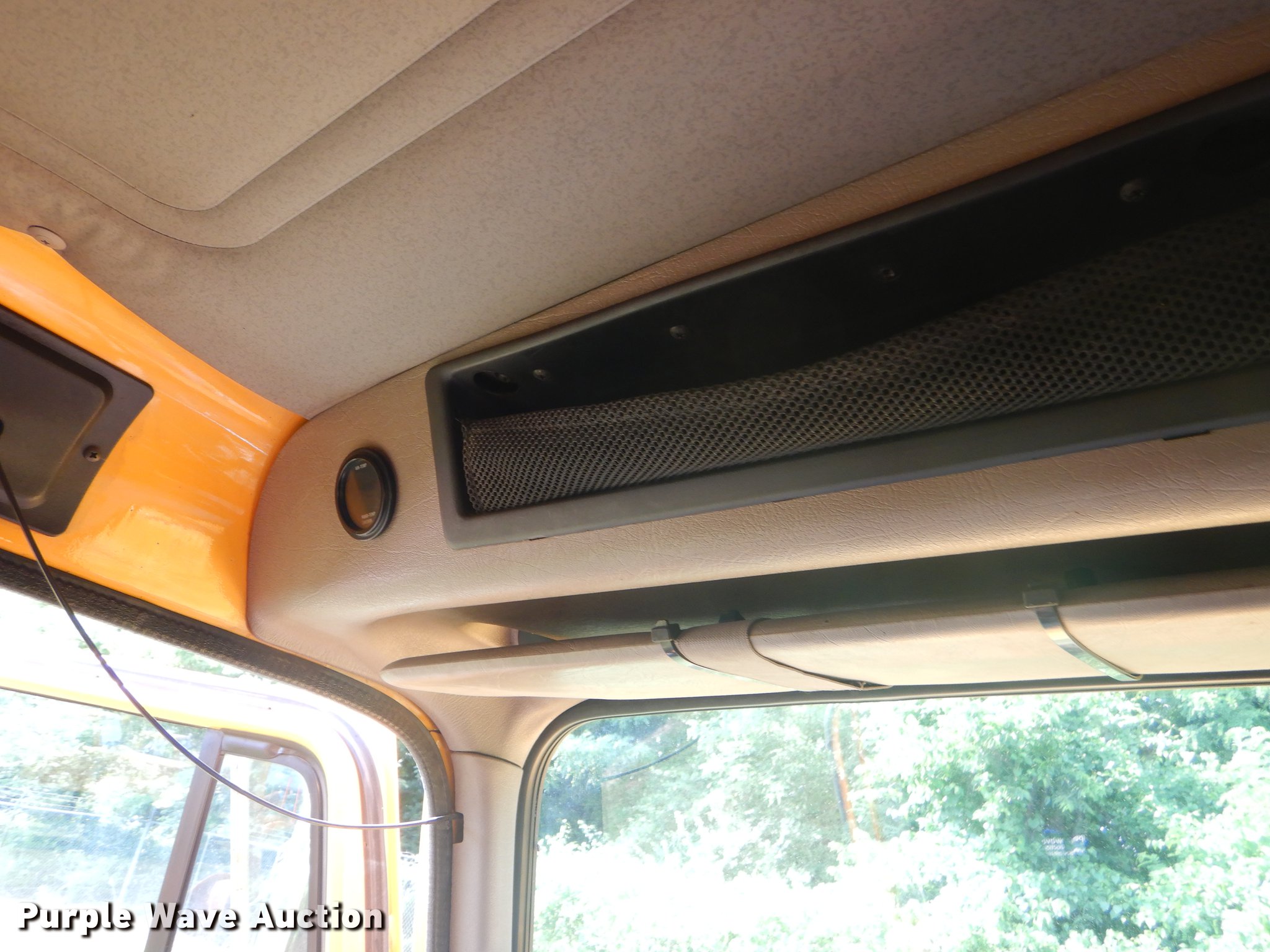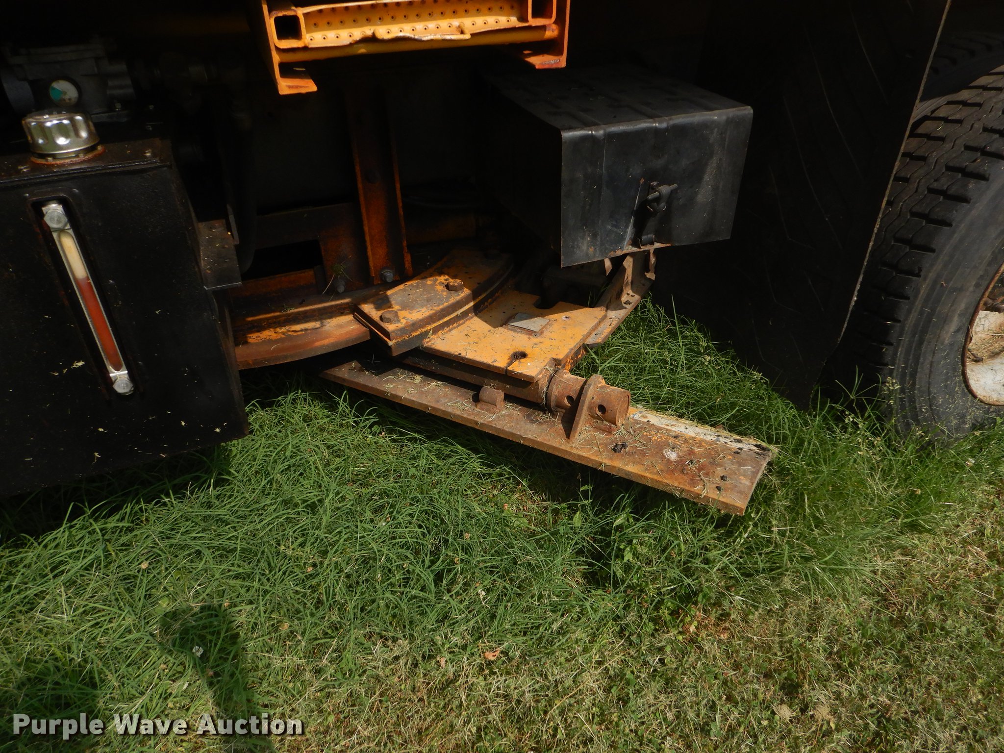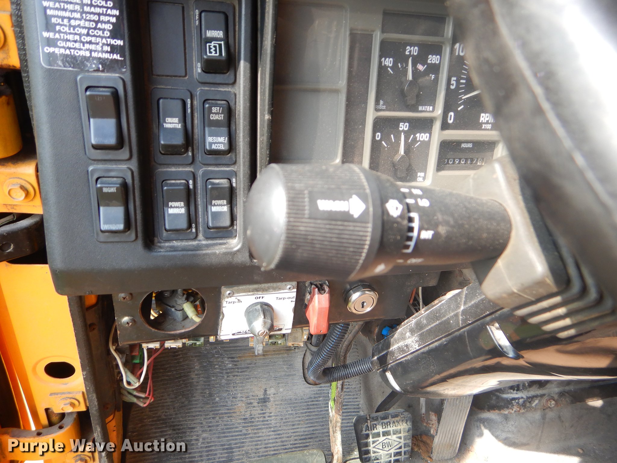 Purple Wave is selling a used Construction Dump Truck in Missouri. This item is a 2002 International 2554 dump truck with the following: 159,224 miles on odometer, 9,017 hours on meter, International DT530 8.7L L6 turbo diesel engine, Eaton Fuller eight speed manual transmission, Tandem axle, Inter-axle differential lock, AC and heat, Cruise, AM/FM/weatherband, Power windows, Power and heated mirrors, Air suspension seat, Air ride cab, PTO, Toolboxes, 16'L x 96"W steel dump bed, 36" side height, Roll tarp, Single ram hoist, Swenson spreader, Under-mounted adjustable grader blade, Single fuel tank, Walking beam suspension, Air brakes, 216" wheelbase, 315/80R22.5 front tires, 11R22.5 rear tires, Non-operational unit, Injector tip blown off, Smokes, MODOT ID 6963