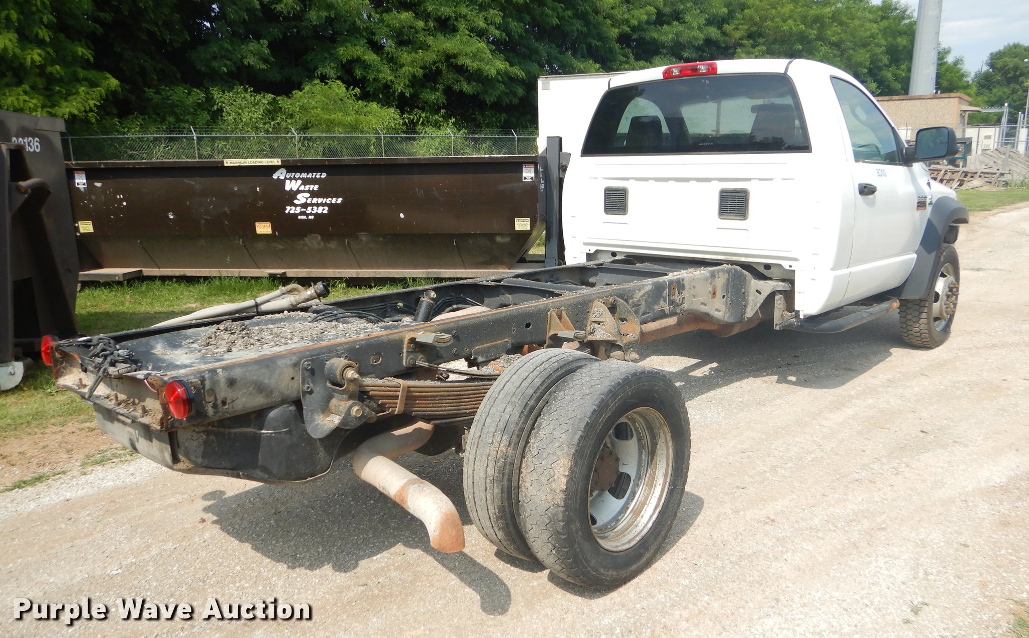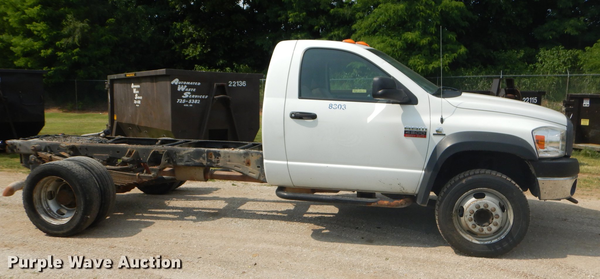 Purple Wave is selling a used Truck Chassis in Missouri. This item is a 2008 Dodge Ram 4500 truck cab and chassis with the following: 179,557 miles on odometer, 6.7L L6 OHV 24V diesel engine, Automatic transmission, Four wheel drive, AC and heat, Tilt, Cruise, AM/FM/CD, Manual windows and locks, Cloth interior, Front tow hooks, Running boards, 225/70R19.5 tires, Check engine light on, Unknown operating condition, MODOT ID 8303