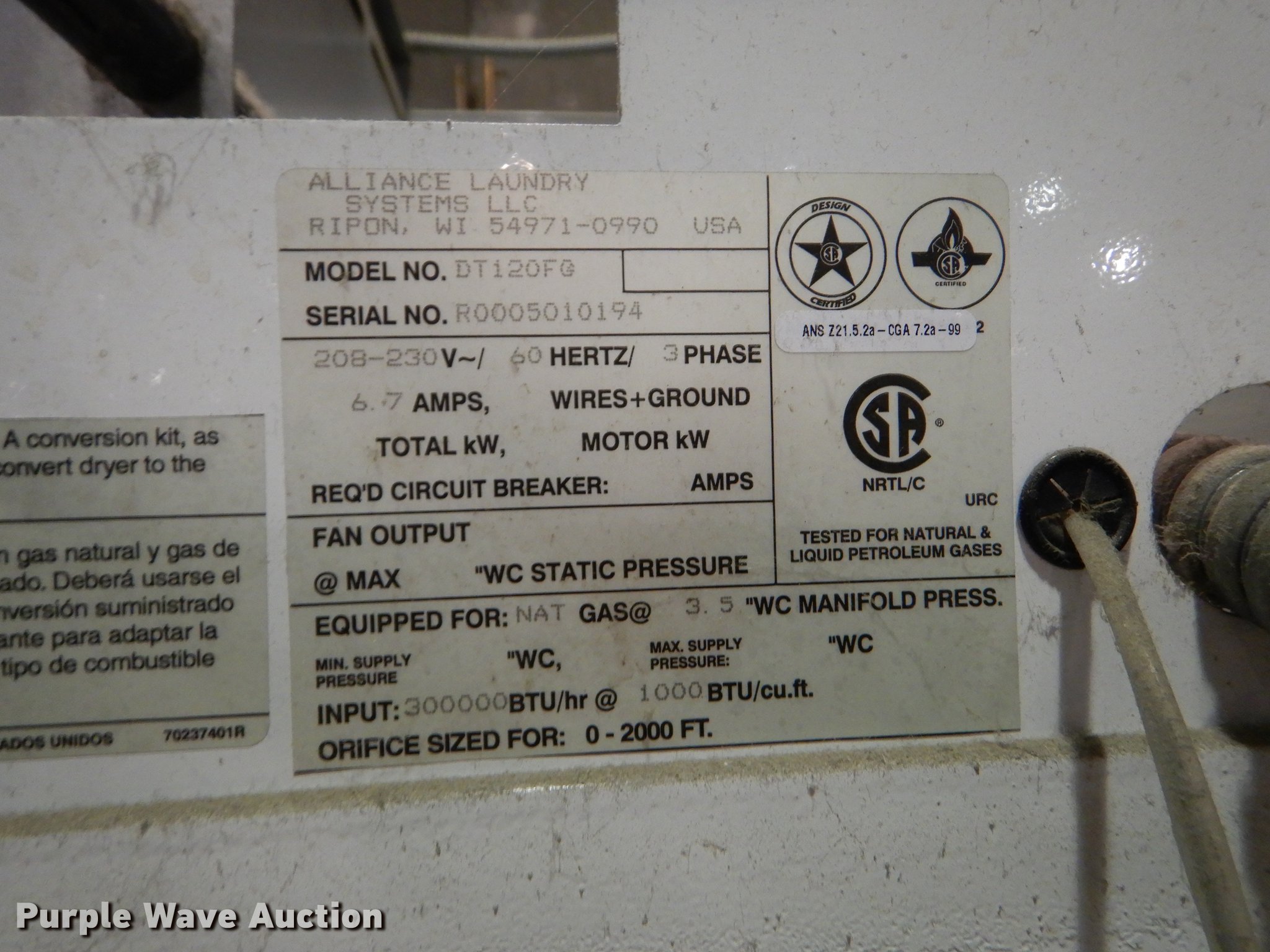 Purple Wave is selling a used Appliances in Kansas. This item is a (5) dryers with the following: (2) Unimac DT120FG, American Dryer Corp. ADG120D, Continental CG115-125, Load Master 42, Three phase, 208V