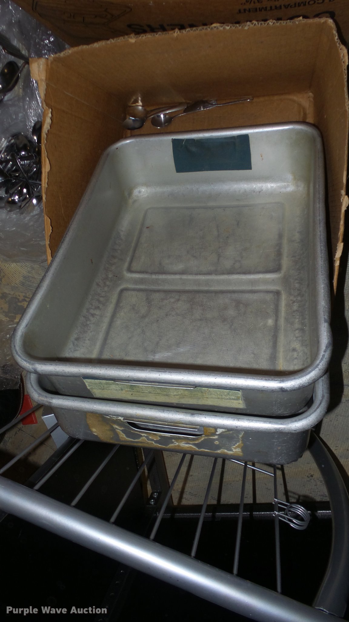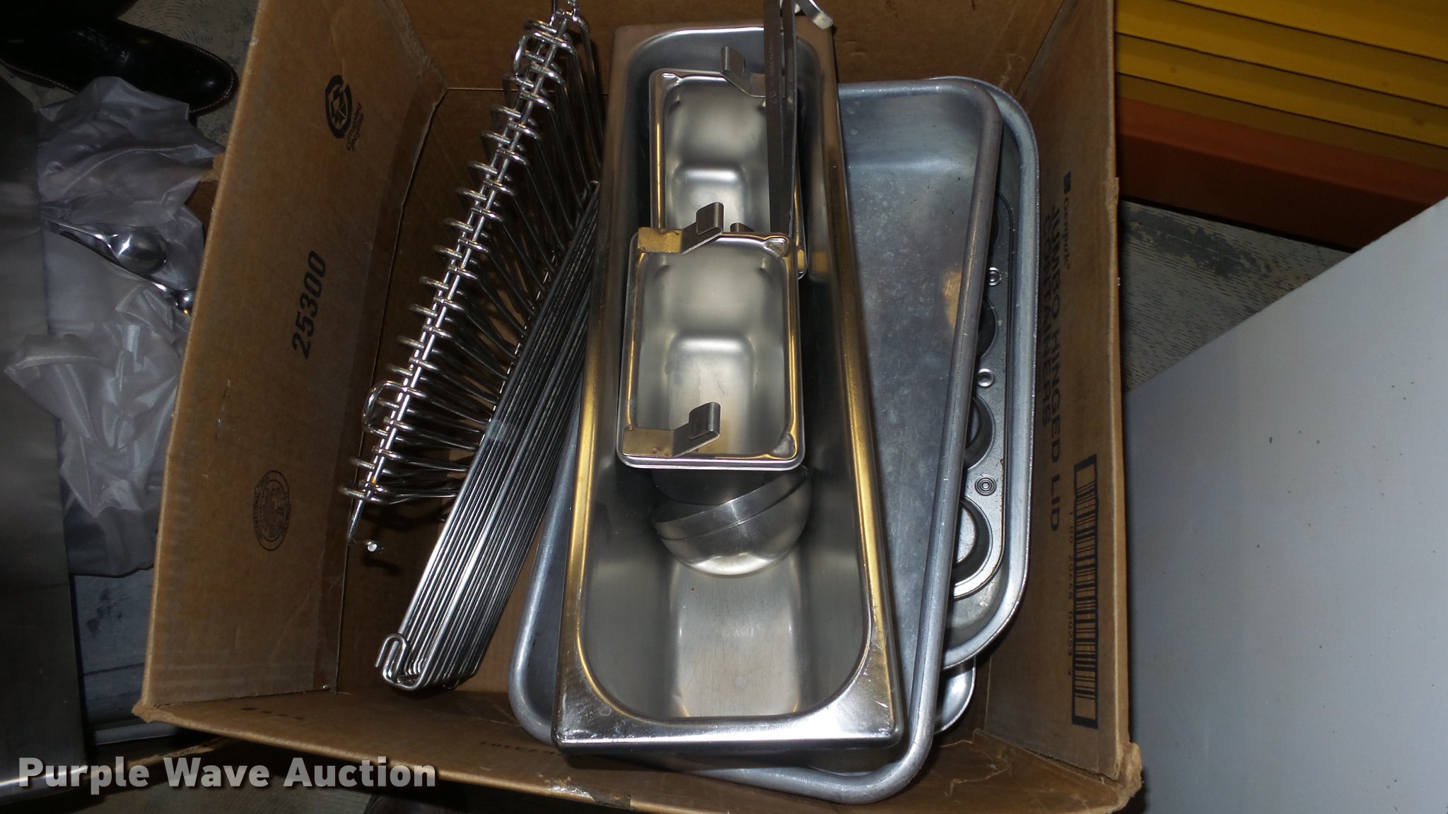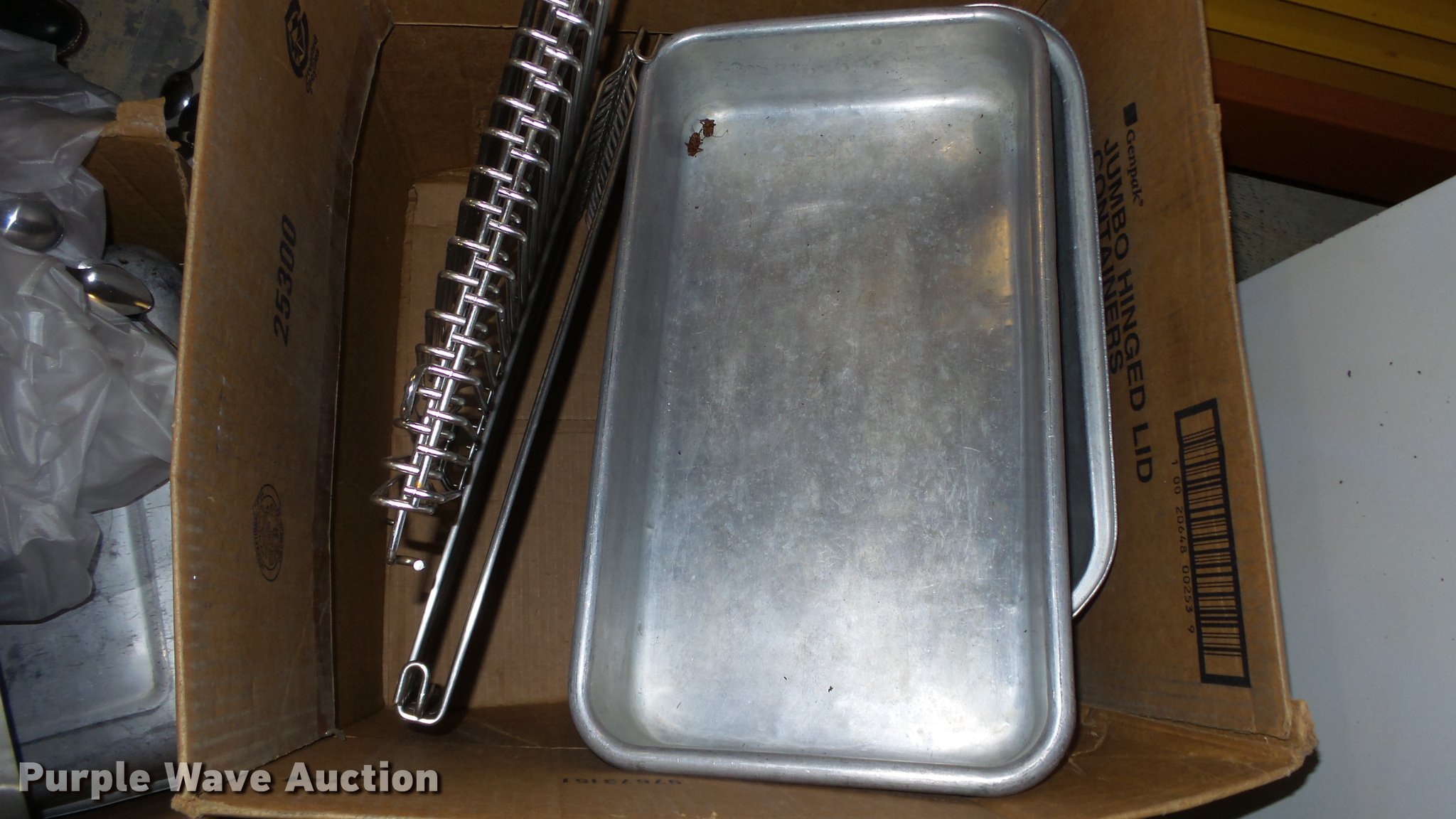 Kitchen equipment. (2) plastic tubs, Plastic dinnerware, Utensil caddies, Metal pans, Metal utensils, APW CW1B cooker, (2) heat lamps, Display racks. USD 262 Valley Center. Valley Center, KS 67147