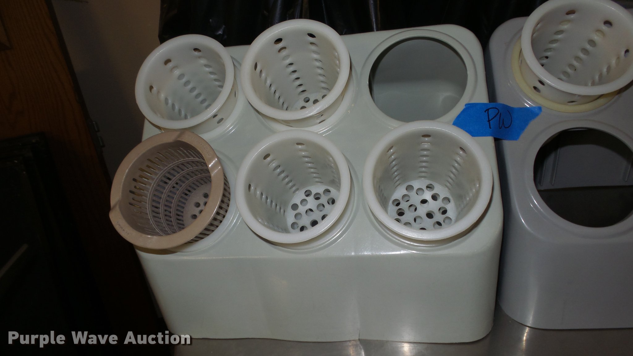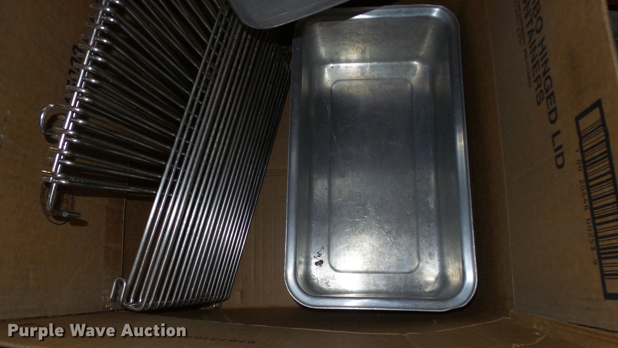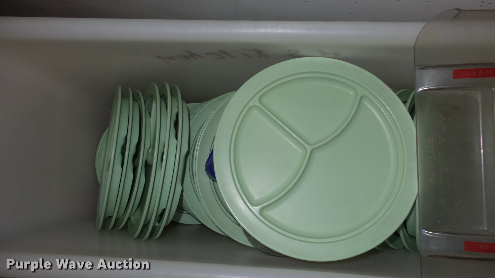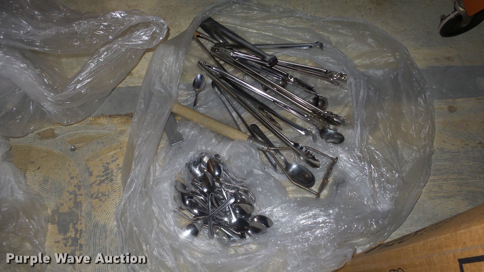 Kitchen equipment. (2) plastic tubs, Plastic dinnerware, Utensil caddies, Metal pans, Metal utensils, APW CW1B cooker, (2) heat lamps, Display racks. USD 262 Valley Center. Valley Center, KS 67147