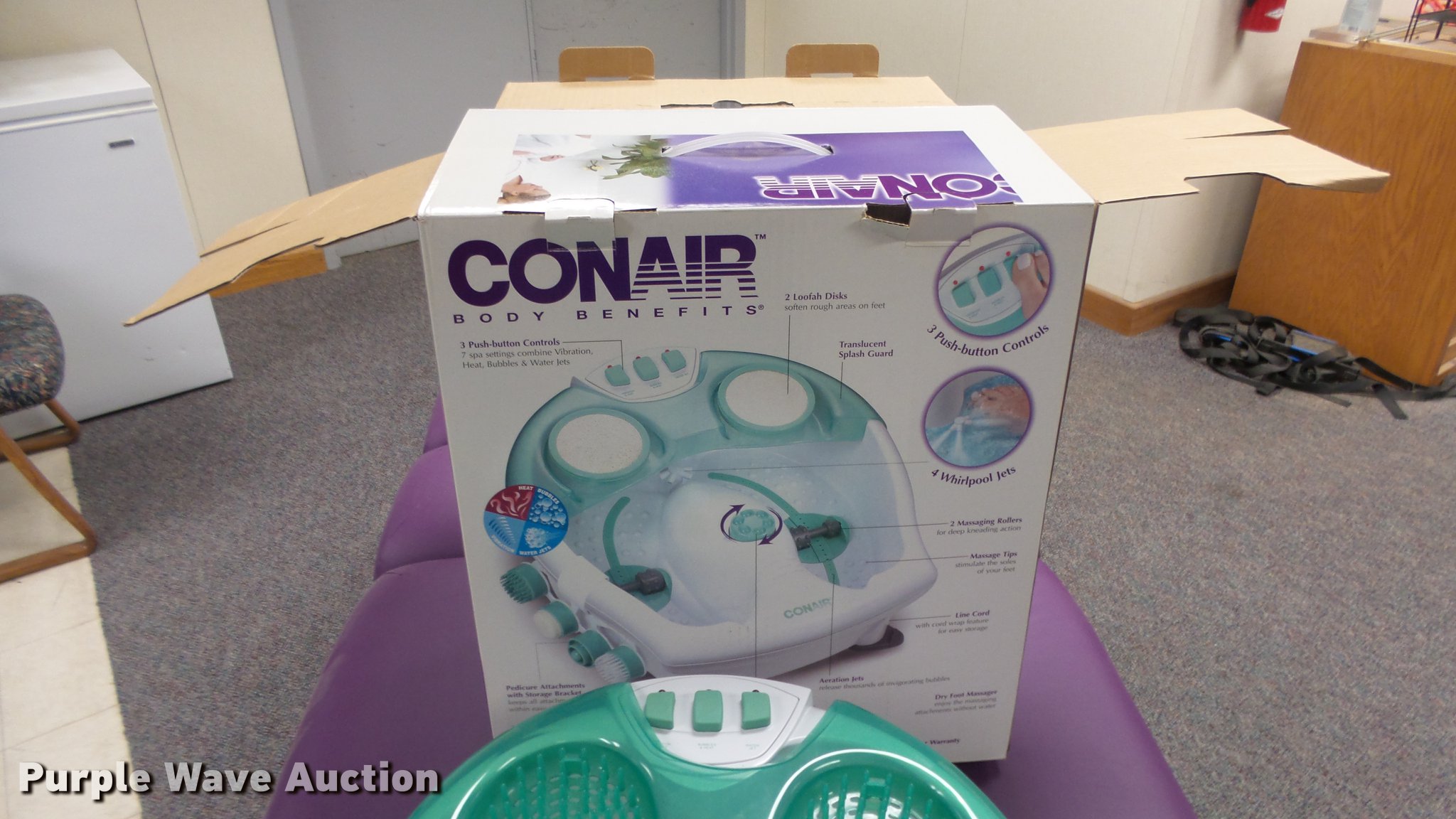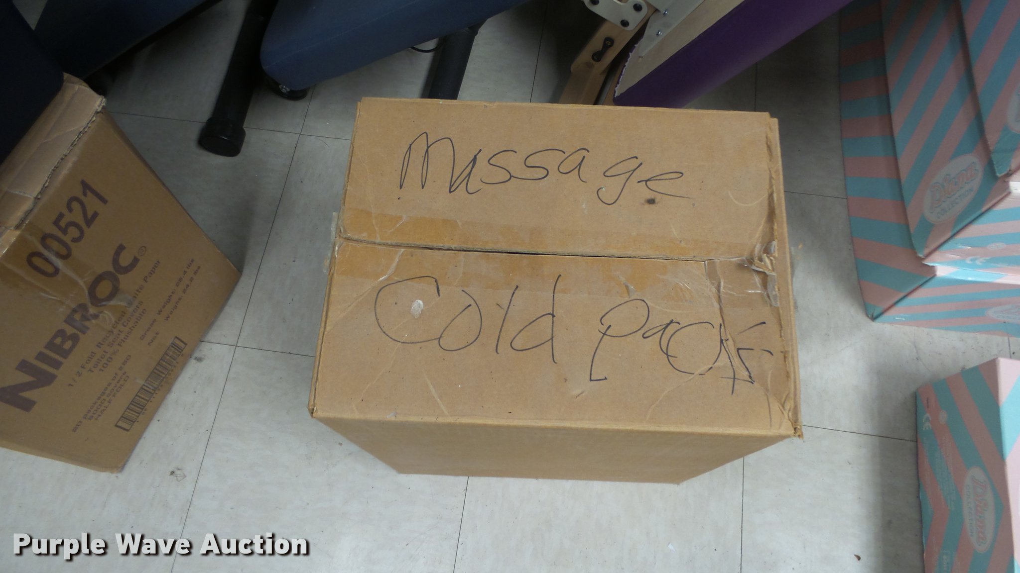 Purple Wave is selling a used Furniture in Kansas. This item is a Massage equipment with the following: (6) massage chairs, Massage cold packs, Foot warmers, Videos, (3) Conair foot spas and more