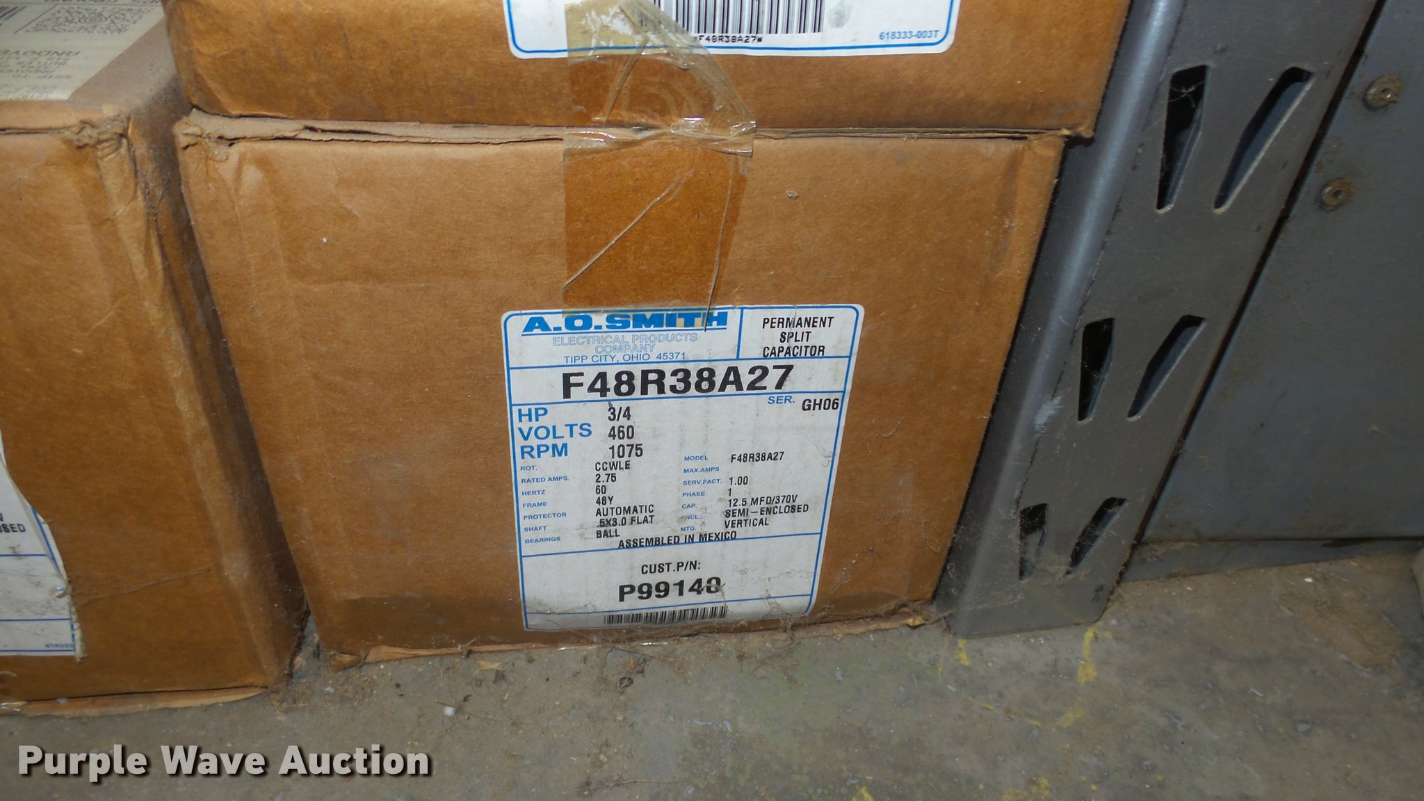 Purple Wave is selling a used Electric Motor in Kansas. This item is a (5) AO Smith electric motors with the following: 460V, 3/4 HP, Single phase, New in box