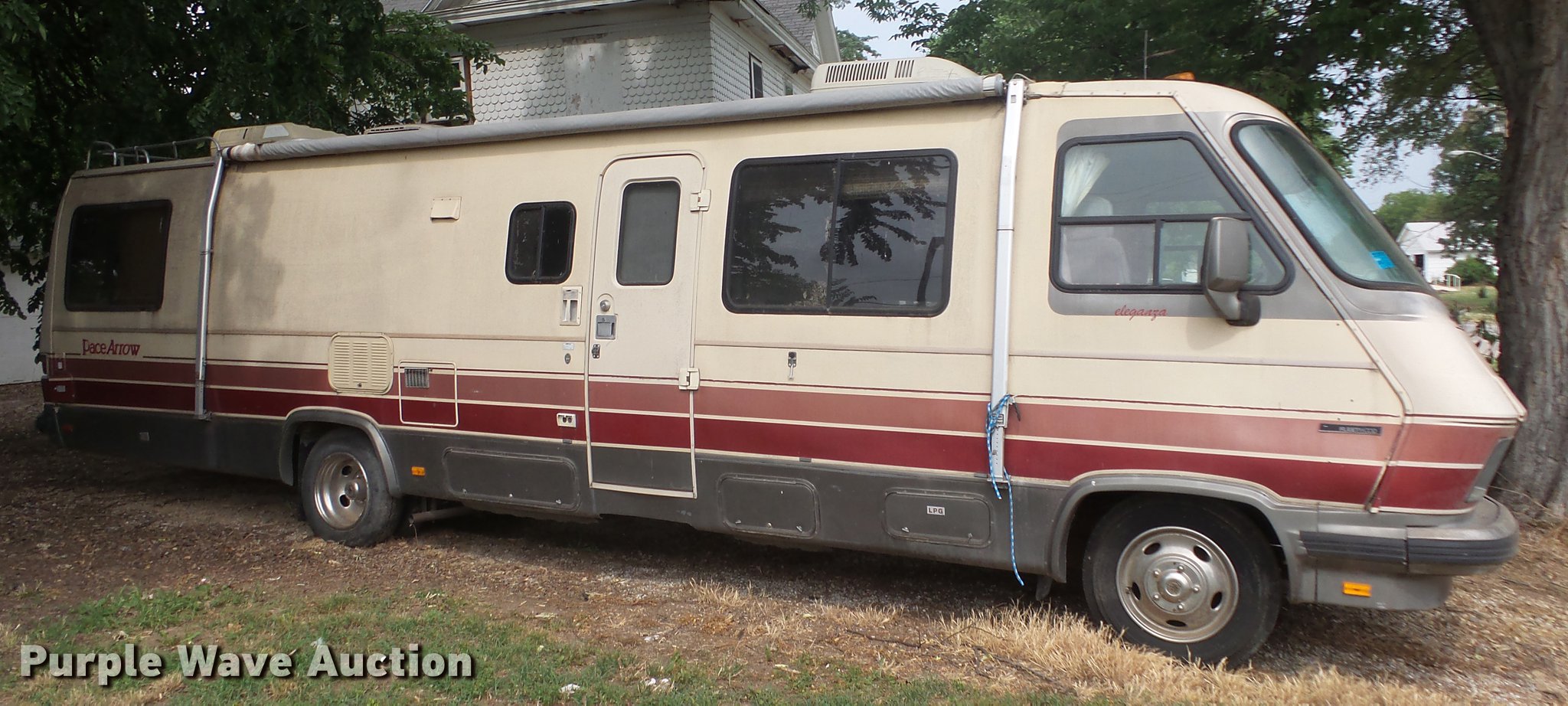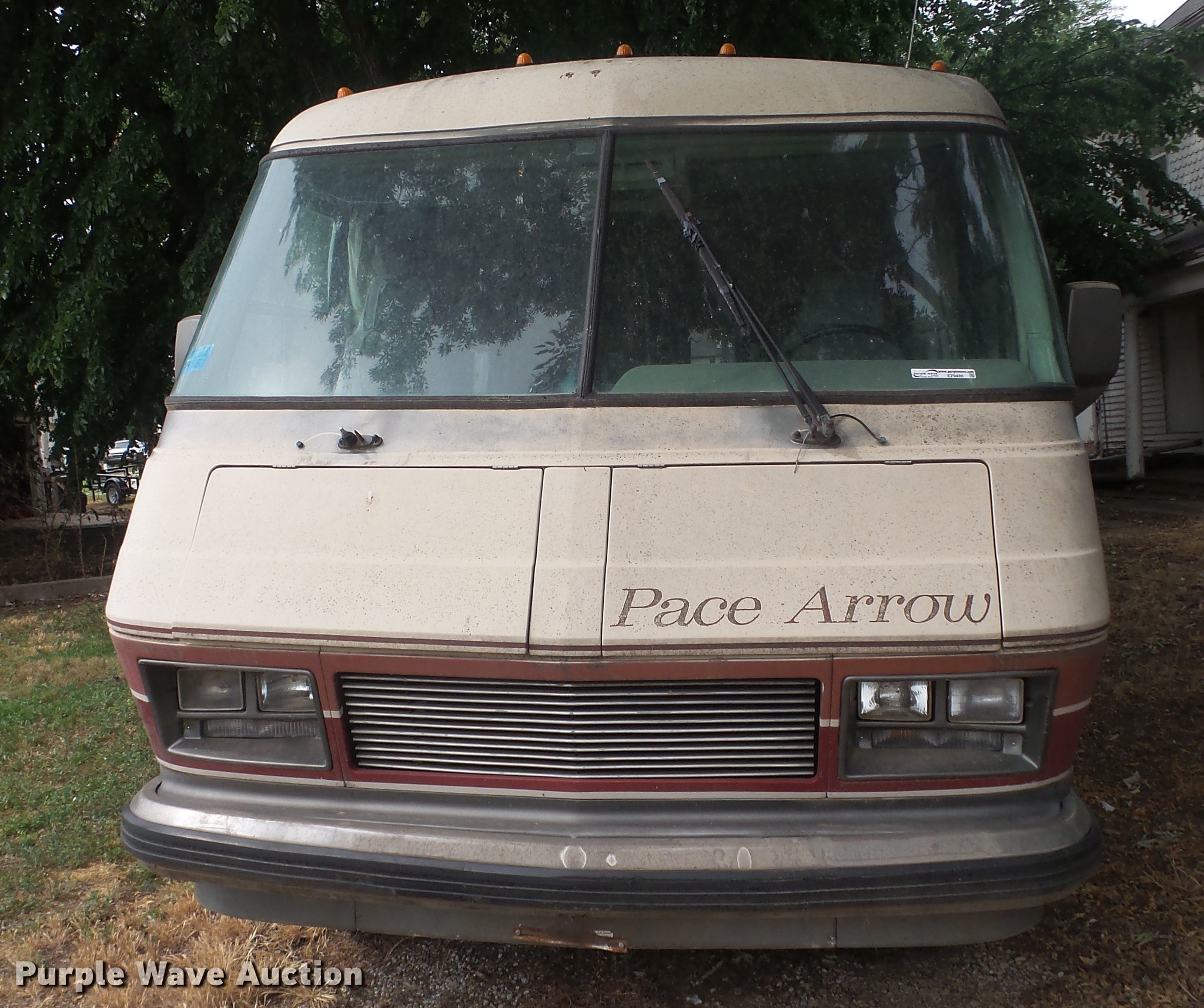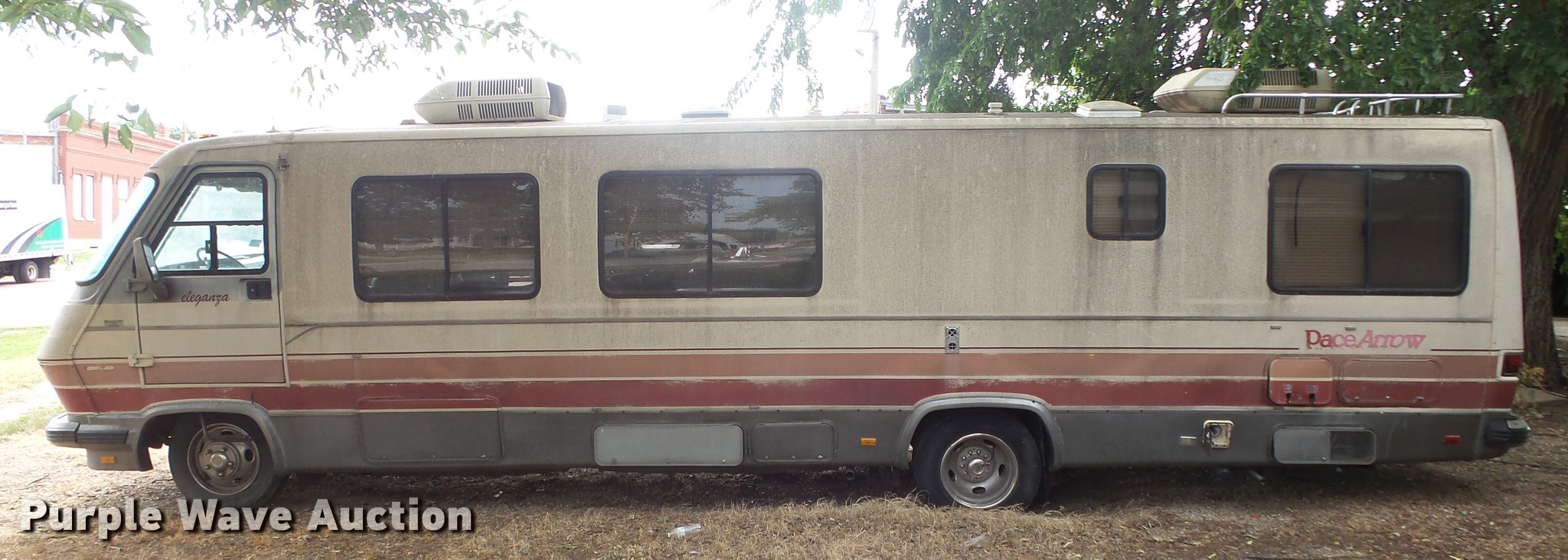 Purple Wave is selling a used RV in Kansas. This item is a 1988 Chevrolet Pace Arrow RV with the following: 62,872 miles on odometer, 7.4L V8 OHV 16V gas engine, Automatic transmission, AC and heat, AM/FM, Kitchen, Sink, Stove, Microwave, Refrigerator/freezer, Lavatory, Awning, Receiver hitch, 8R19.5 tires, Unknown operating condition