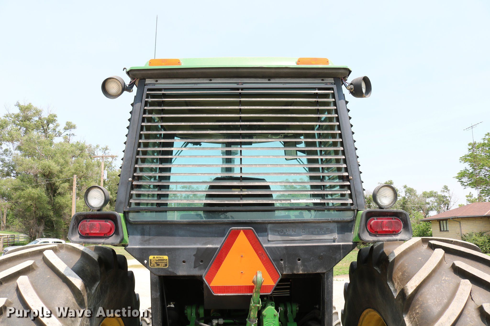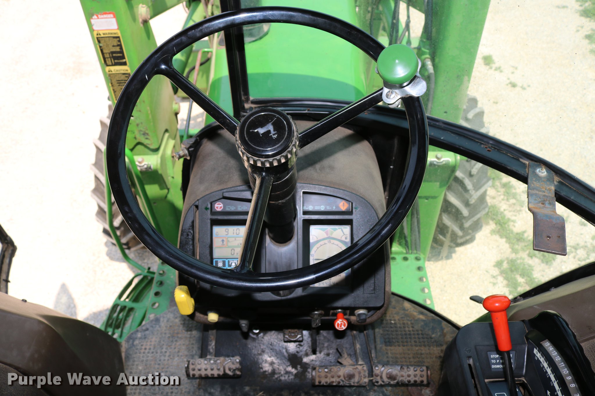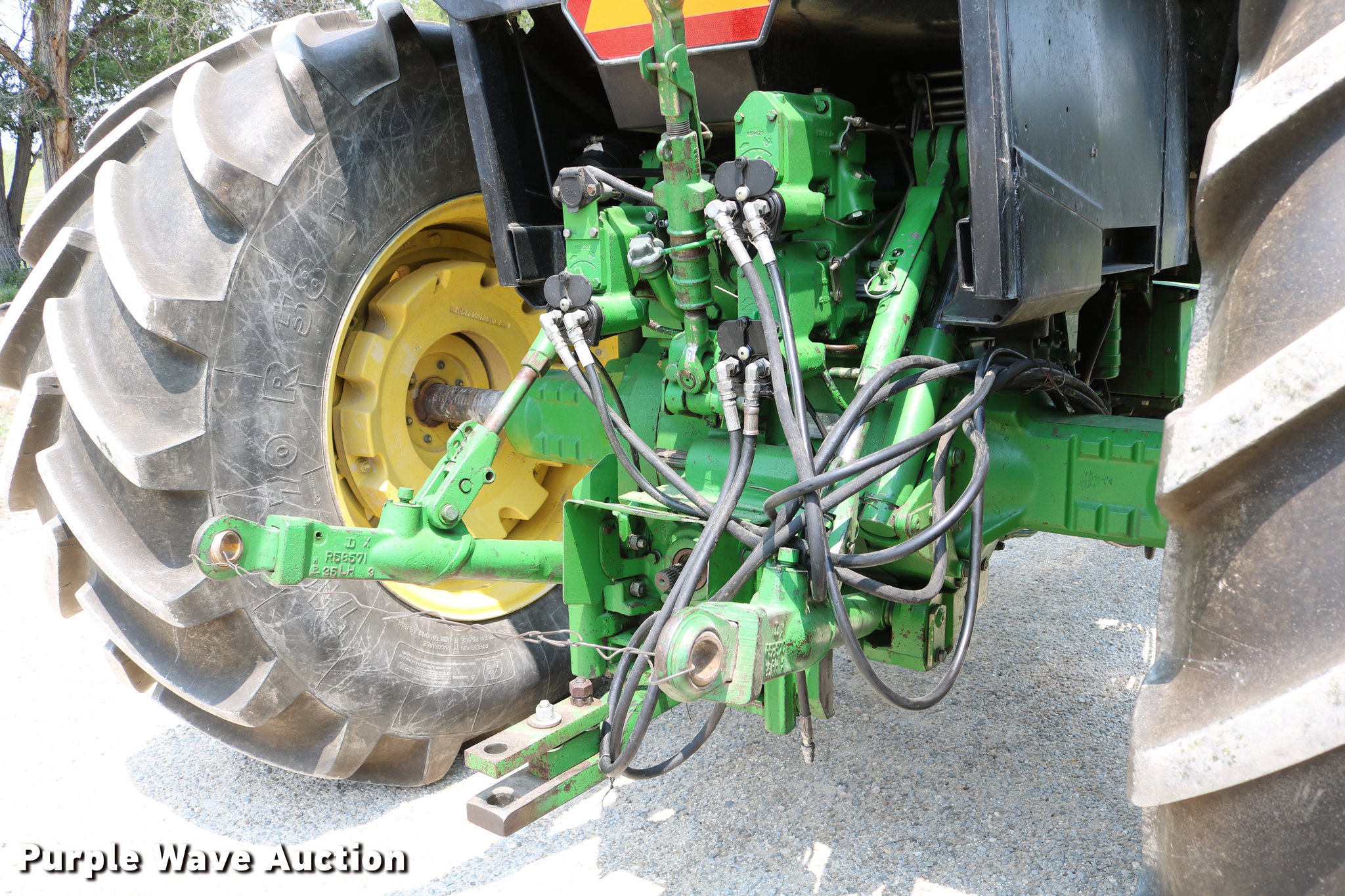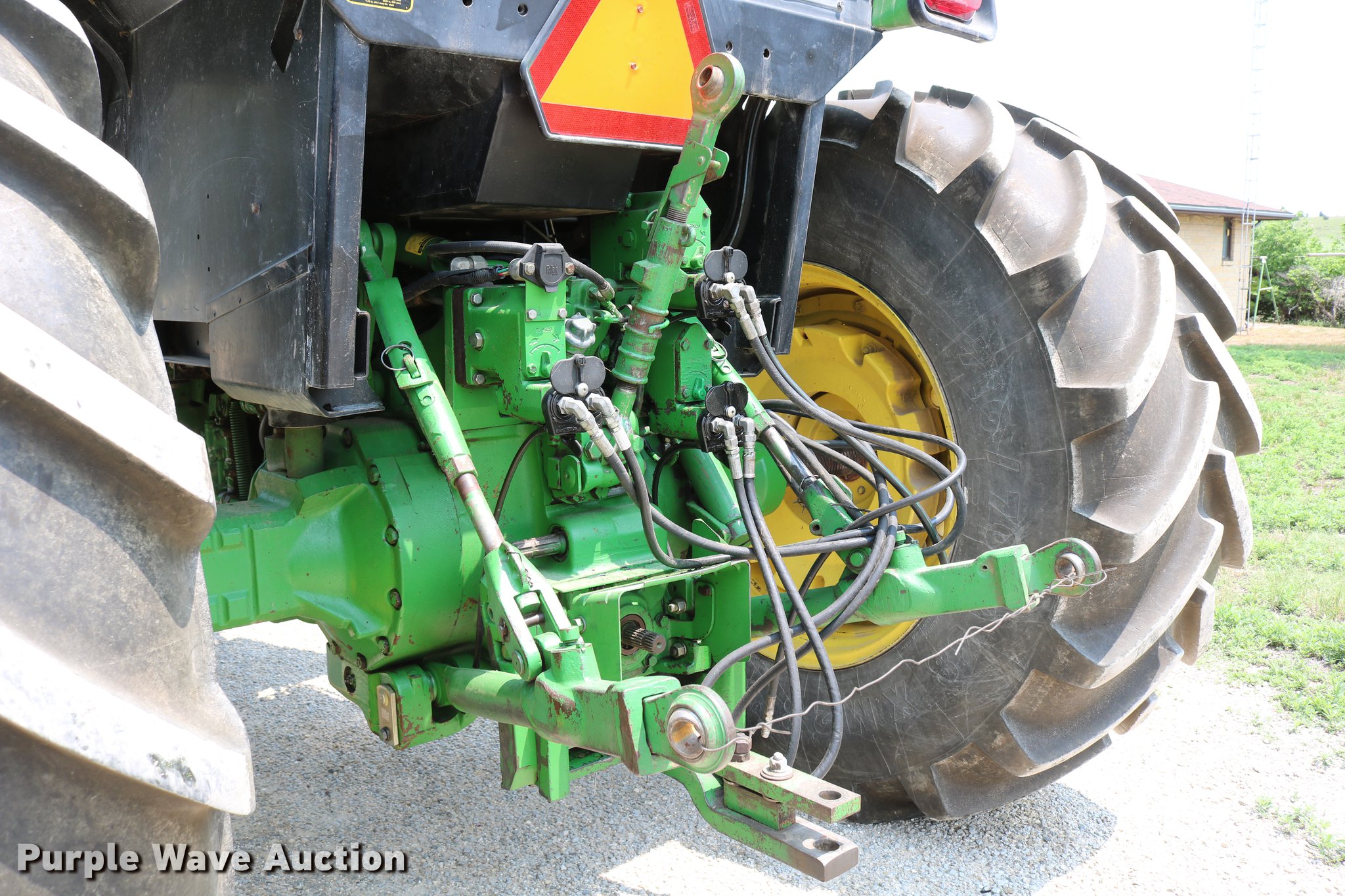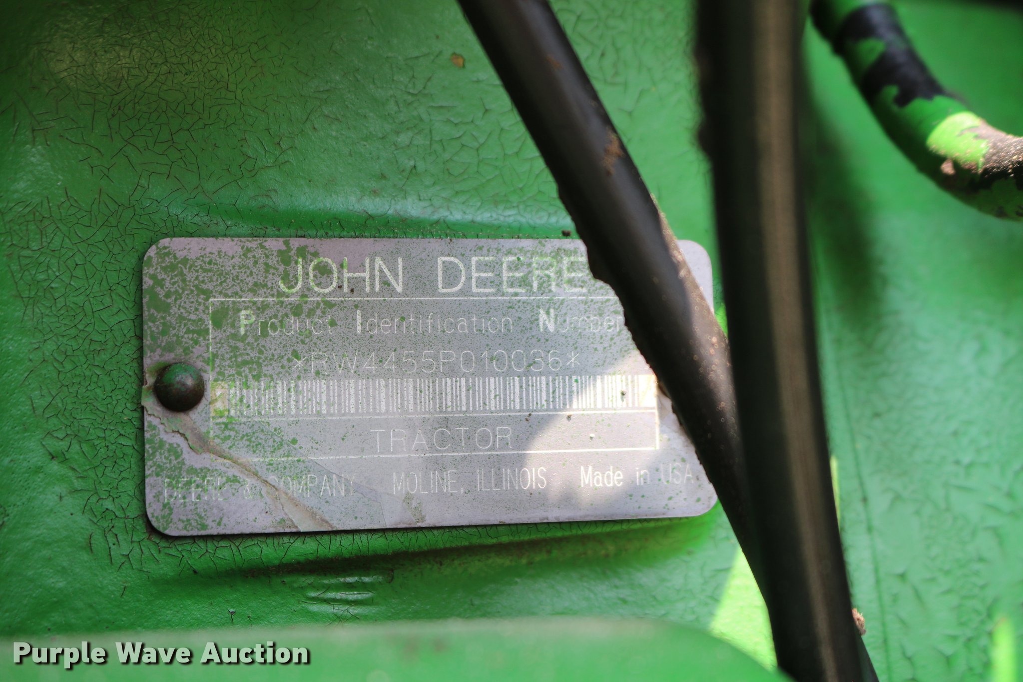 Purple Wave is selling a used Tractor in Kansas. This item is a 1991 John Deere 4455 tractor with the following: 9,449 hours on meter, 7.6L six cylinder turbo diesel engine, Powershift transmission, 15F-4R gears, Differential lock, AC and heat, Tilt steering wheel, AM/FM, Hydraulic seat, John Deere 280 loader, 97"W grapple bucket, (4) tines, Quick attach, Two-lever controls, Three point, Top link, Seven pin outlet, 540/1000 PTO, (3) rear hydraulic remote sets, (2) wheel weights, 106.7" wheelbase, Michelin 710/70R38 front tires, Michelin 11.2R24 rear tires, (2) additional 16.0/70-20 tires, One is bad, (4) additional 18.4R38 tires, (2) additional 11.00-16SL tires, Engine overhauled 05/2005, Serial RW4455P010036