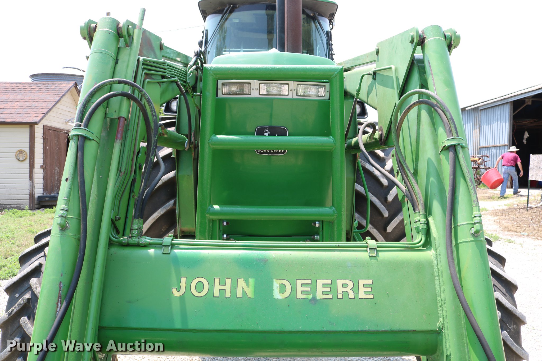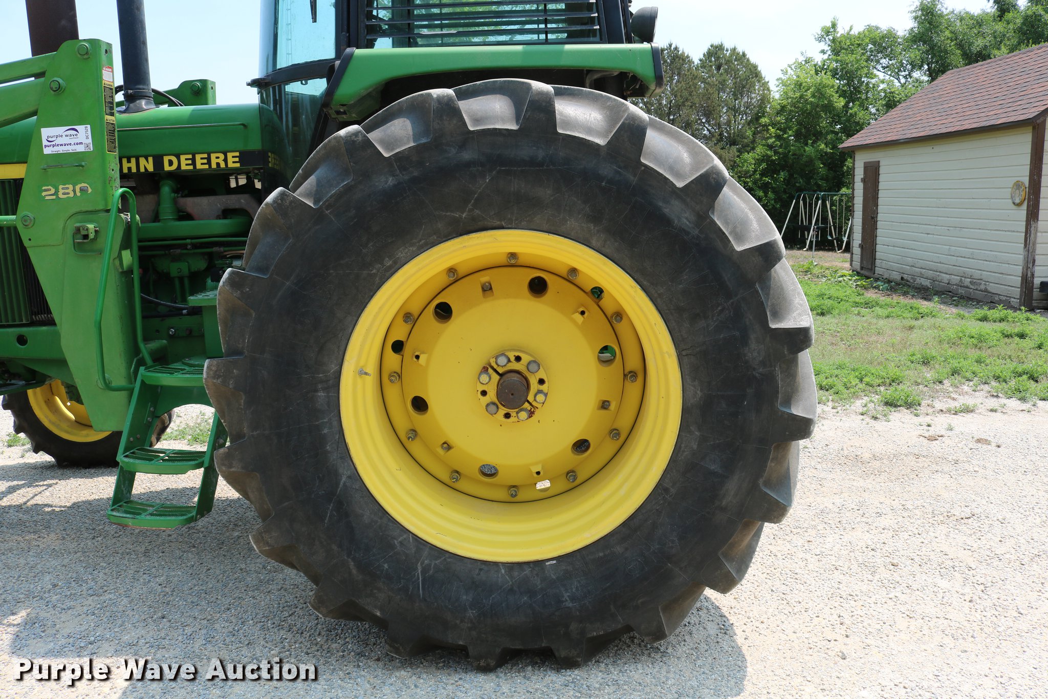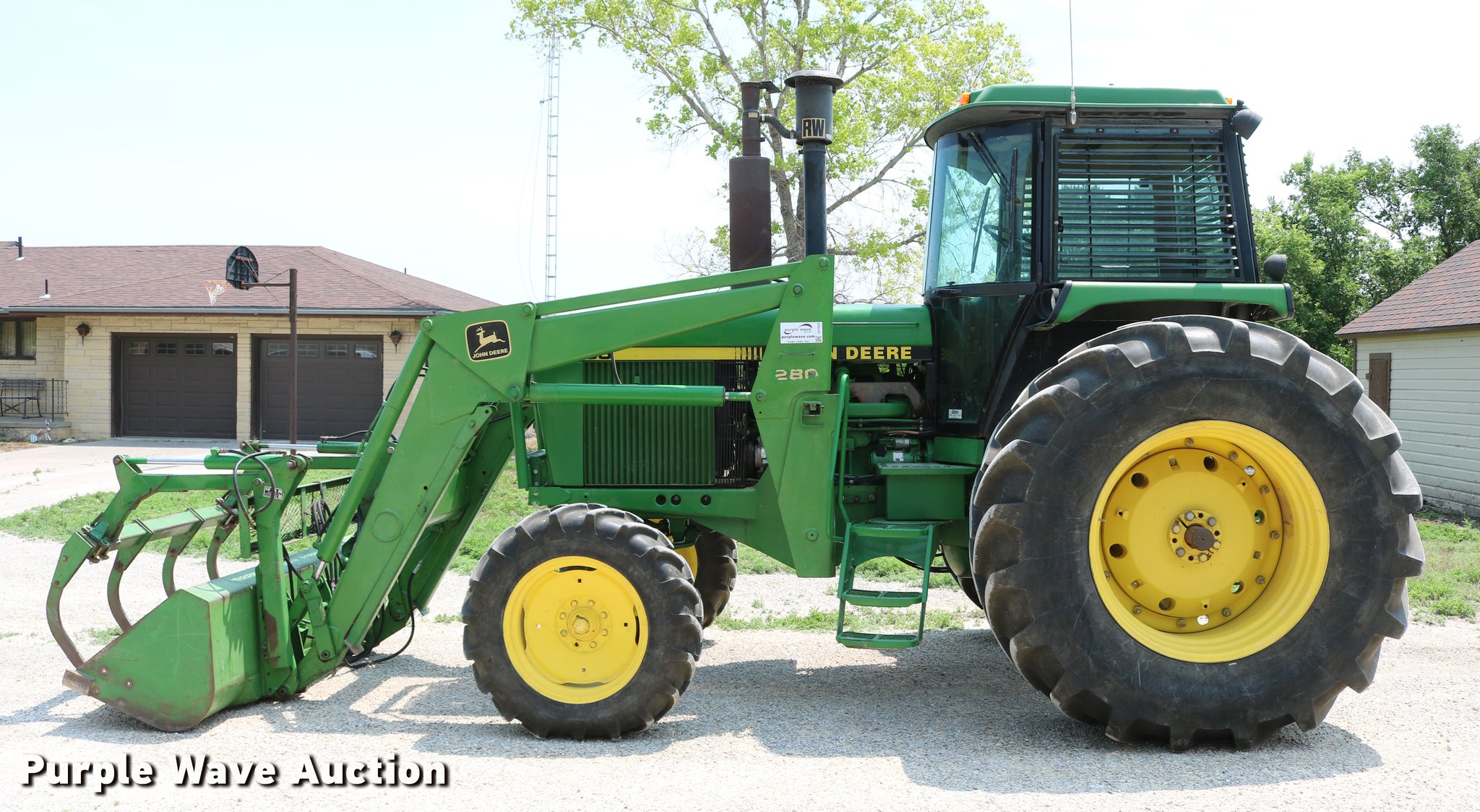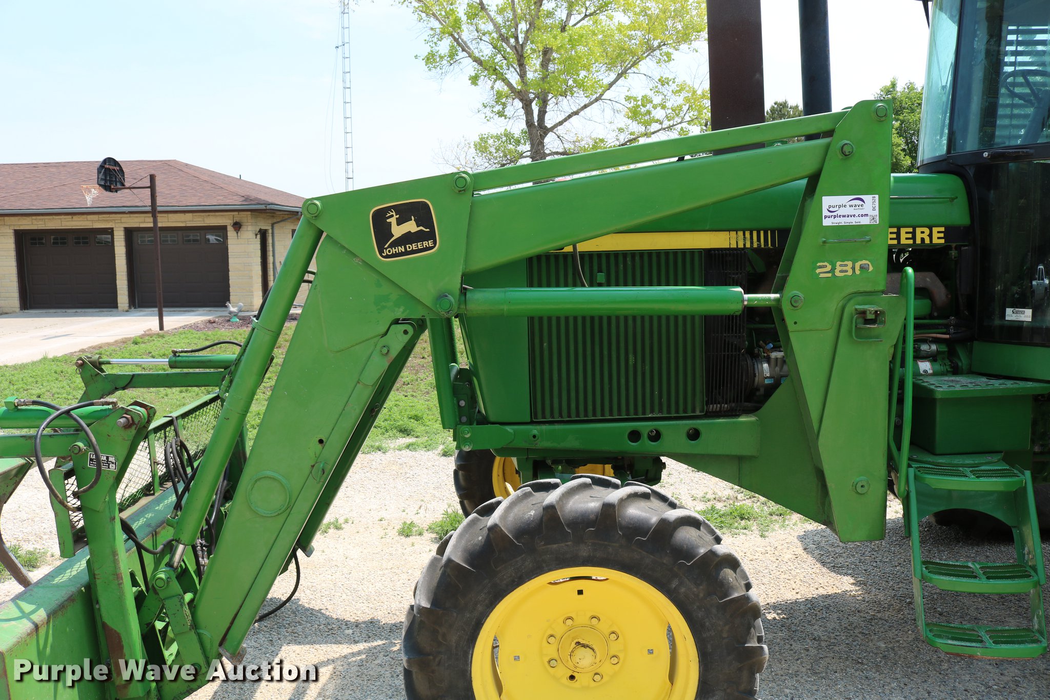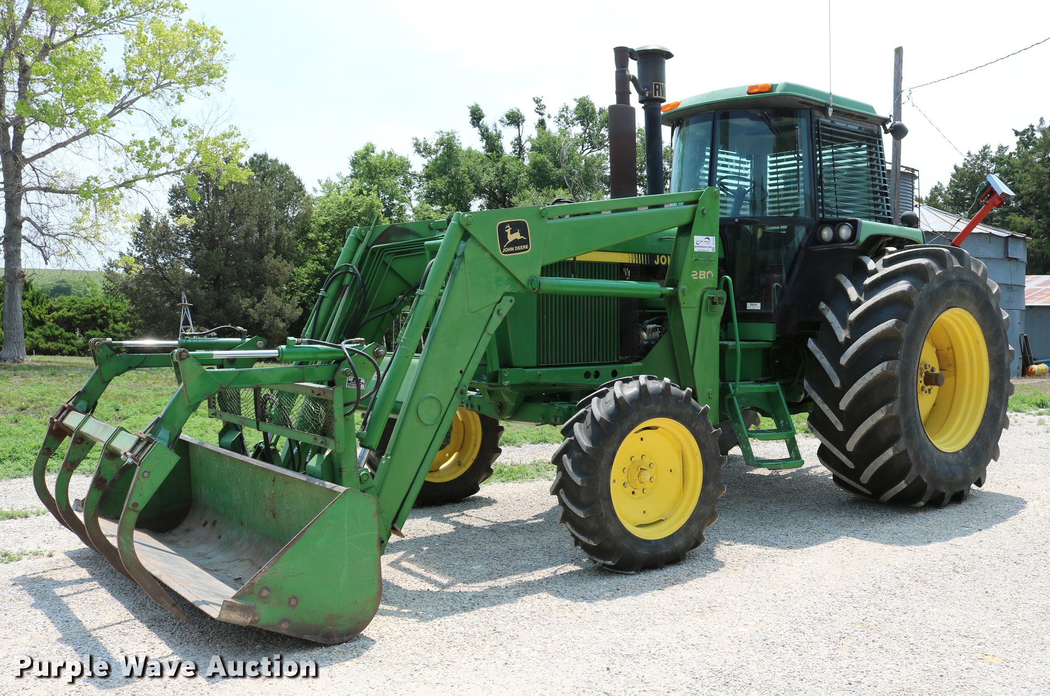 Purple Wave is selling a used Tractor in Kansas. This item is a 1991 John Deere 4455 tractor with the following: 9,449 hours on meter, 7.6L six cylinder turbo diesel engine, Powershift transmission, 15F-4R gears, Differential lock, AC and heat, Tilt steering wheel, AM/FM, Hydraulic seat, John Deere 280 loader, 97"W grapple bucket, (4) tines, Quick attach, Two-lever controls, Three point, Top link, Seven pin outlet, 540/1000 PTO, (3) rear hydraulic remote sets, (2) wheel weights, 106.7" wheelbase, Michelin 710/70R38 front tires, Michelin 11.2R24 rear tires, (2) additional 16.0/70-20 tires, One is bad, (4) additional 18.4R38 tires, (2) additional 11.00-16SL tires, Engine overhauled 05/2005, Serial RW4455P010036