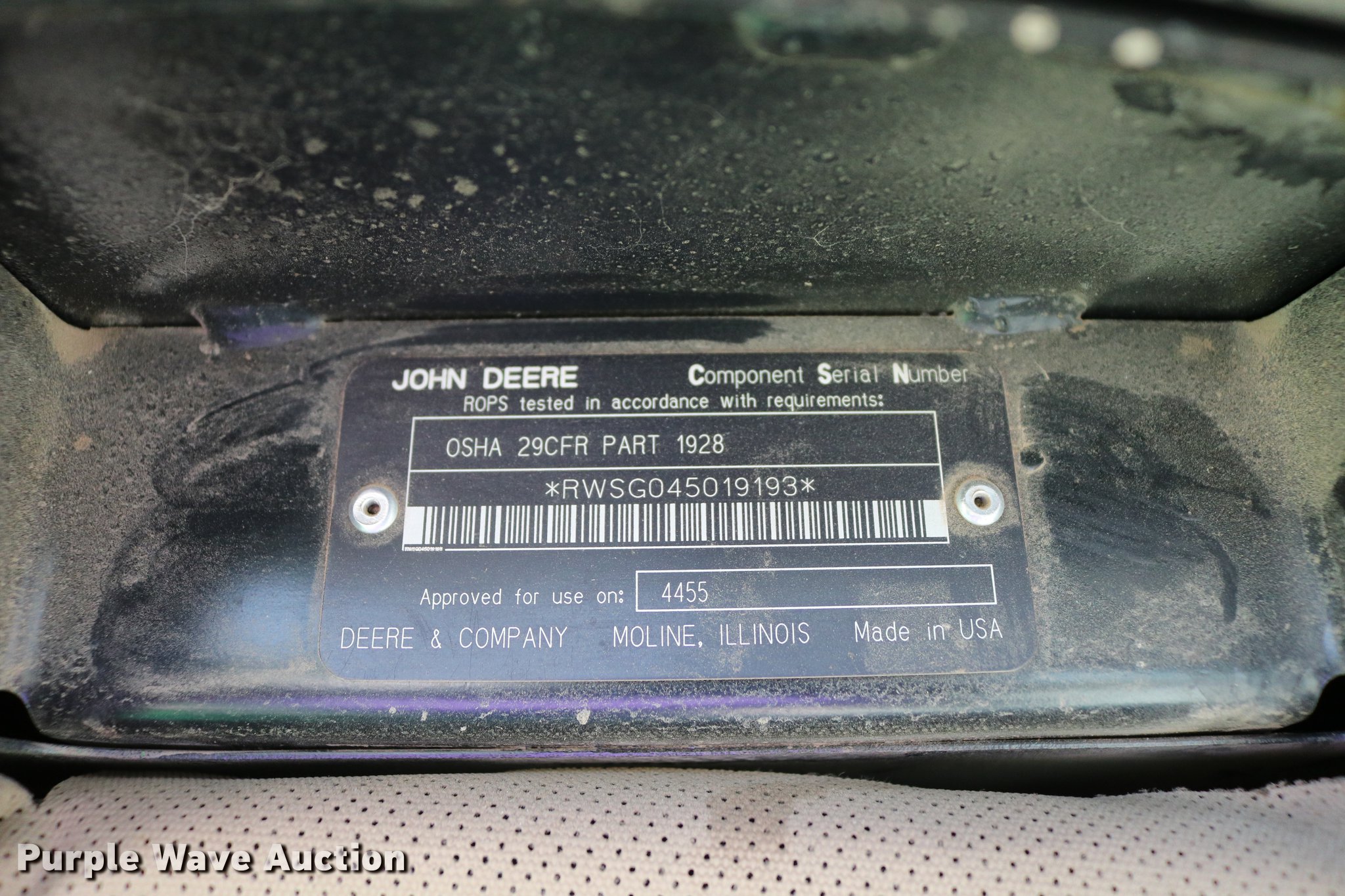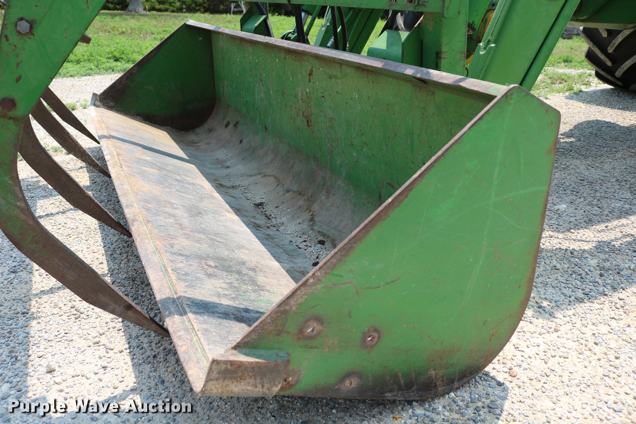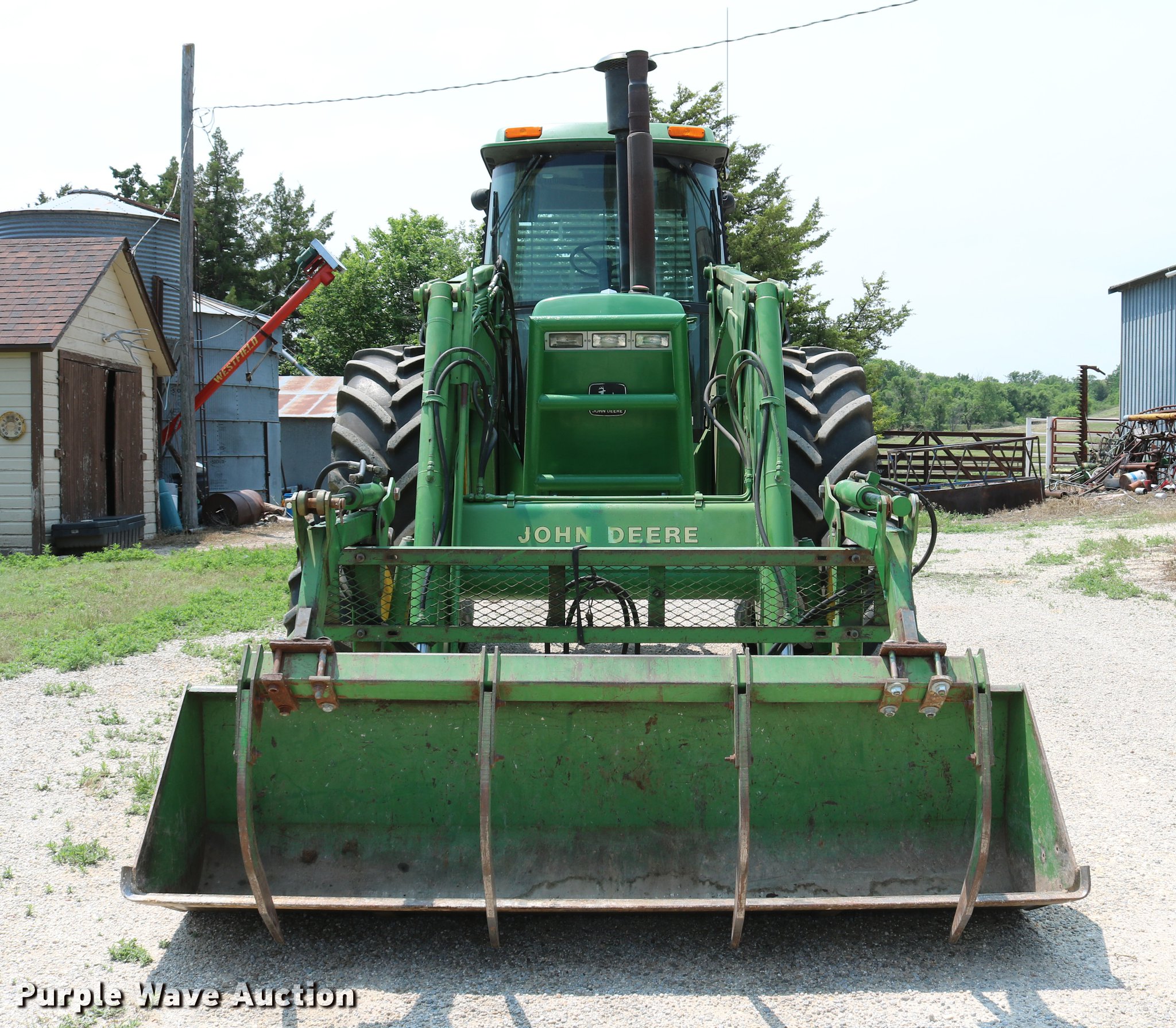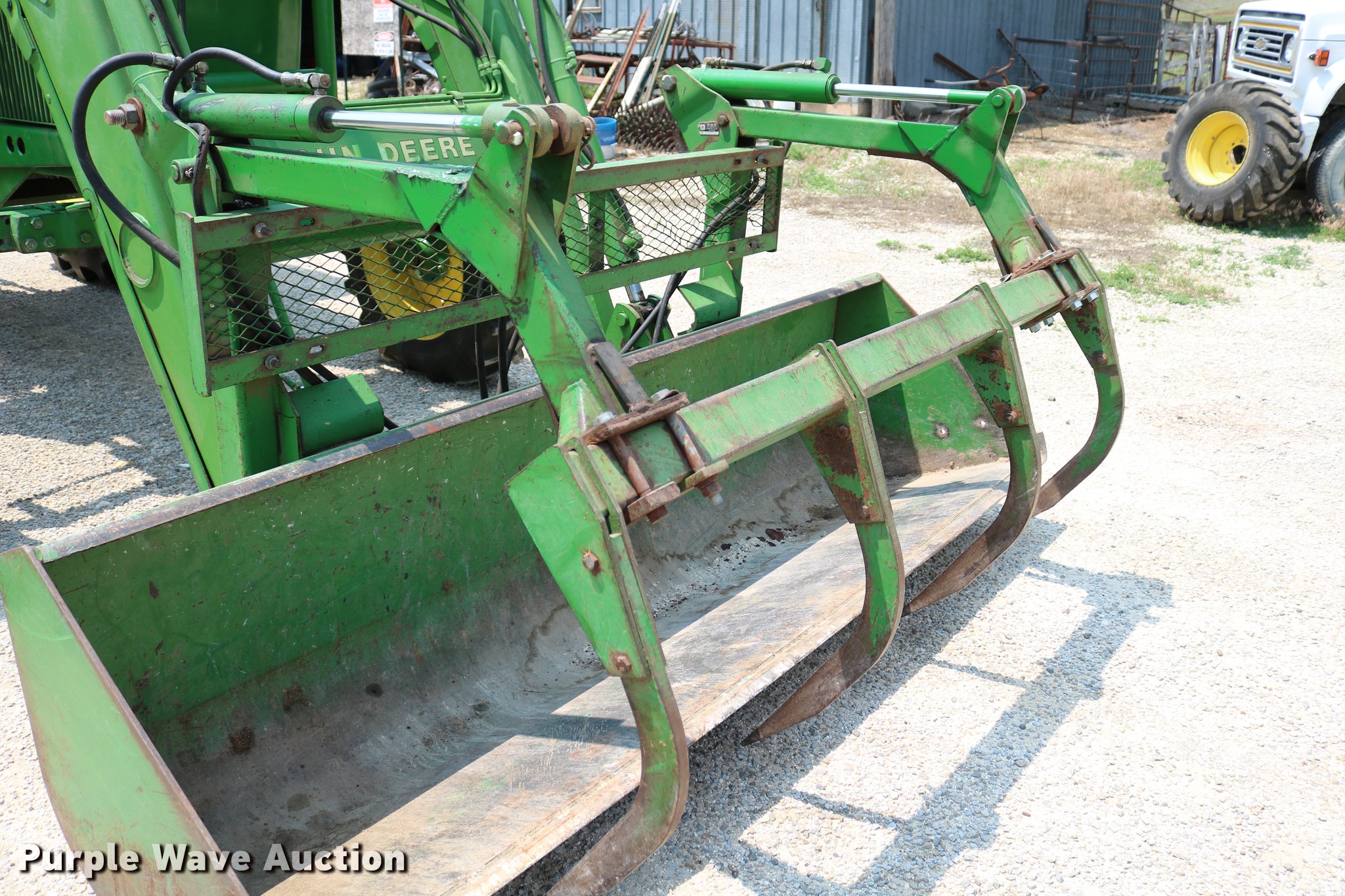 Purple Wave is selling a used Tractor in Kansas. This item is a 1991 John Deere 4455 tractor with the following: 9,449 hours on meter, 7.6L six cylinder turbo diesel engine, Powershift transmission, 15F-4R gears, Differential lock, AC and heat, Tilt steering wheel, AM/FM, Hydraulic seat, John Deere 280 loader, 97"W grapple bucket, (4) tines, Quick attach, Two-lever controls, Three point, Top link, Seven pin outlet, 540/1000 PTO, (3) rear hydraulic remote sets, (2) wheel weights, 106.7" wheelbase, Michelin 710/70R38 front tires, Michelin 11.2R24 rear tires, (2) additional 16.0/70-20 tires, One is bad, (4) additional 18.4R38 tires, (2) additional 11.00-16SL tires, Engine overhauled 05/2005, Serial RW4455P010036