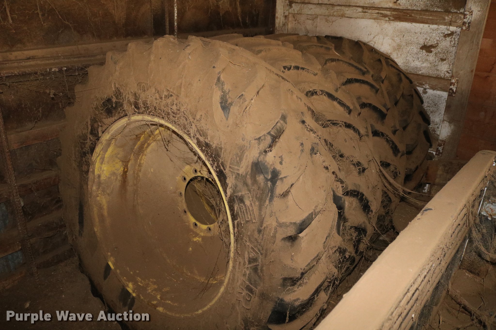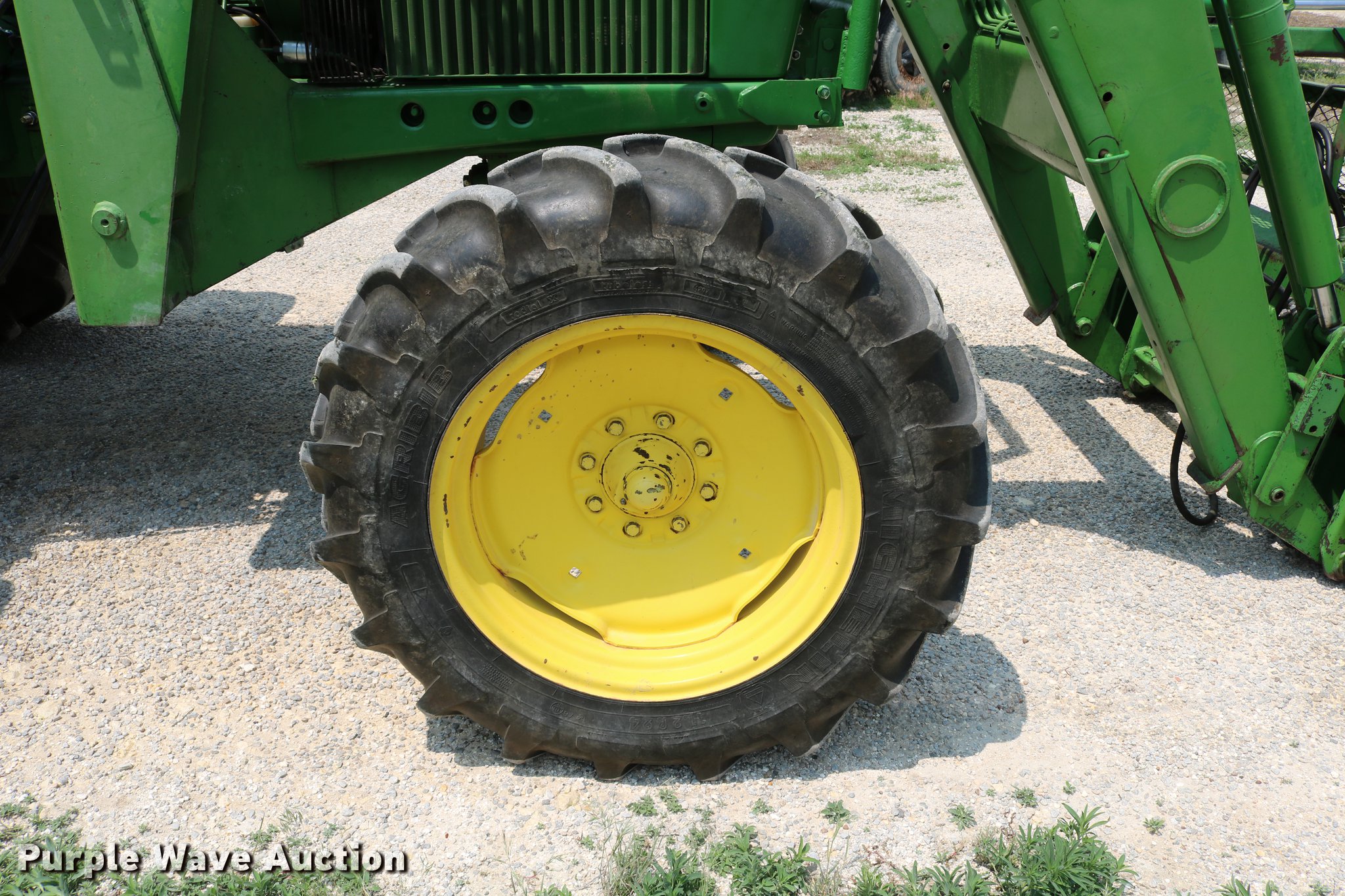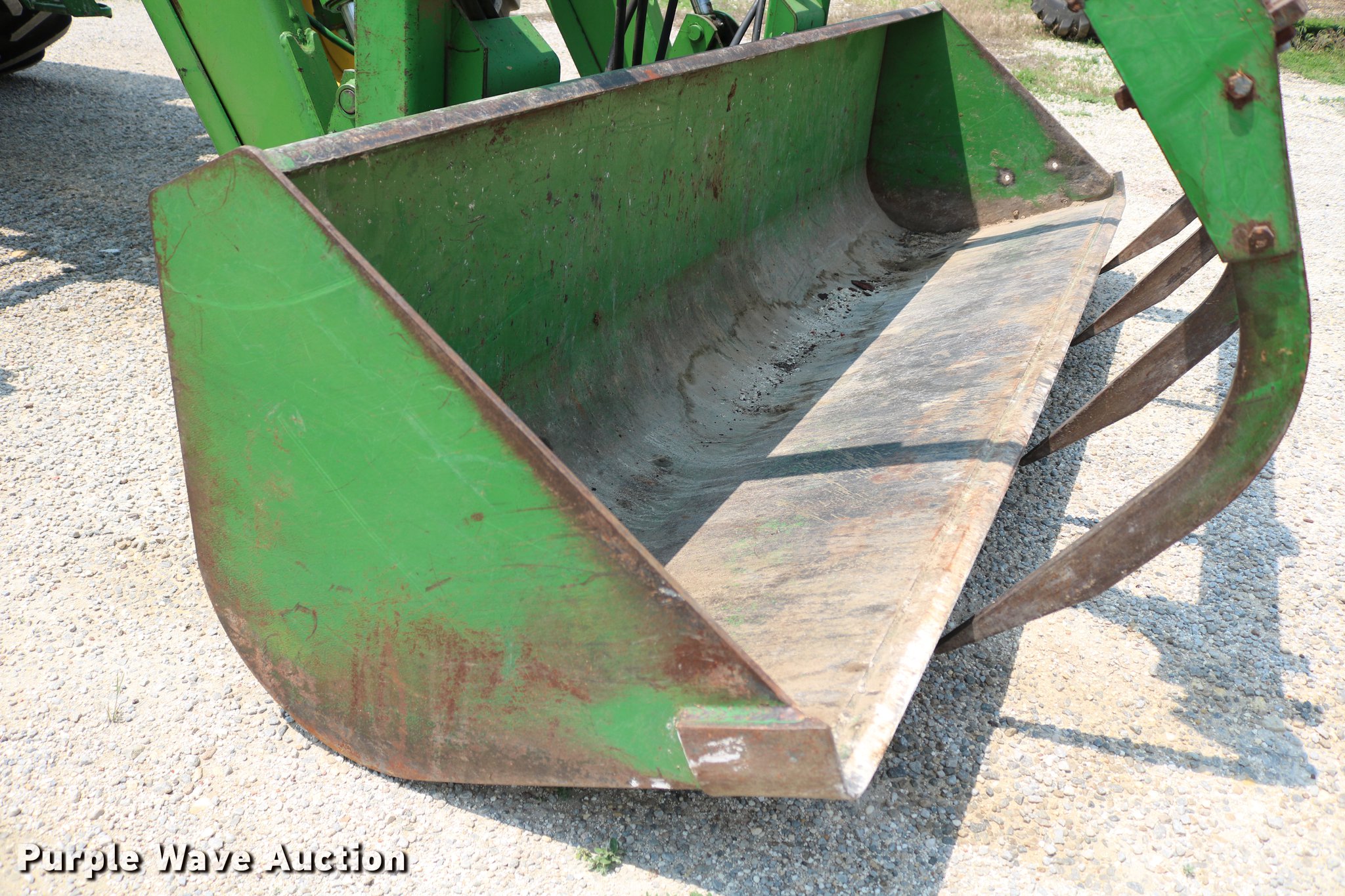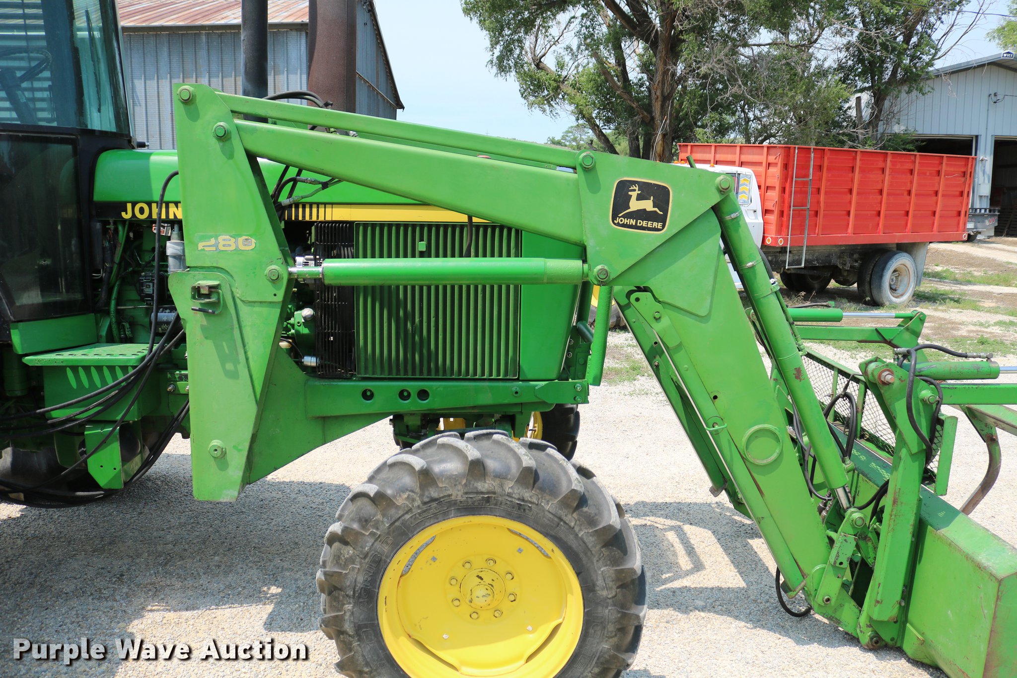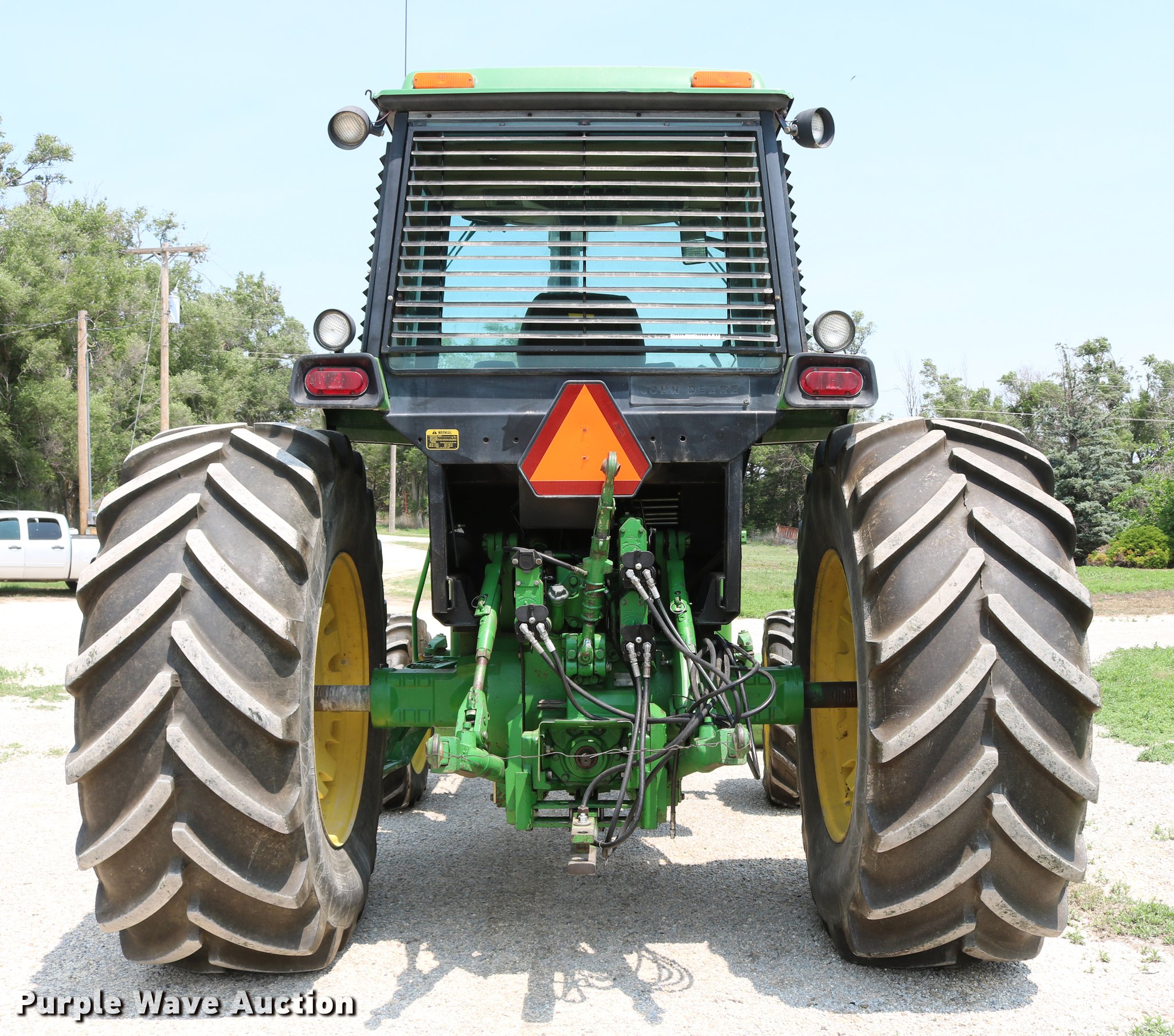 Purple Wave is selling a used Tractor in Kansas. This item is a 1991 John Deere 4455 tractor with the following: 9,449 hours on meter, 7.6L six cylinder turbo diesel engine, Powershift transmission, 15F-4R gears, Differential lock, AC and heat, Tilt steering wheel, AM/FM, Hydraulic seat, John Deere 280 loader, 97"W grapple bucket, (4) tines, Quick attach, Two-lever controls, Three point, Top link, Seven pin outlet, 540/1000 PTO, (3) rear hydraulic remote sets, (2) wheel weights, 106.7" wheelbase, Michelin 710/70R38 front tires, Michelin 11.2R24 rear tires, (2) additional 16.0/70-20 tires, One is bad, (4) additional 18.4R38 tires, (2) additional 11.00-16SL tires, Engine overhauled 05/2005, Serial RW4455P010036